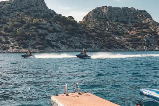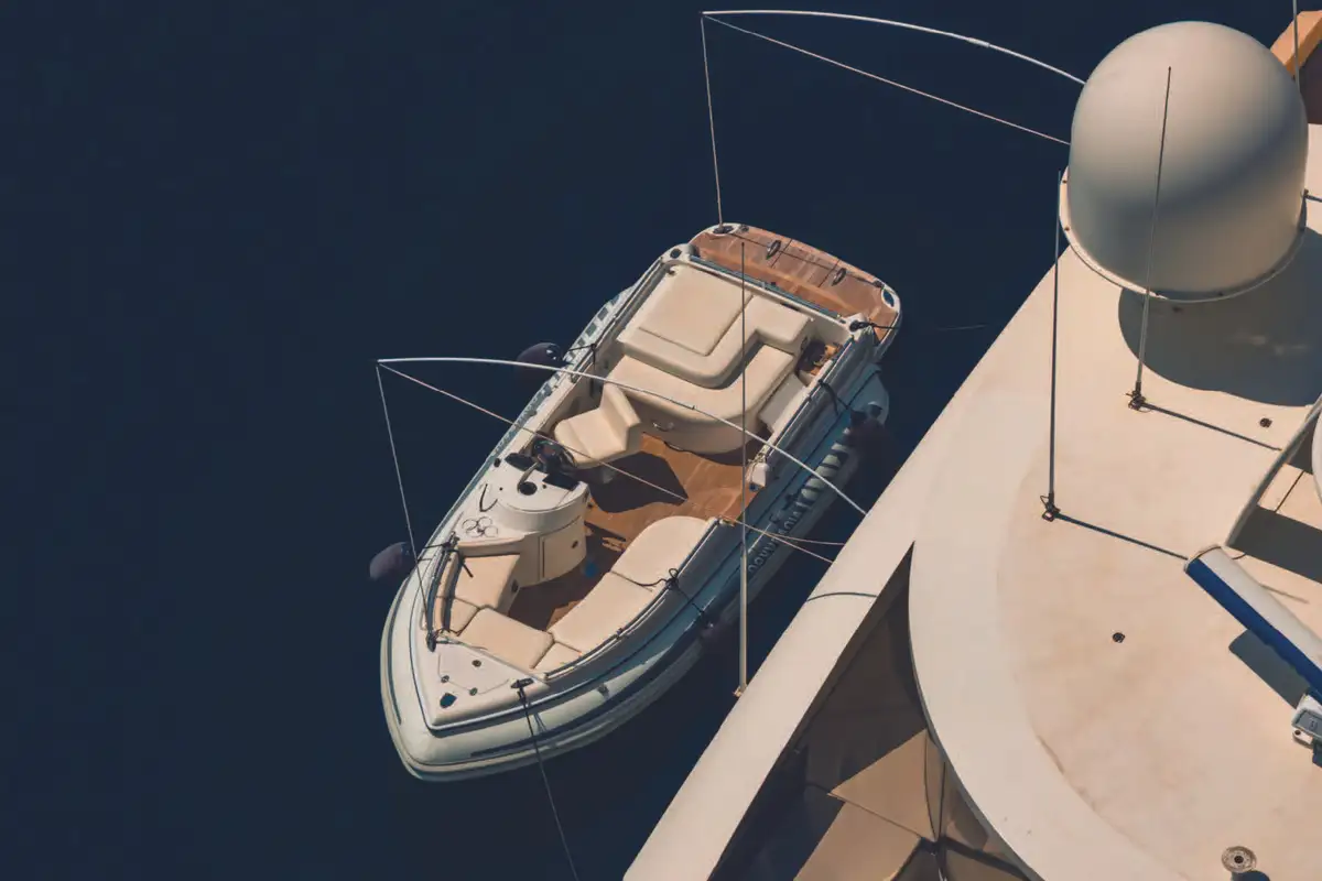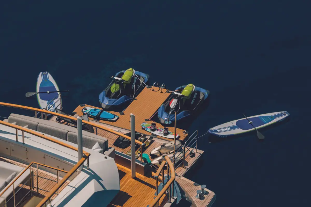At anchor the transom drops down to reveal the beach club and all the watertoys. Maybe take a spin on a Sea-Doo or SeaBob. The Novurania Equator EQR 600 comes out to take a party ashore to explore the shops and cafes.