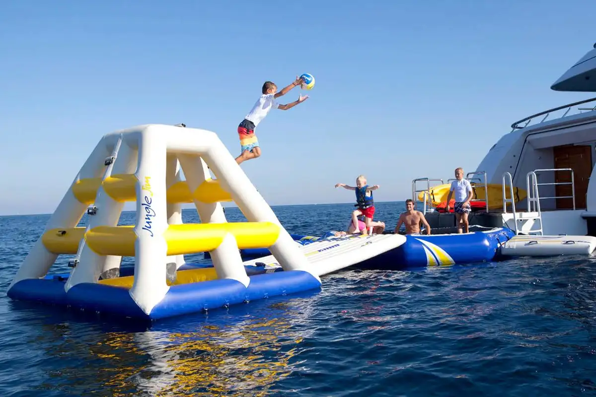 Wellness is becoming one of the key themes on the charter scene, and LADY BRITT is superbly well equipped in this area. All guests stepping aboard will be able to recharge both mind and body during their yacht charter. Exercise in the sun deck gym, detox in the waterside Finnish sauna, dive into the refreshing waters from the opening platform and then regenerate the senses with a hot stone massage in the spa from LADY BRITT’s Elemis-trained spa therapist. Those looking for an adrenaline hit can take to the water via the 10m waterslide, or embrace their inner-child messing around on the inflatable aquapark.