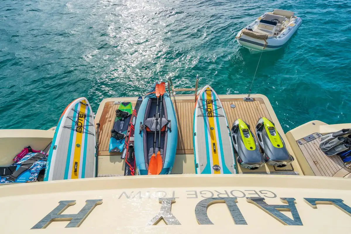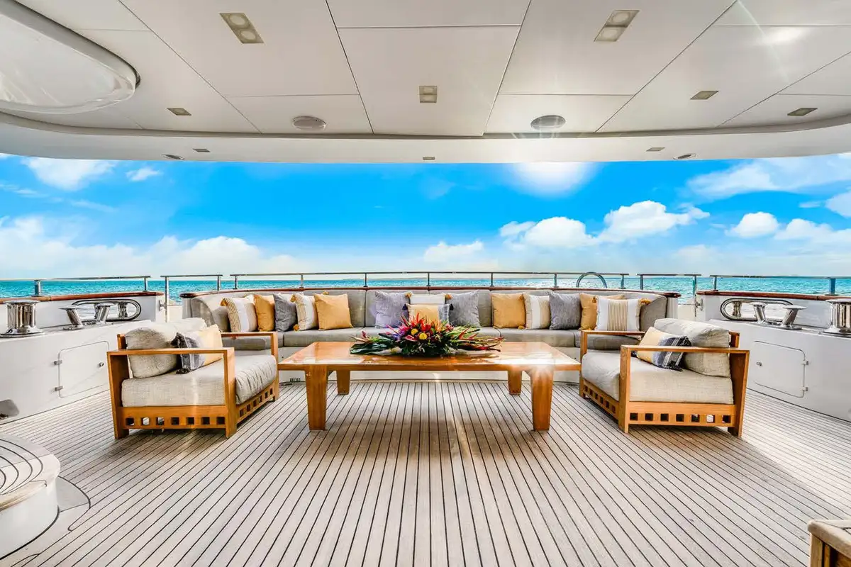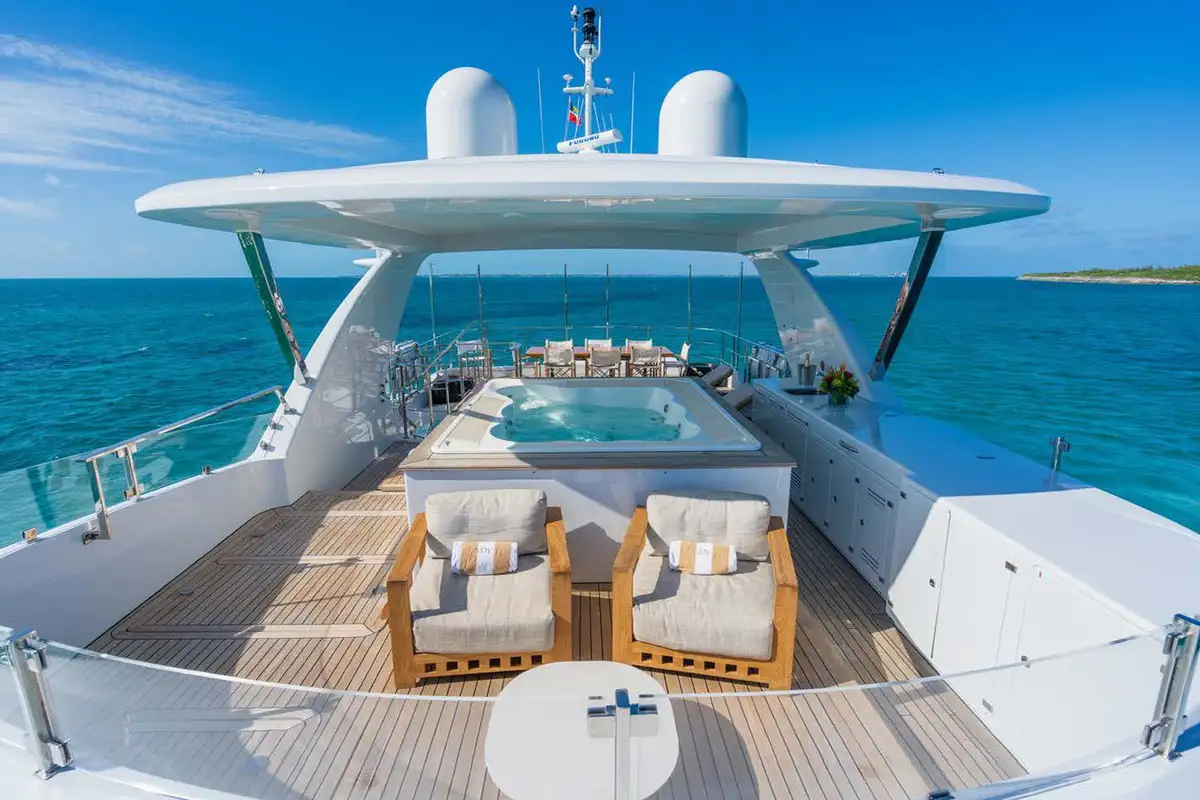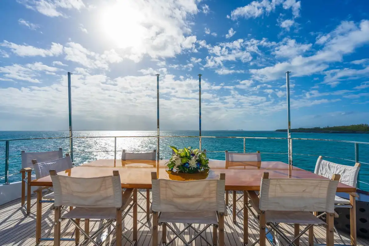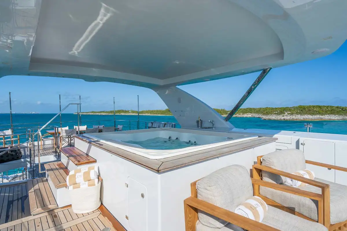 The bright and open salon and sky lounge are perfect for lounging and mingling with family and friends, offering splendid ocean vistas and plush seating arrangements. Whilst the beautiful dining area features a large table for an elegant dinner destination. For the fitness enthusiasts, LADY H's air-conditioned gym is a haven for health and wellness. Complete with weights, bands, and Peloton, the gym is adjoined by a full powder room featuring a large steam shower, a welcome respite for those looking to unwind and de-stress. LADY H's expansive deck spaces are a haven for relaxation and indulgence. The sun deck features a large Jacuzzi and loungers perfect for basking under the warm rays of the sun. Enjoy fine dining experiences on the Bridge deck aft, featuring a shaded long dining table and ample seating arrangements. This is the perfect location for fabulous al-fresco meals, providing an idyllic setting for a blissful culinary adventure.