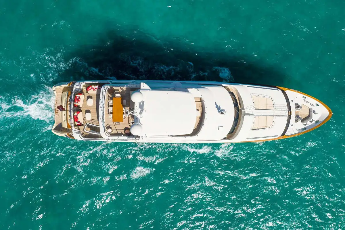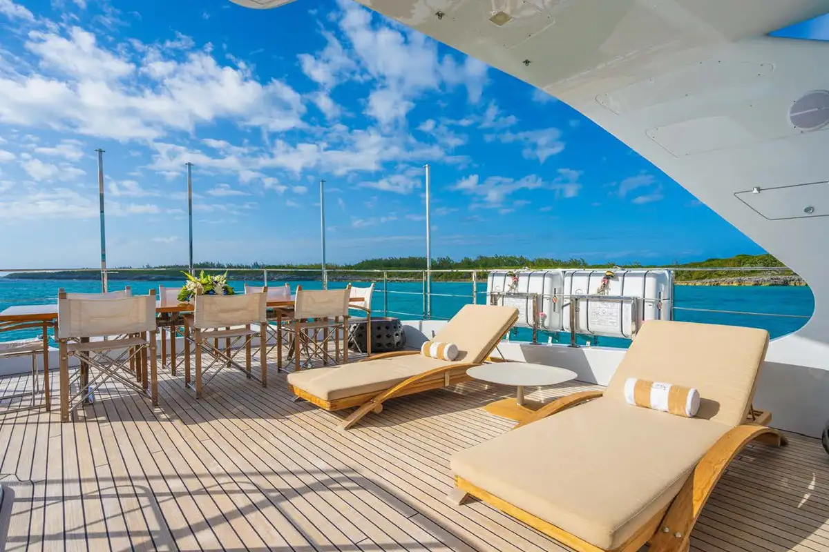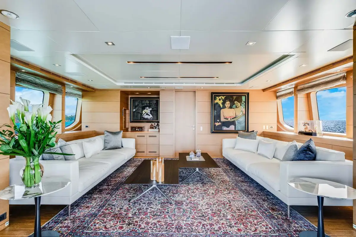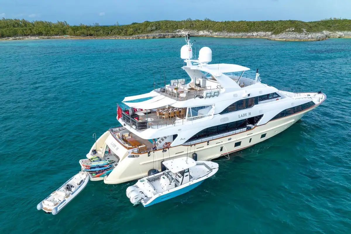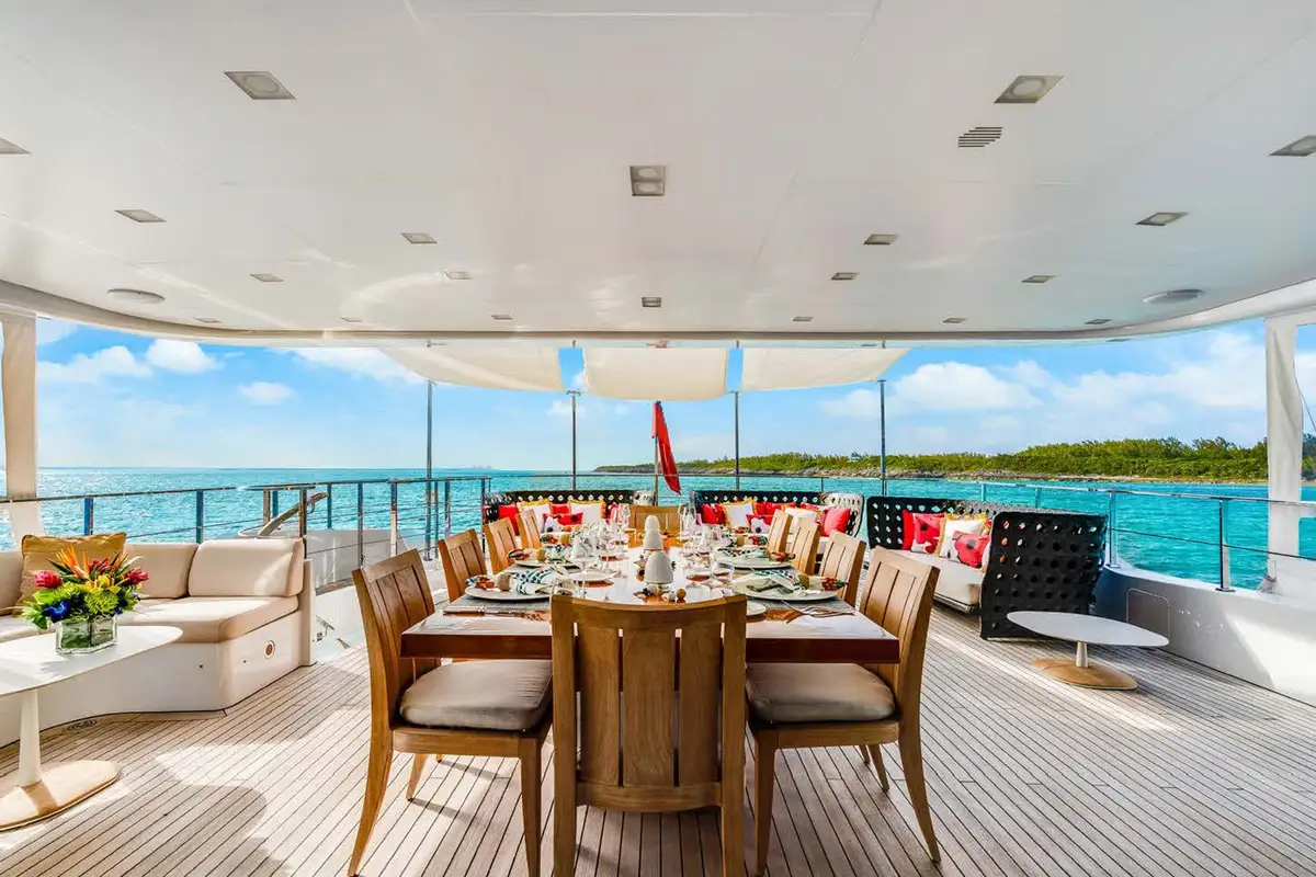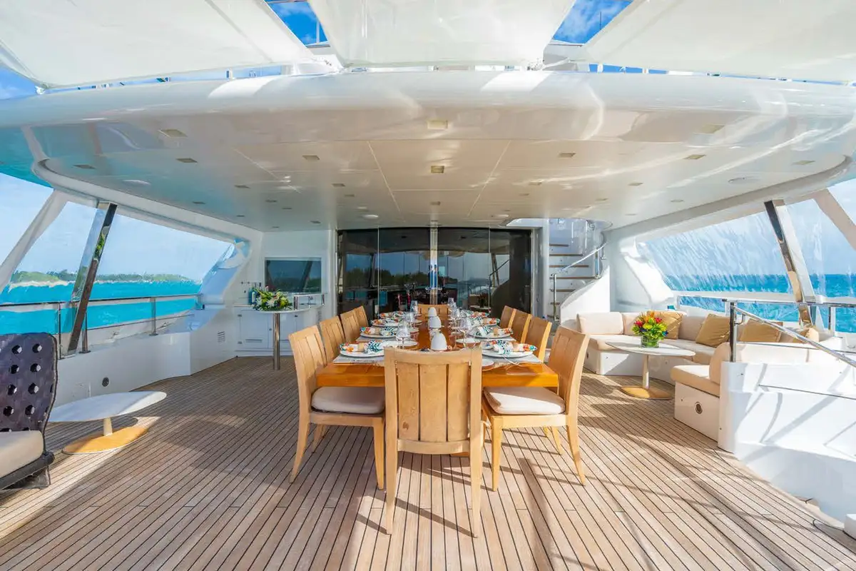 The bright and open salon and sky lounge are perfect for lounging and mingling with family and friends, offering splendid ocean vistas and plush seating arrangements. Whilst the beautiful dining area features a large table for an elegant dinner destination. For the fitness enthusiasts, LADY H's air-conditioned gym is a haven for health and wellness. Complete with weights, bands, and Peloton, the gym is adjoined by a full powder room featuring a large steam shower, a welcome respite for those looking to unwind and de-stress. LADY H's expansive deck spaces are a haven for relaxation and indulgence. The sun deck features a large Jacuzzi and loungers perfect for basking under the warm rays of the sun. Enjoy fine dining experiences on the Bridge deck aft, featuring a shaded long dining table and ample seating arrangements. This is the perfect location for fabulous al-fresco meals, providing an idyllic setting for a blissful culinary adventure.
