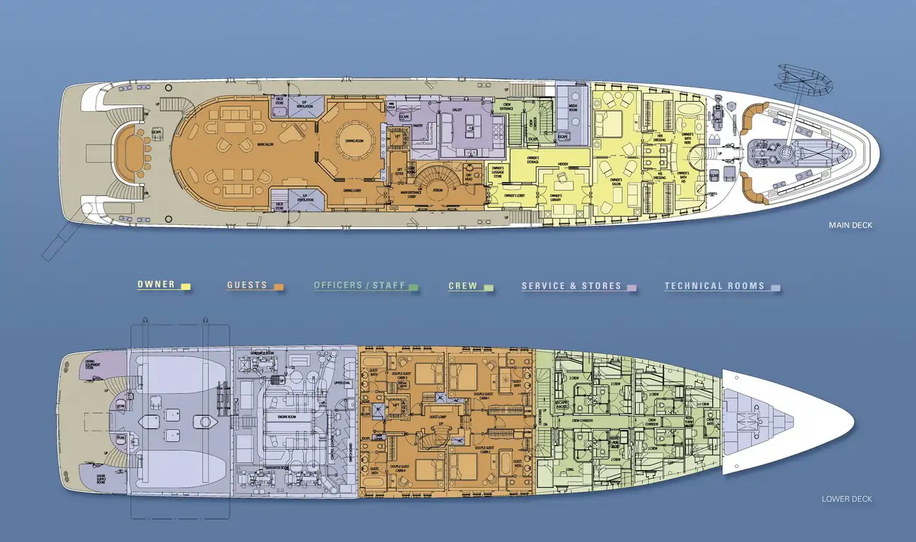 LADY KATHRYN V accommodates up to 12 guests across her master suite, VIP suite and four double cabins, with an elevator and zero speed stabilisers adding to the comfort on board. The master suite has a fold-down outdoor terrace, two walk in wardrobes, a private lounge and library, and a decadent marble his and hers bathroom.