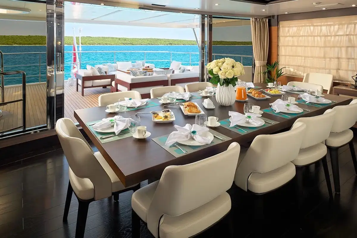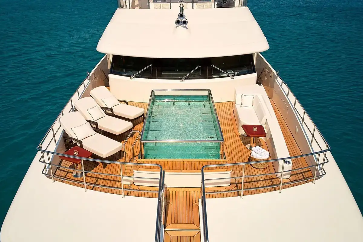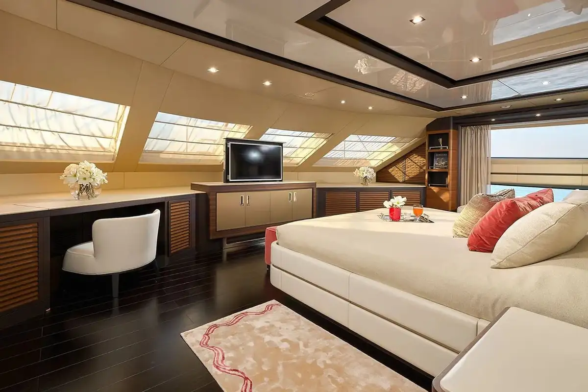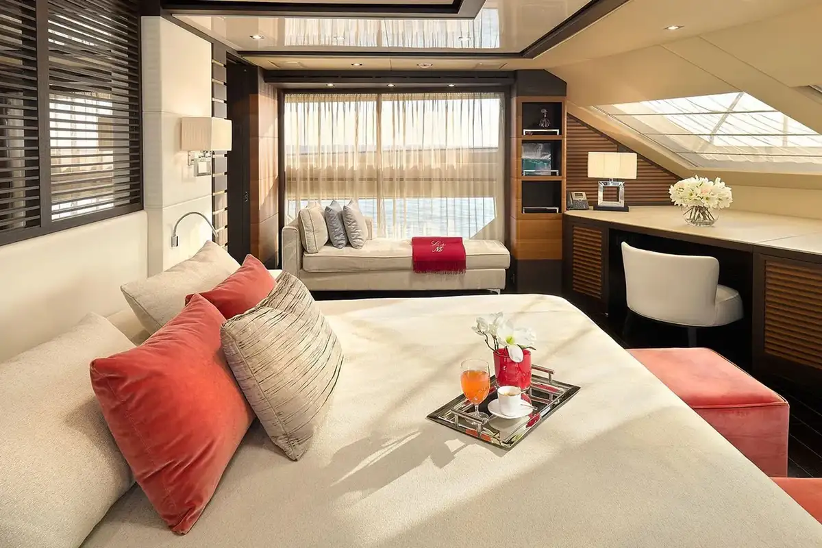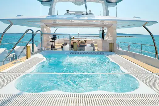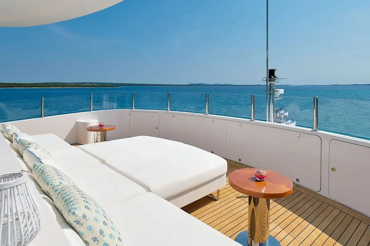 She has huge floor-to-ceiling plate glass windows in her topsides, with panels that slide open and cutaway bulwarks designed to give unobstructed views from her main saloon and skylounge, while letting in a lot more natural light. Combined with welcoming, soothing interior design by the esteemed Zuretti studio, the result is an immensely bright and vibrant living space on both levels that feels like an extension of the seascape outside while also being a relaxing, secluded haven for your private enjoyment.