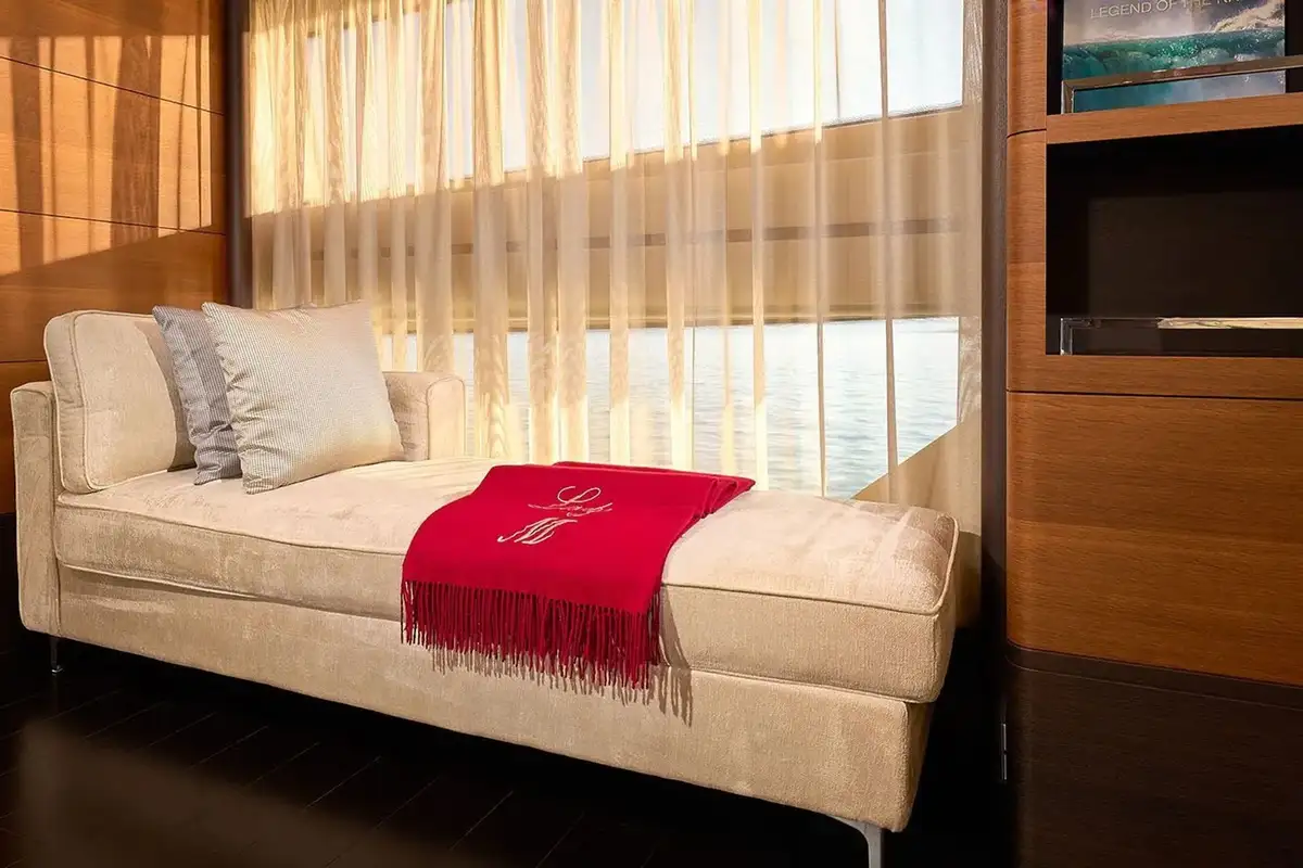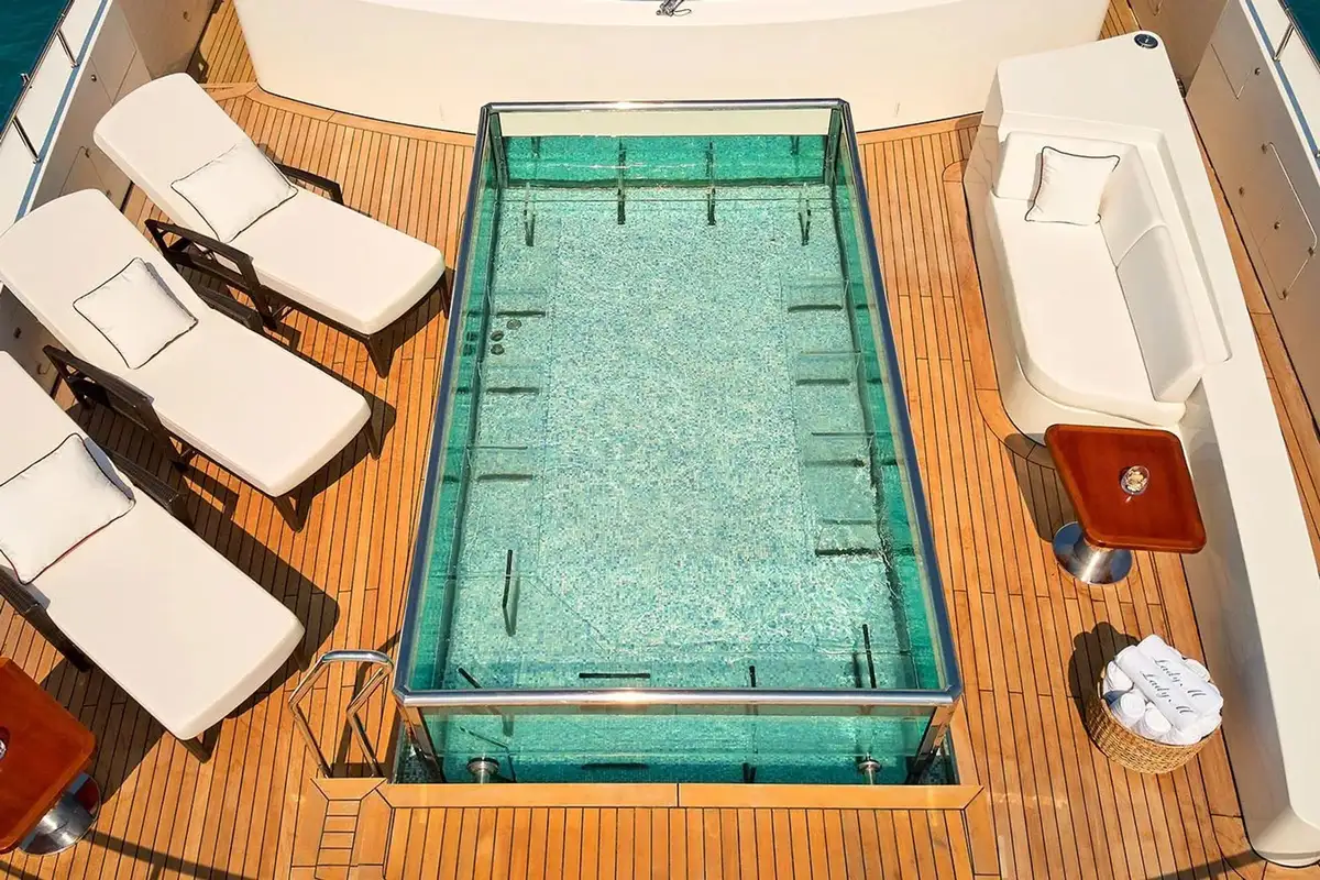 When the anchor goes down, the tender and toys come out. She’s got an six-metre (20ft) Williams jet RIB to whisk you to and from the beach or pull you around the bay on waterskis or inflatable tows. There are three SeaBob scooters and three paddleboards for waterborne fun as well as a high-powered jet ski. And for safe family bathing, with no fear of jellyfish stings, a seawater pool is deployed from her sea-level beach club. Dive in and enjoy!
