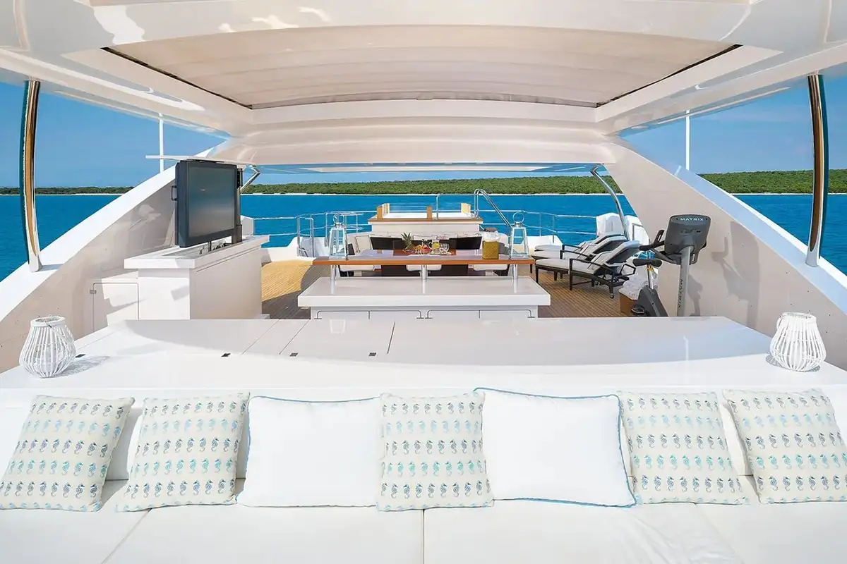 Then there’s the sundeck with another pool – this one’s a large square jacuzzi, facing aft – plus a lounge where you might watch a sports game on the big TV. There’s also an exercise bike for your morning workout, a bar for a breezy open-air breakfast or cocktails at sundown, and two separate seating / sunbathing areas at opposite ends of the deck. The other special feature up here is the convertible hardtop. Sun or shade? You get to choose.