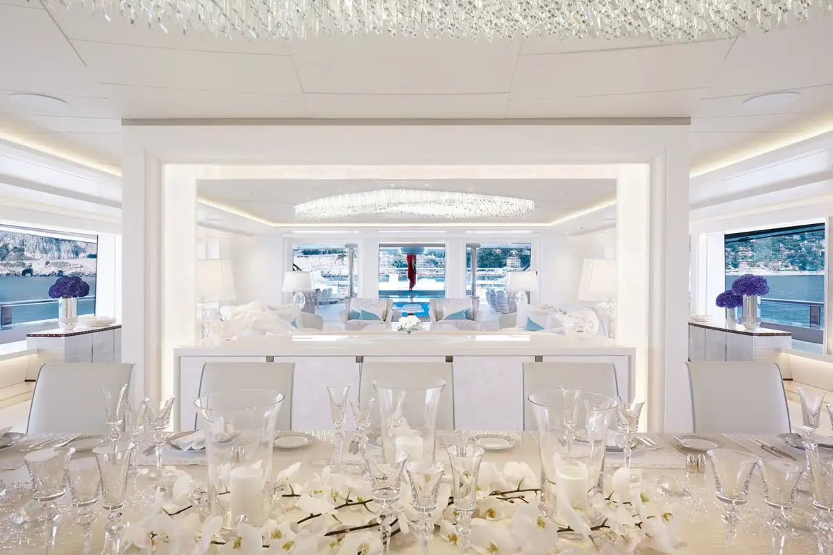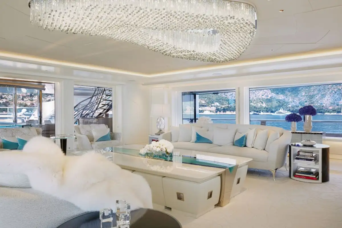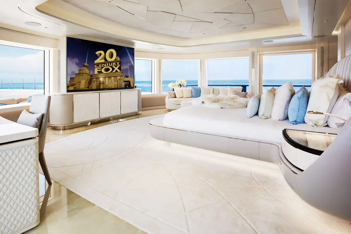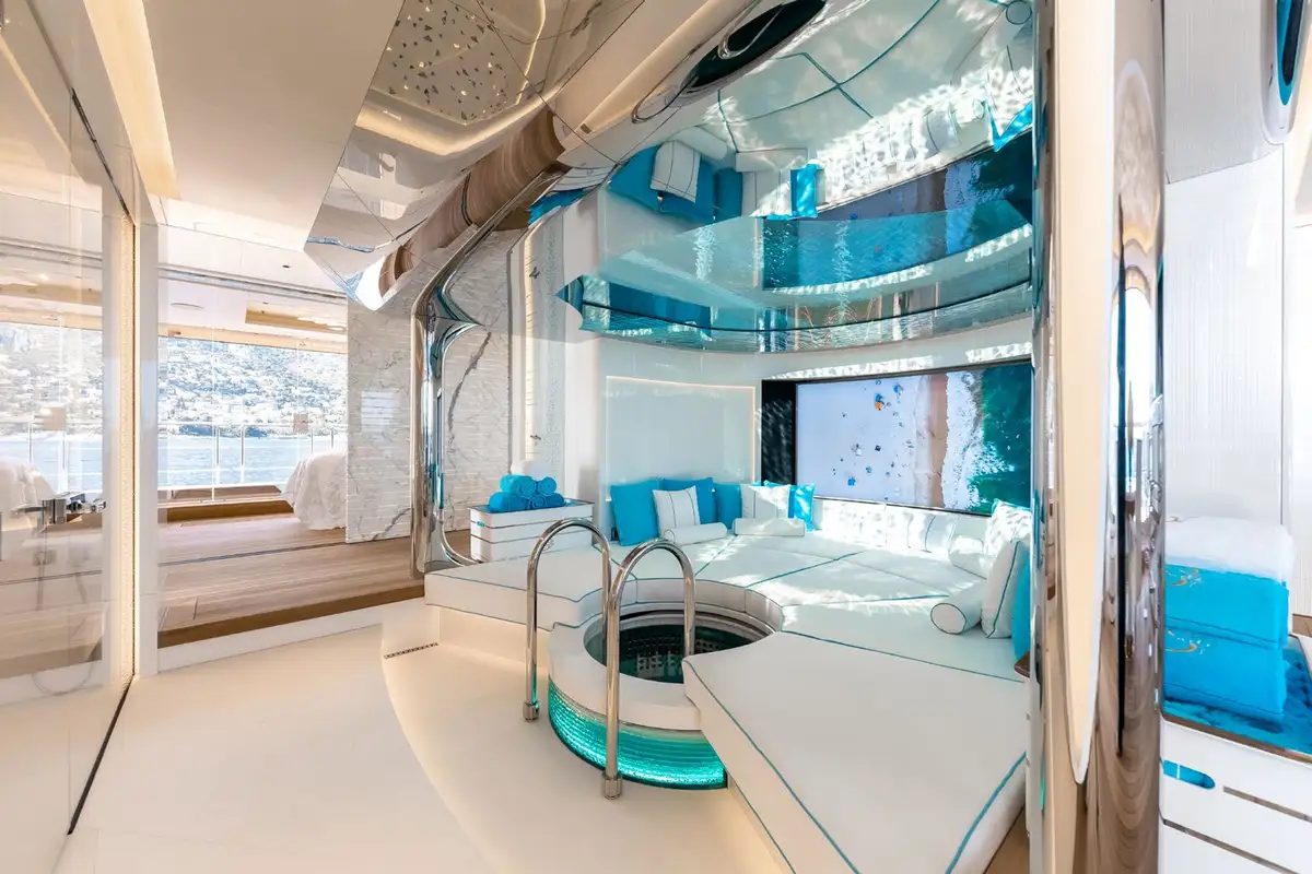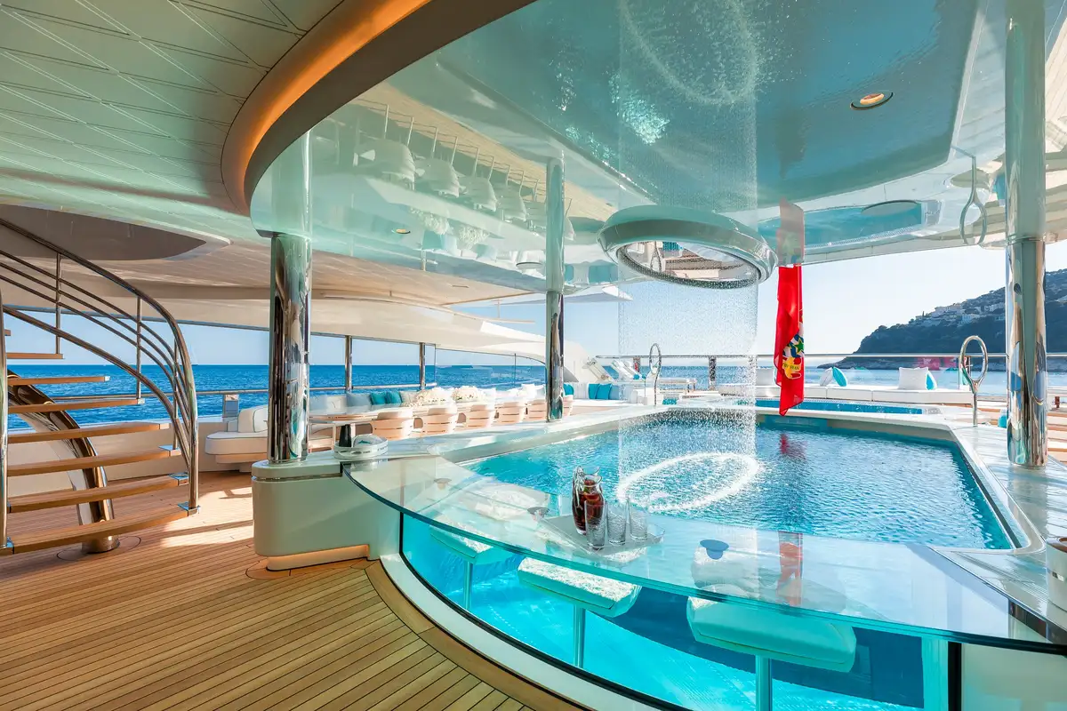 Her multiple special features include an IMAX Dolby cinema, nightclub, fully-certified helipad, a sophisticated beach club with hammam and plunge pool which sits beneath the glass-bottomed swimming pool.
