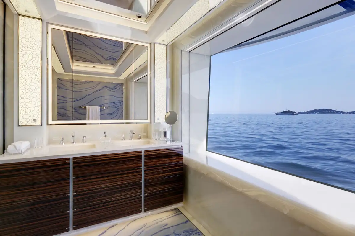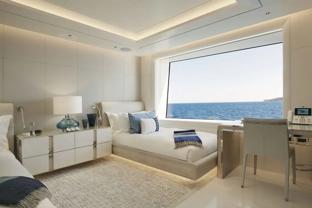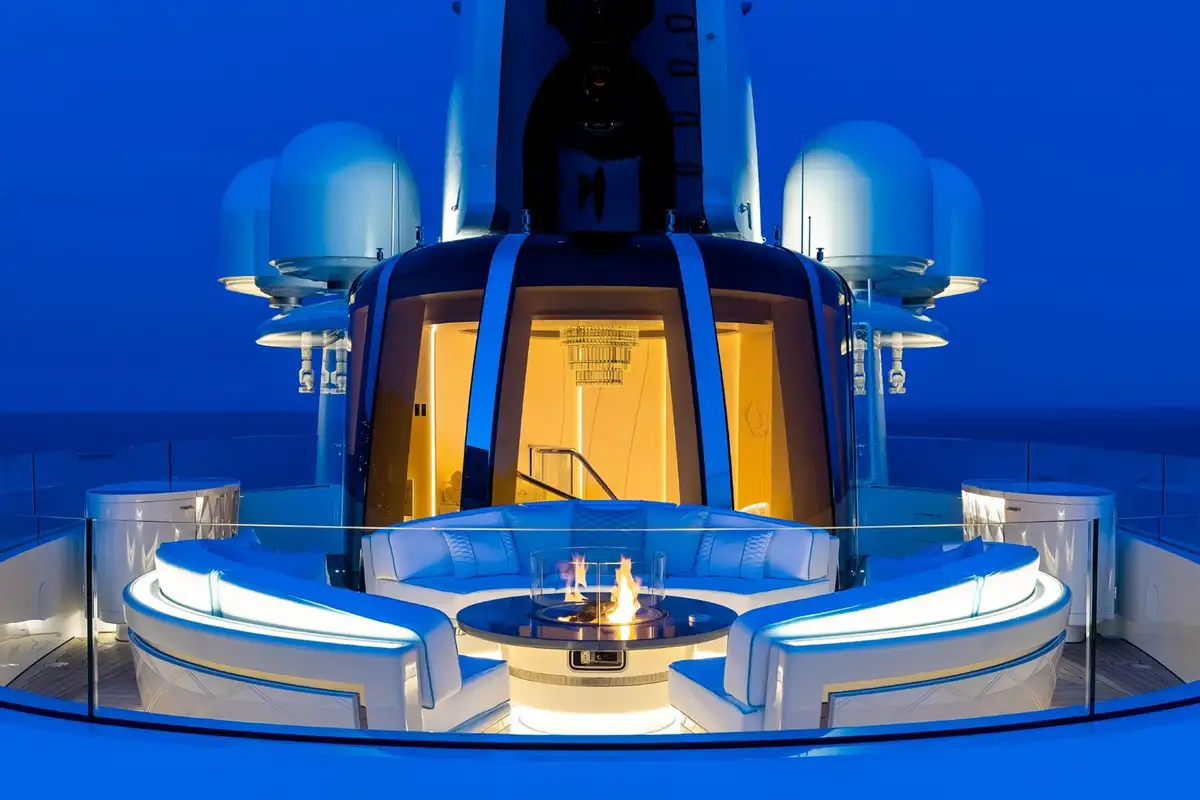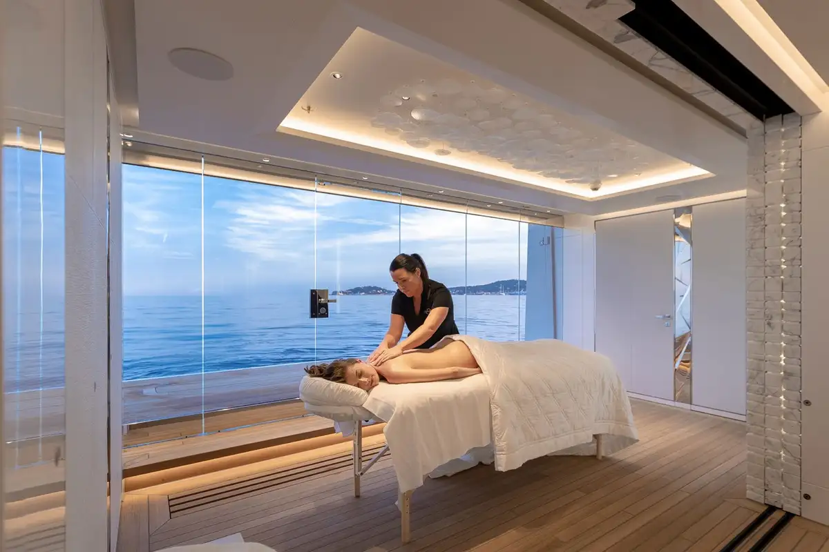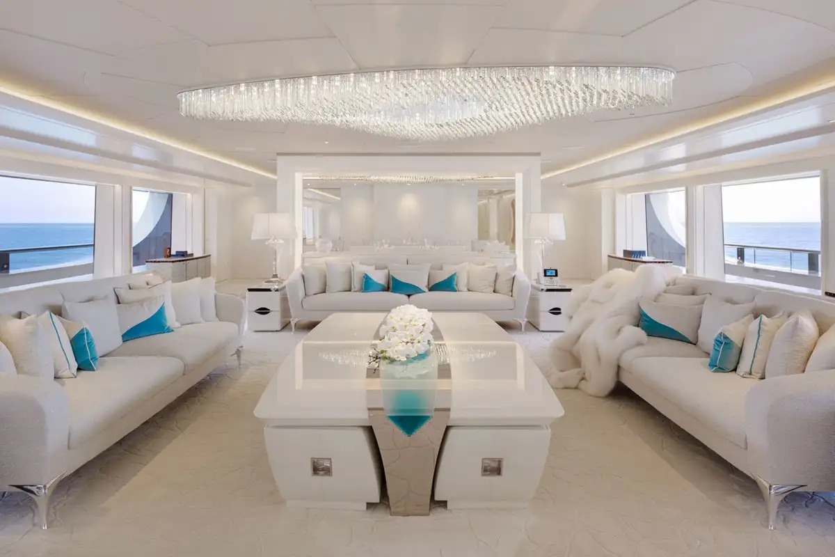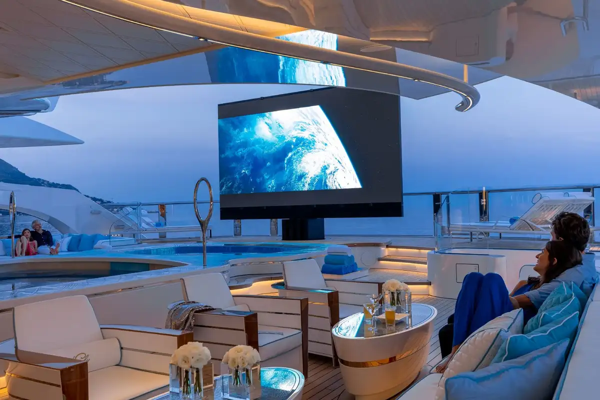 Her multiple special features include an IMAX Dolby cinema, nightclub, fully-certified helipad, a sophisticated beach club with hammam and plunge pool which sits beneath the glass-bottomed swimming pool.