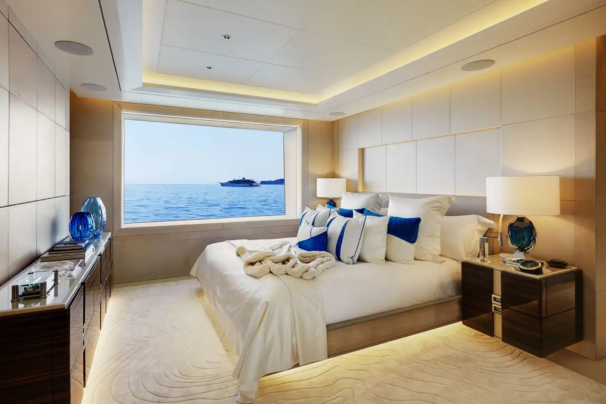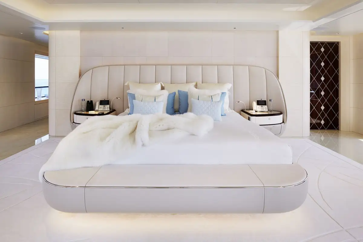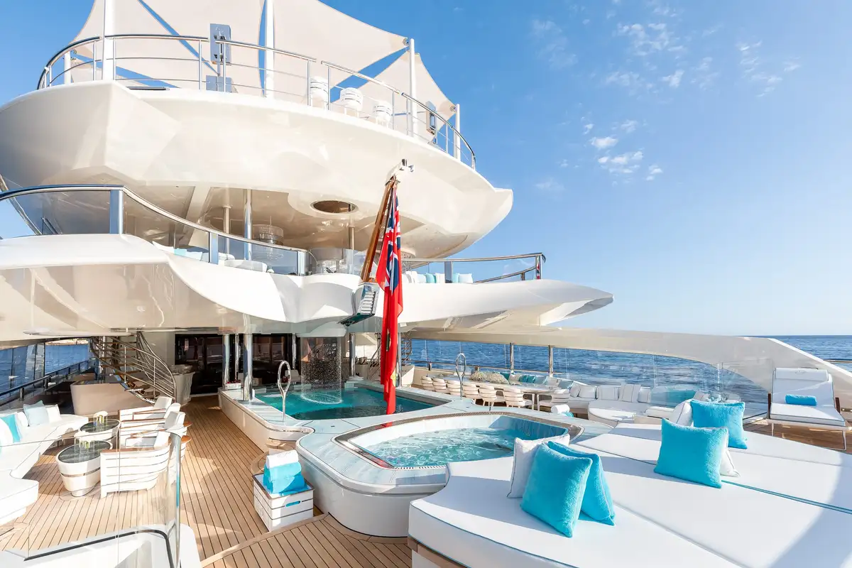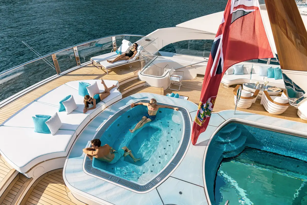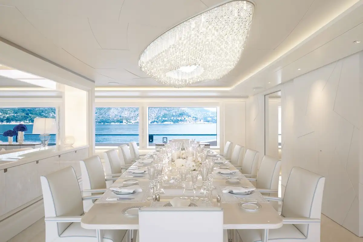 Her multiple special features include an IMAX Dolby cinema, nightclub, fully-certified helipad, a sophisticated beach club with hammam and plunge pool which sits beneath the glass-bottomed swimming pool.