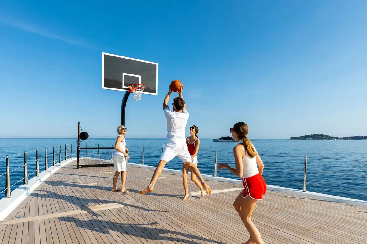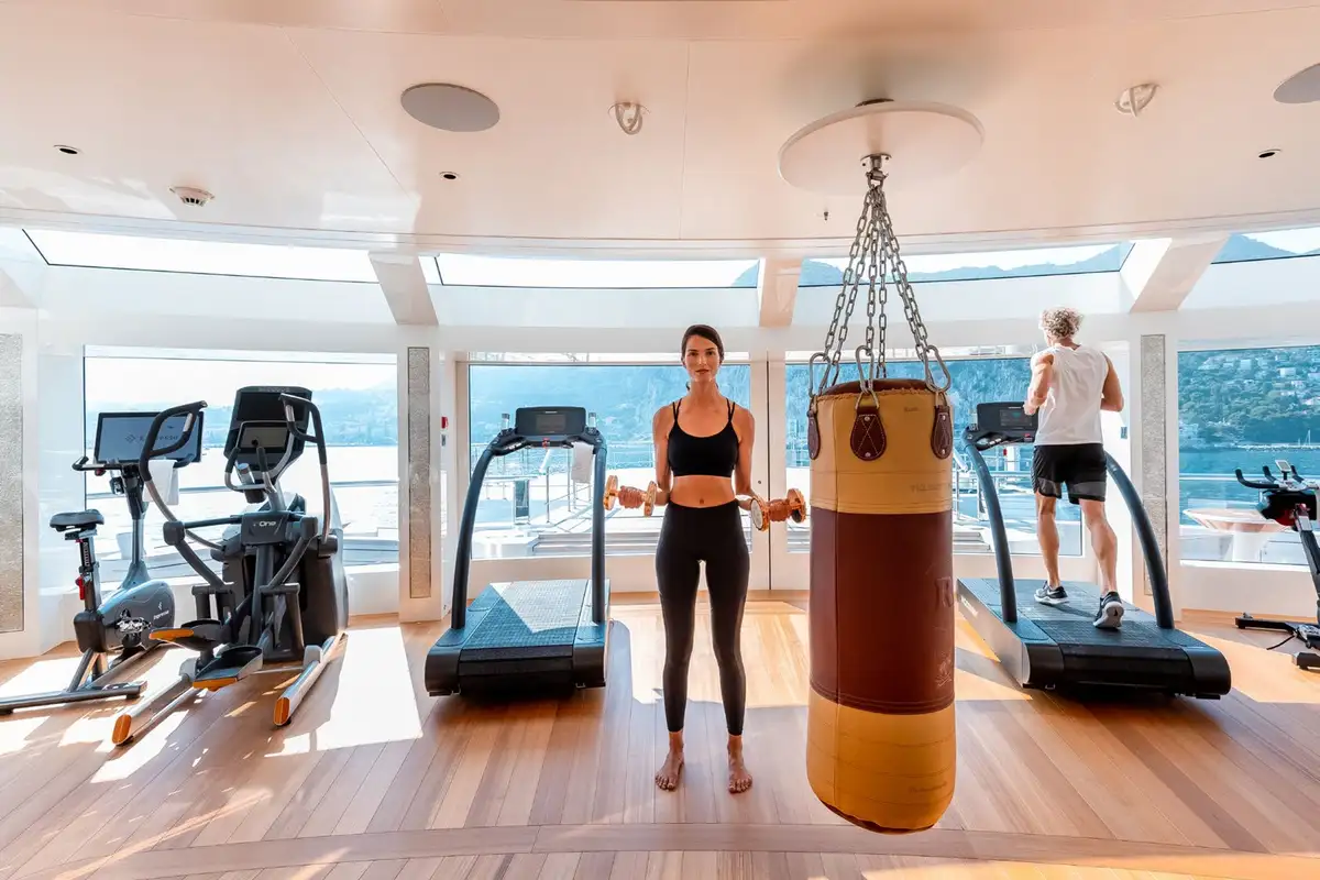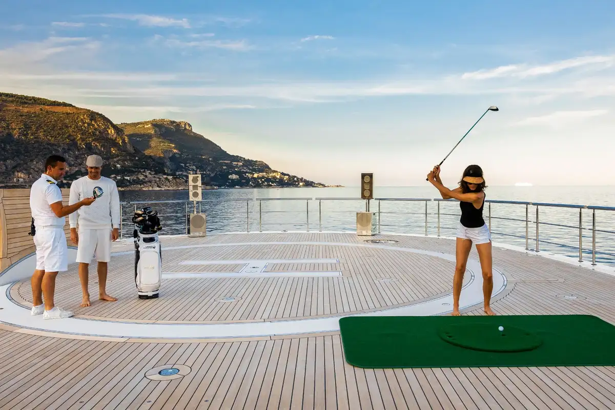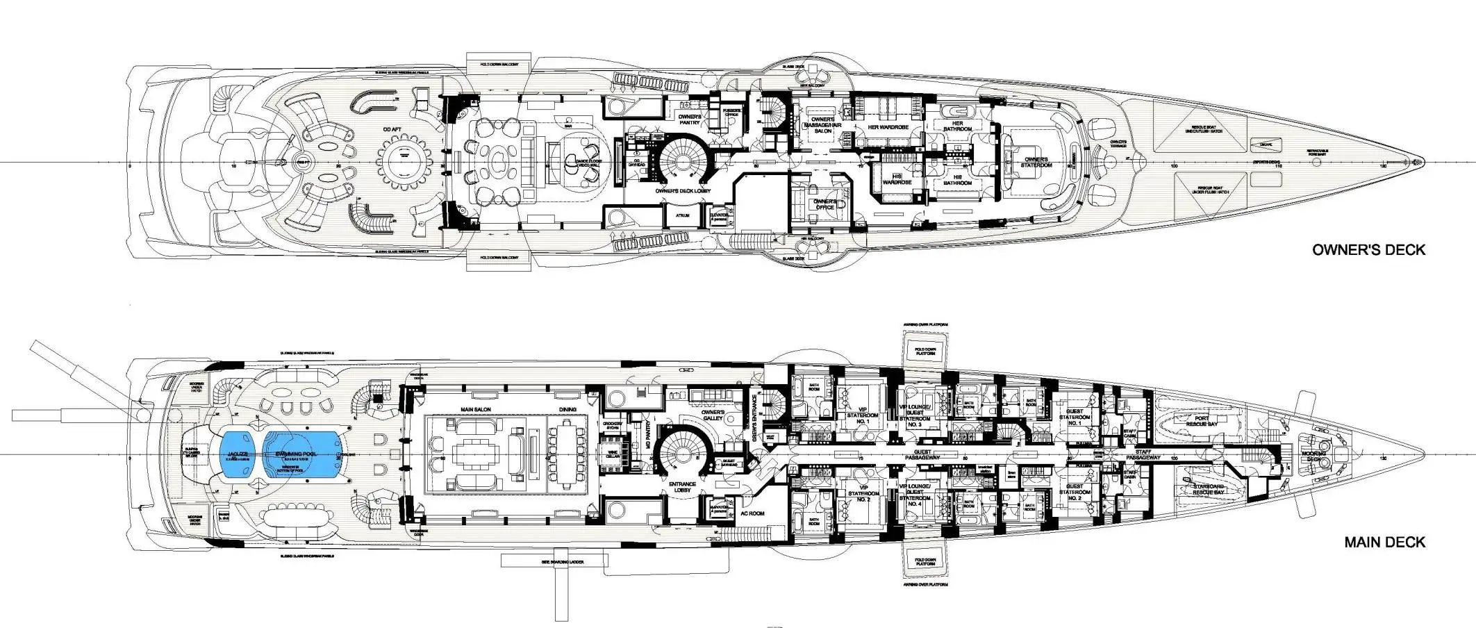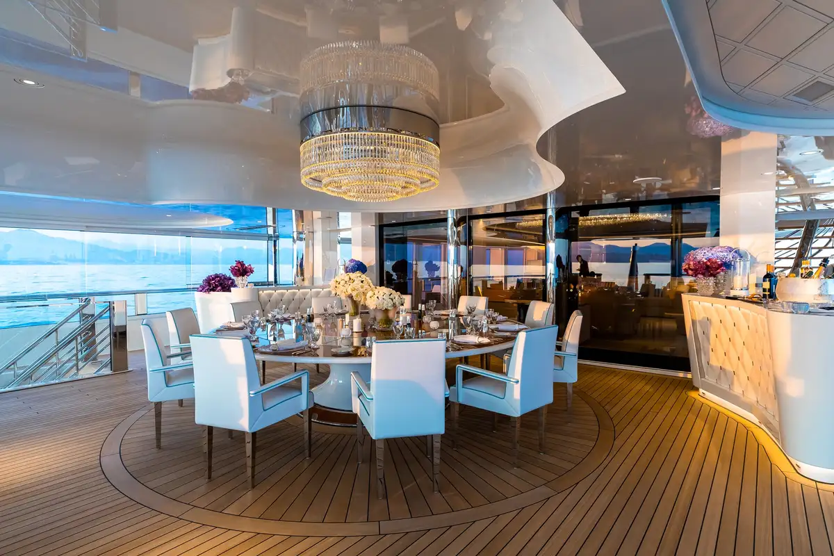 Her multiple special features include an IMAX Dolby cinema, nightclub, fully-certified helipad, a sophisticated beach club with hammam and plunge pool which sits beneath the glass-bottomed swimming pool.