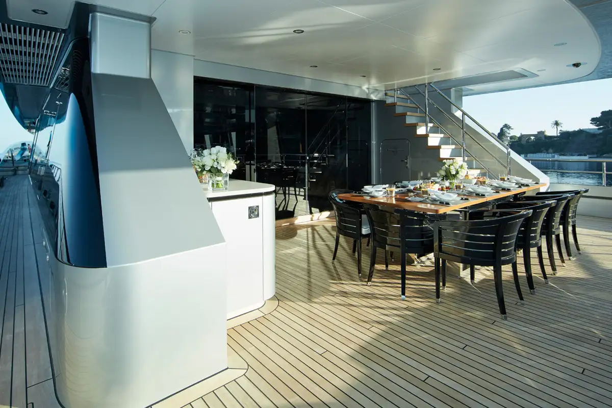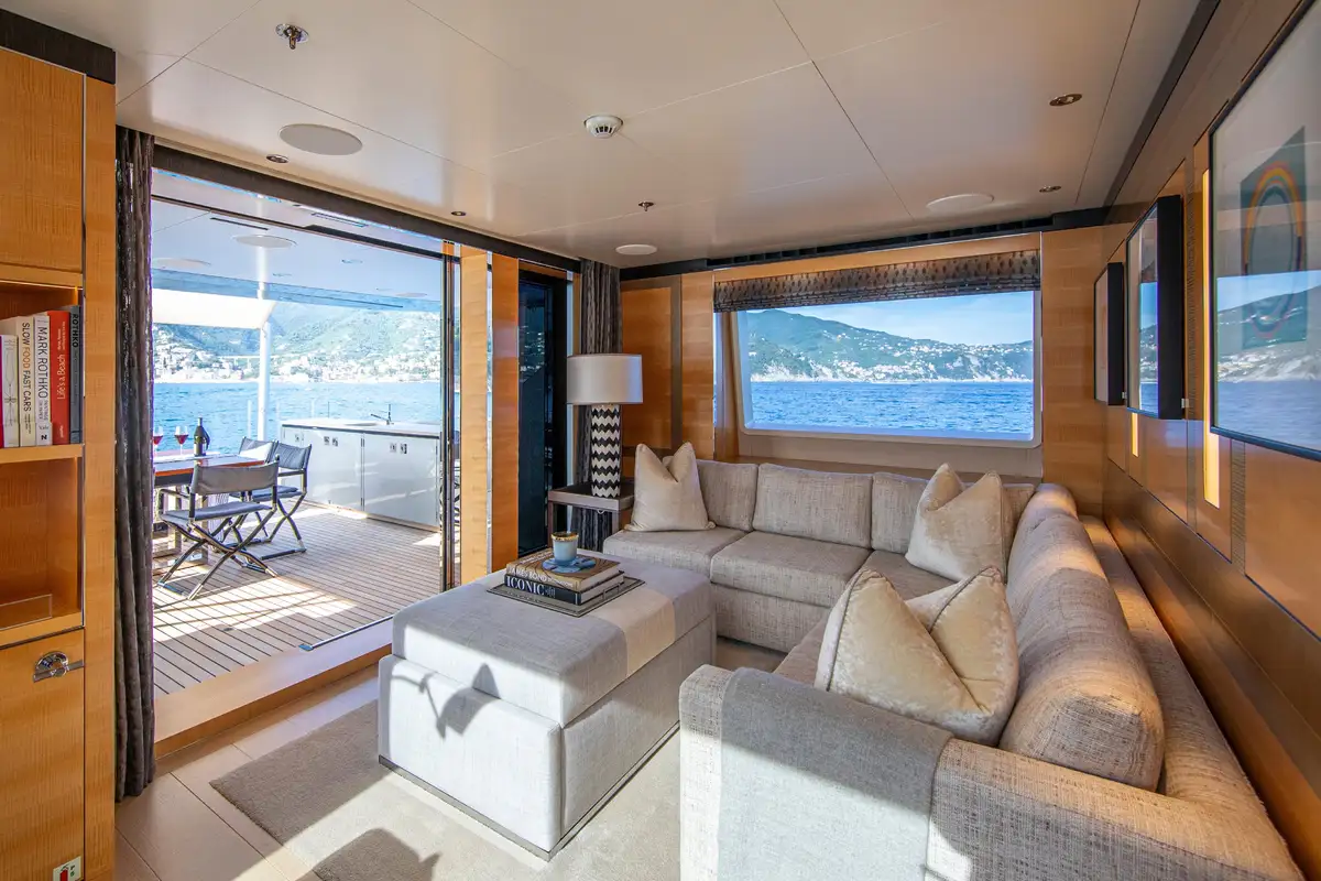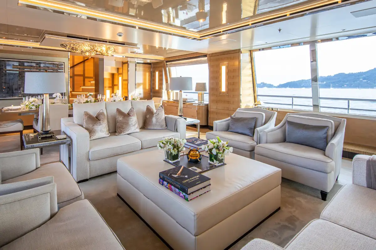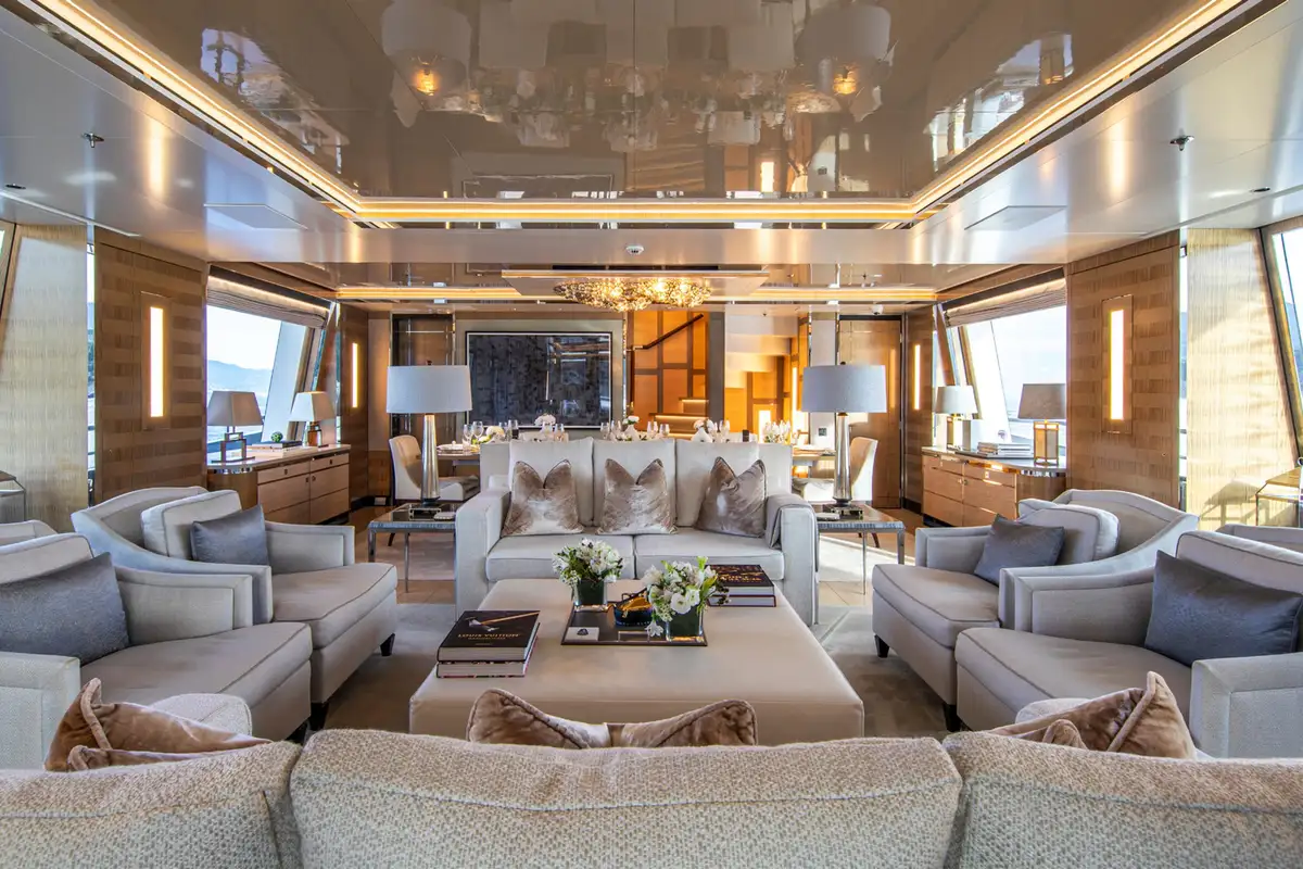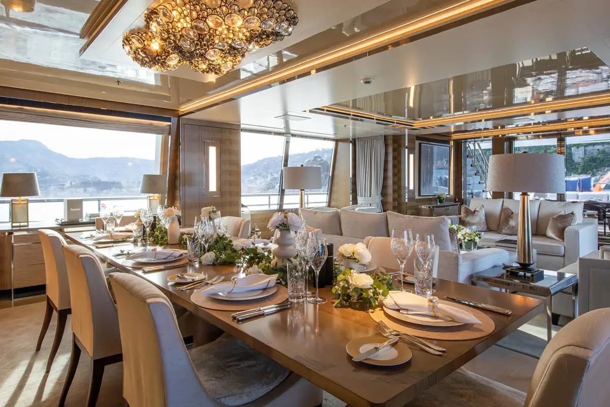 The main deck lounge carries a light, contemporary feel, where silver and grey tones soften into a calm palette. Sliding doors to port and starboard open to the elements, blurring the line between indoors and out. Forward, a formal dining space offers an elegant setting for private meals or curated evenings.