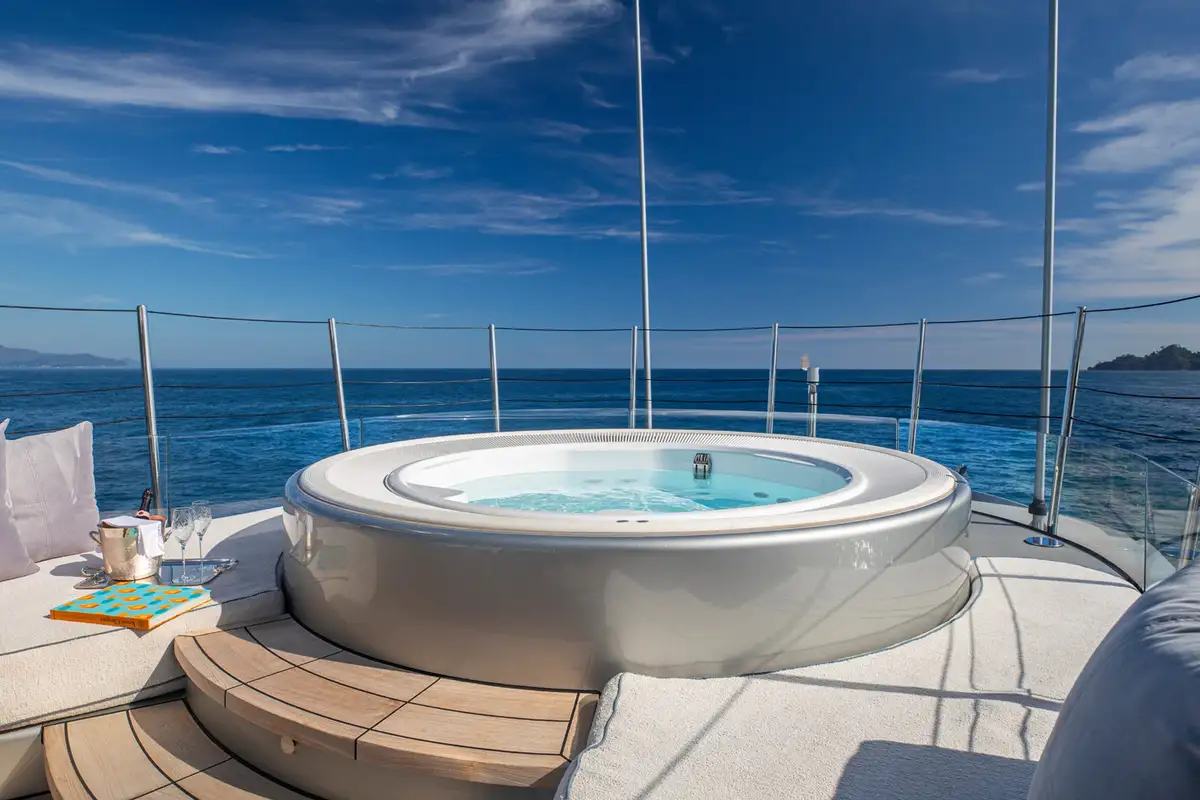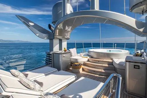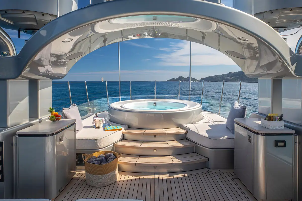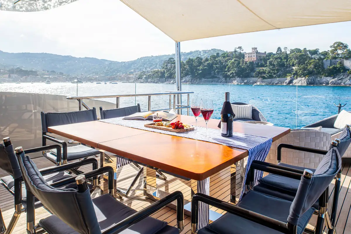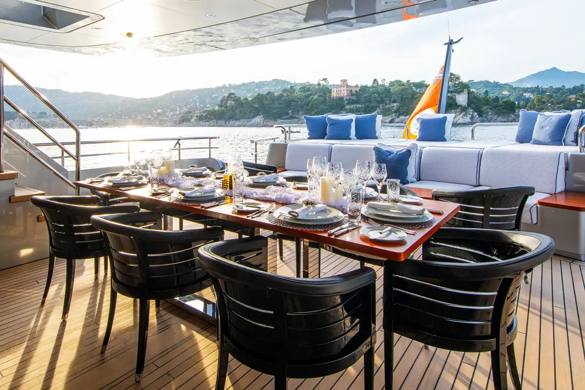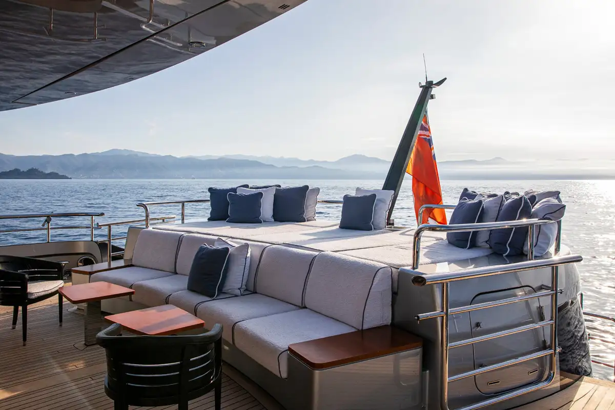 The main deck lounge carries a light, contemporary feel, where silver and grey tones soften into a calm palette. Sliding doors to port and starboard open to the elements, blurring the line between indoors and out. Forward, a formal dining space offers an elegant setting for private meals or curated evenings.