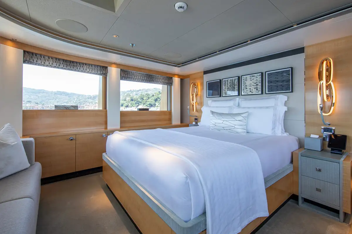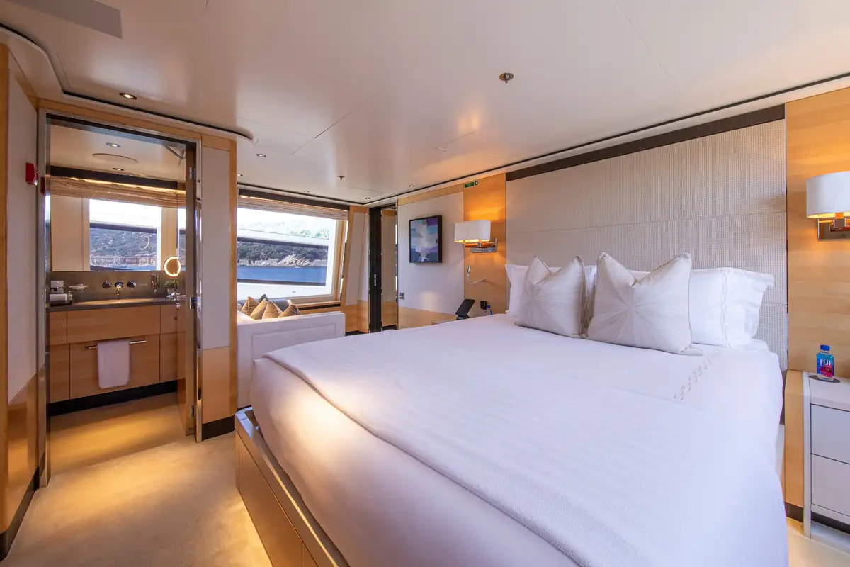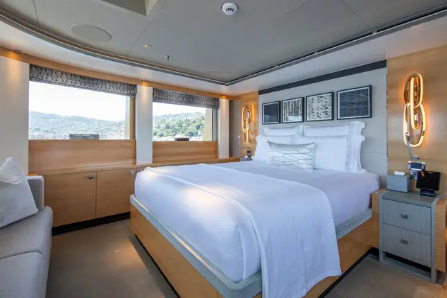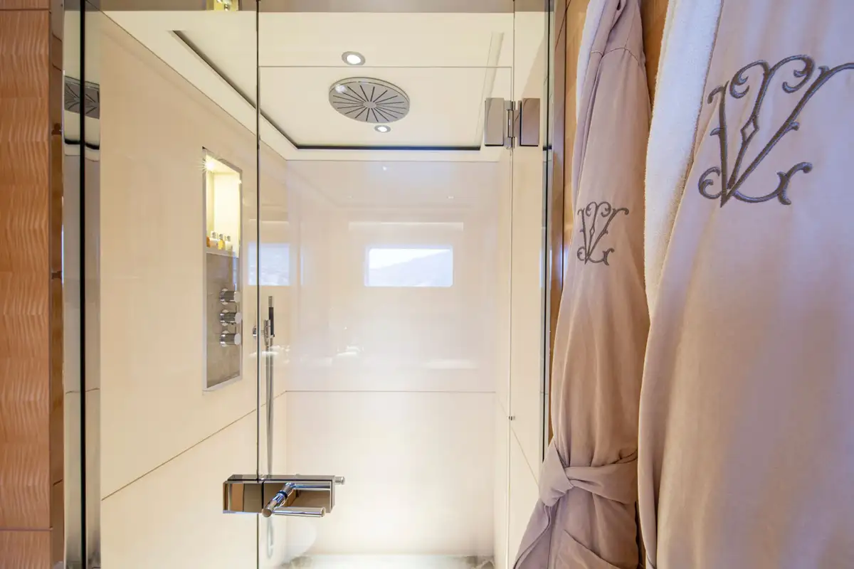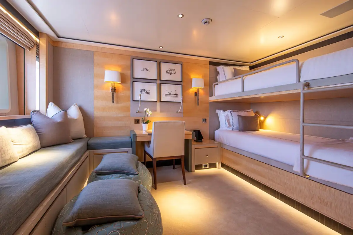 The layout is unusually versatile for her size, offering accommodation for 12 guests across six well-appointed cabins. A standout feature is the dedicated owner’s deck, rarely found on yachts under 50 metres, complete with an en suite and a private terrace accessed through the upper deck lounge. On the main deck, a VIP suite is complemented by its own lobby and private office, while the lower deck includes two twin cabins, a double, and a bunk, ideal for families or tailored guest arrangements.