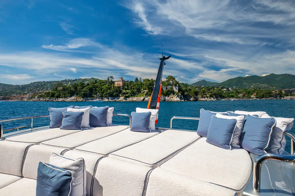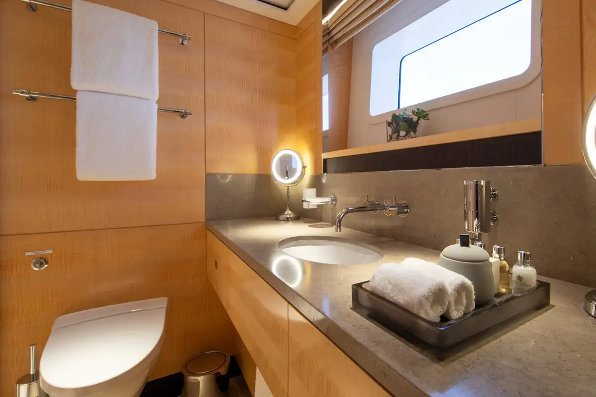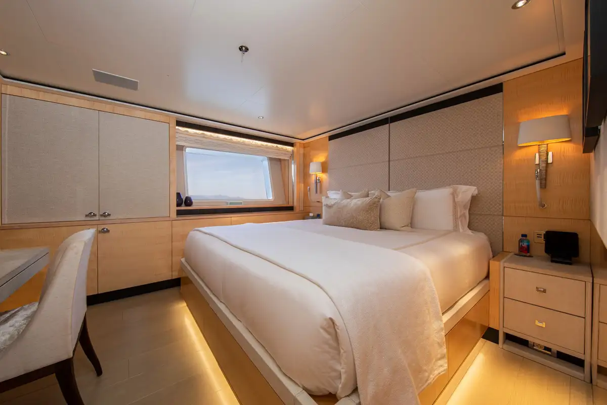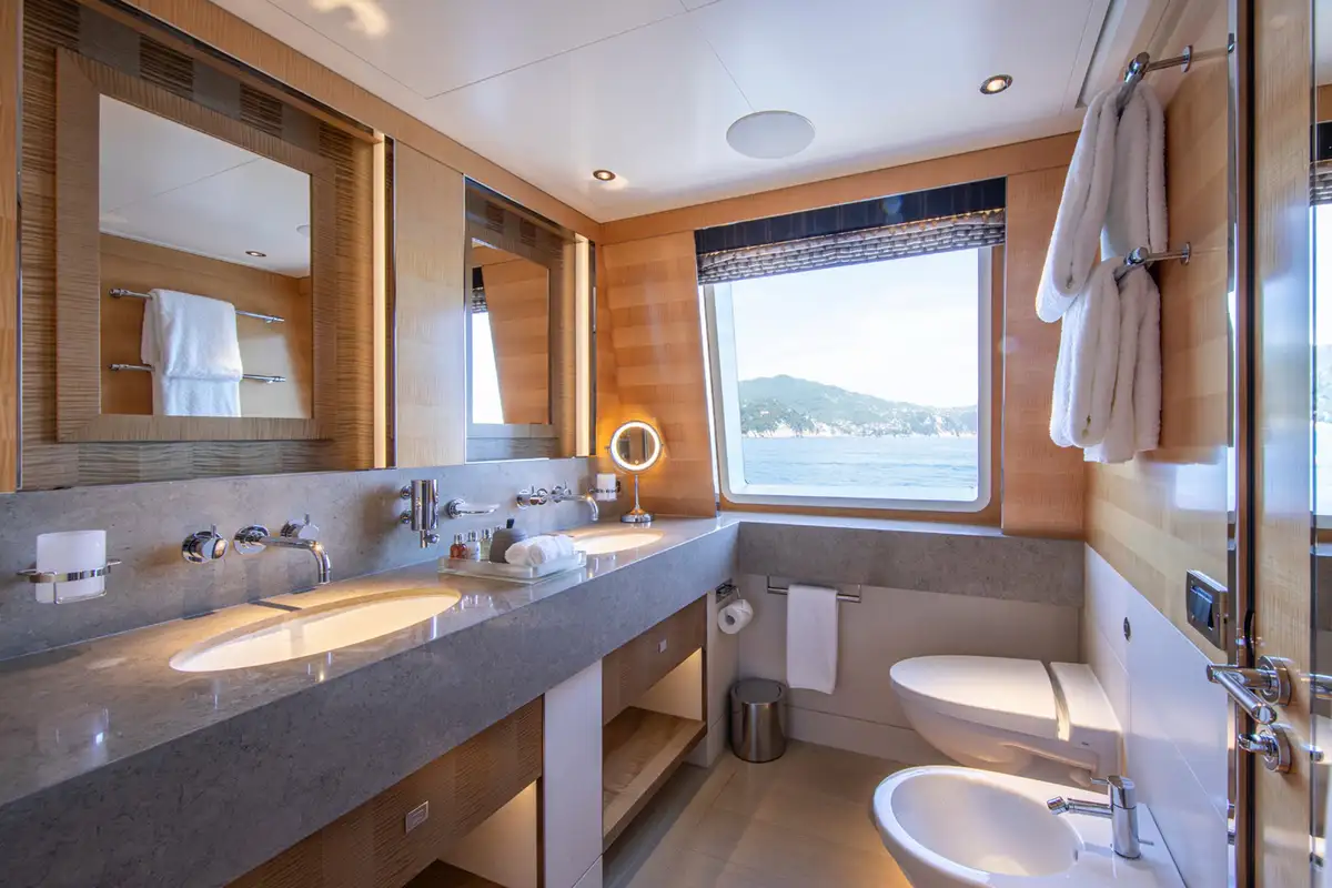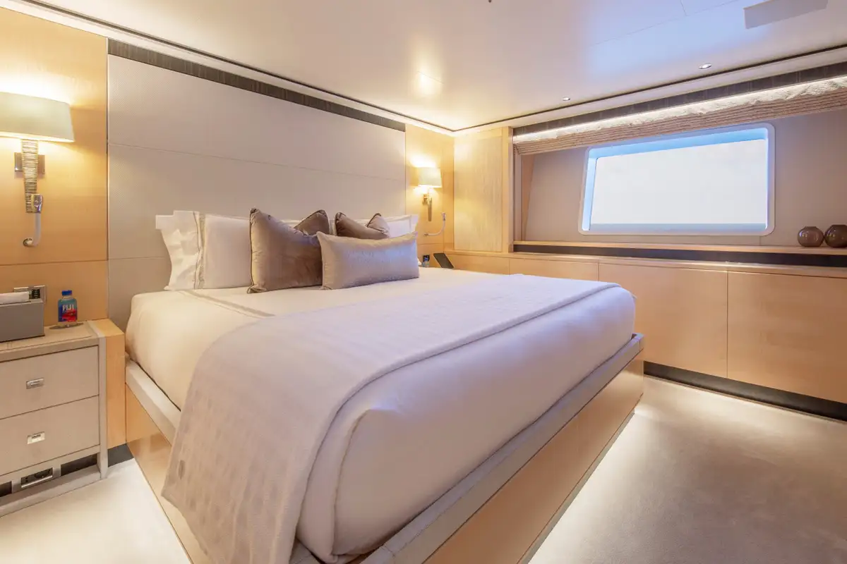 The layout is unusually versatile for her size, offering accommodation for 12 guests across six well-appointed cabins. A standout feature is the dedicated owner’s deck, rarely found on yachts under 50 metres, complete with an en suite and a private terrace accessed through the upper deck lounge. On the main deck, a VIP suite is complemented by its own lobby and private office, while the lower deck includes two twin cabins, a double, and a bunk, ideal for families or tailored guest arrangements.