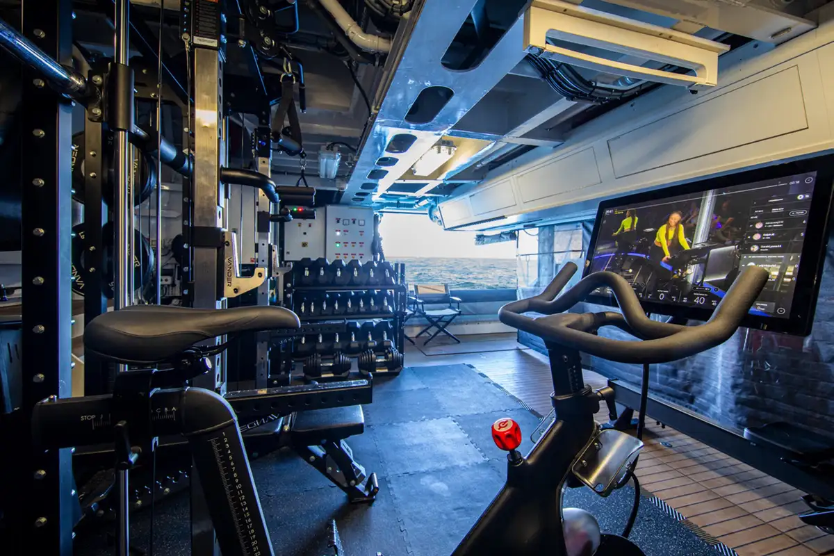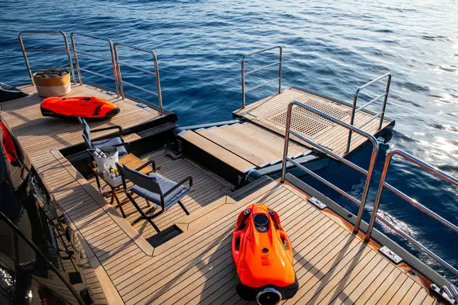 At water level, a large, extendable swim platform offers smooth access to the sea; whether diving, swimming or simply pausing between activities. The inflatable jungle gym and jellyfish pool add flexibility and fun, while the full toy inventory supports everything from adventure to quiet leisure.