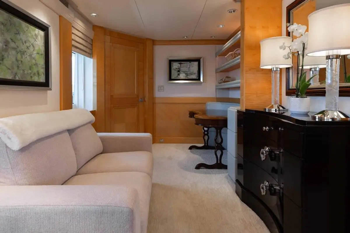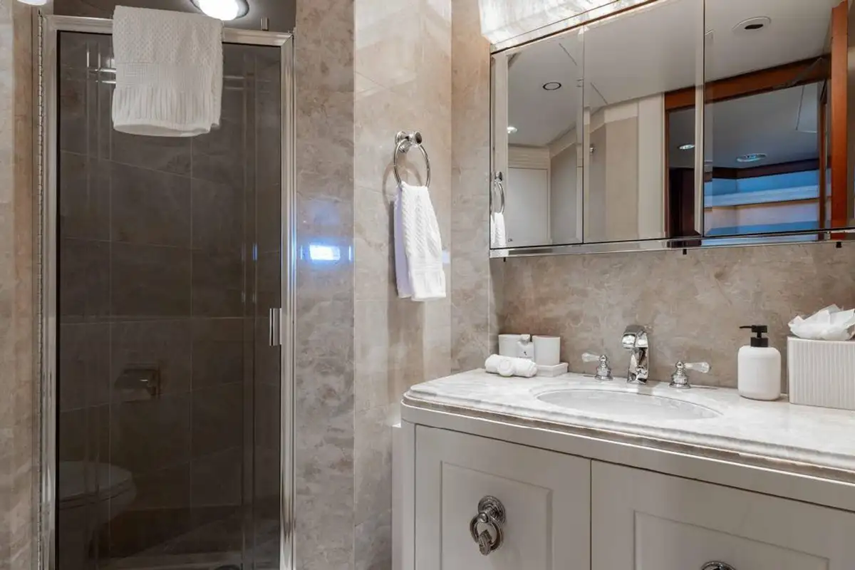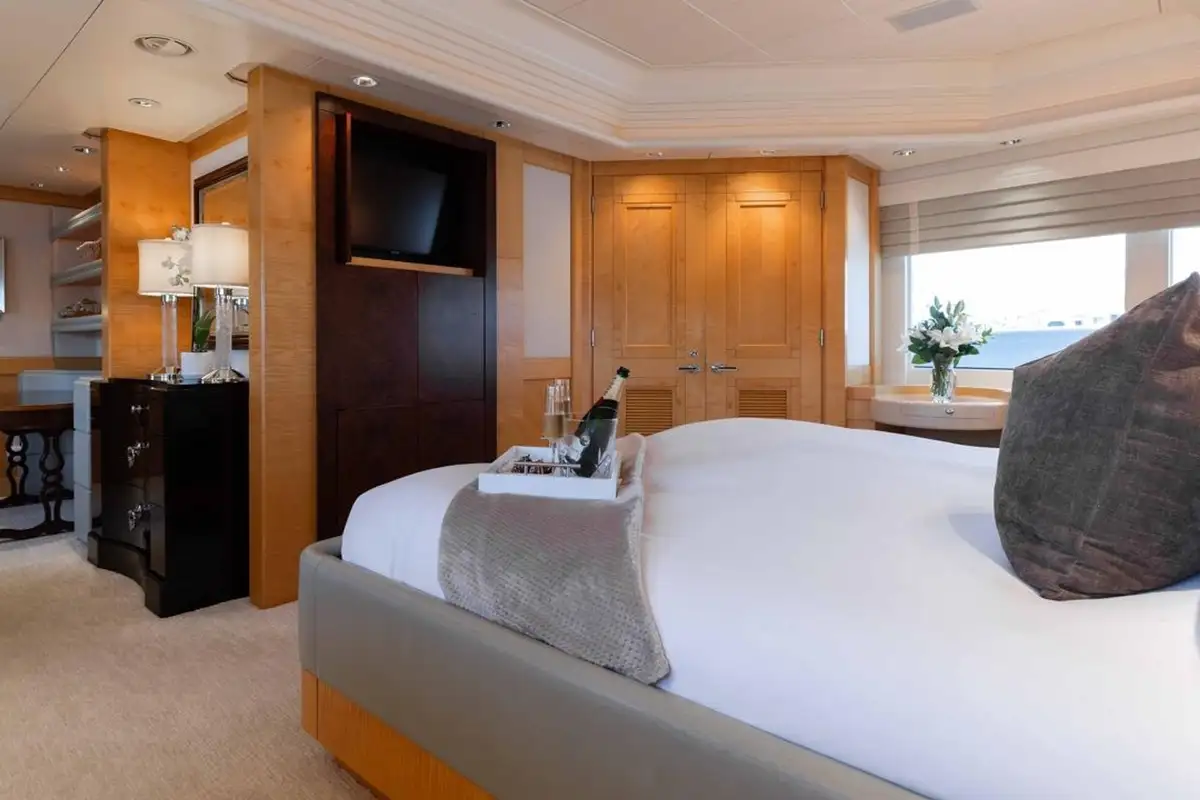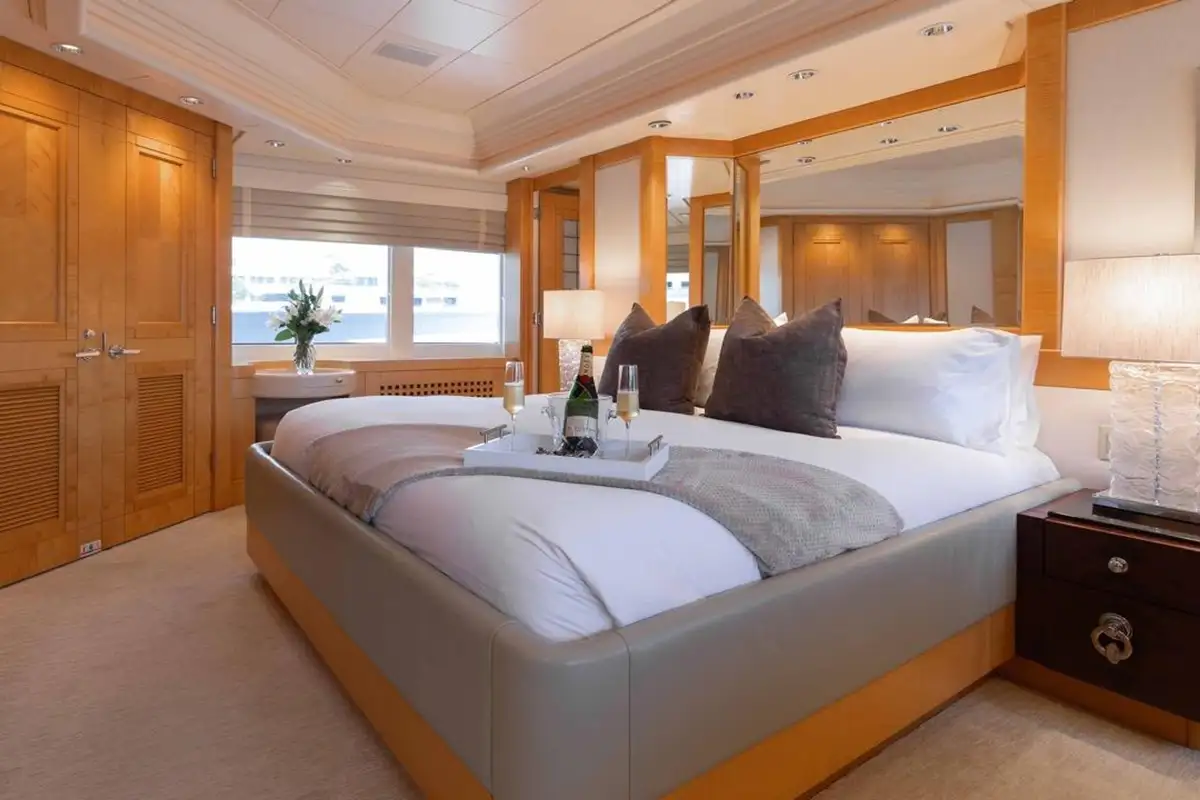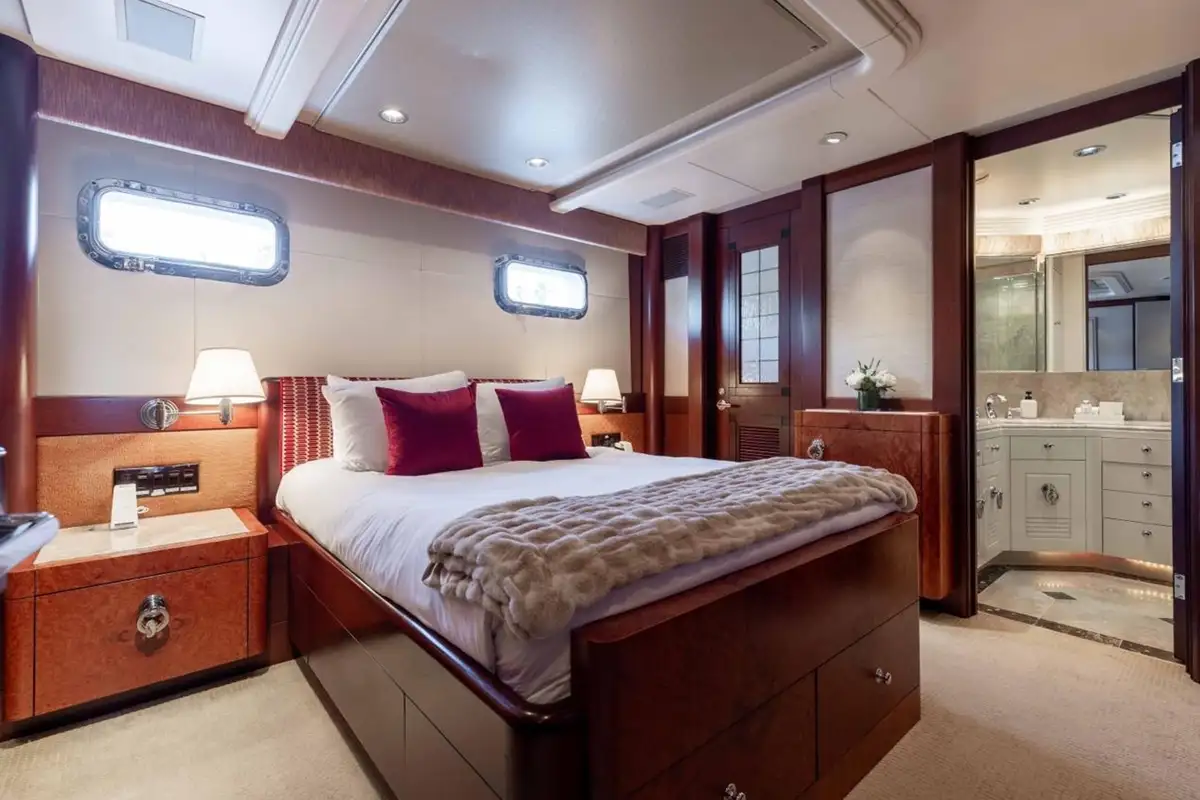Accommodating up to eight guests, LANIDA features four beautifully appointed cabins and a versatile bonus room. The full-beam master suite on the main deck offers a king-size bed and en suite bathroom, while the lower deck hosts two doubles, a twin, and a convertible space that functions either as a guest cabin or a private gym, depending on your needs.