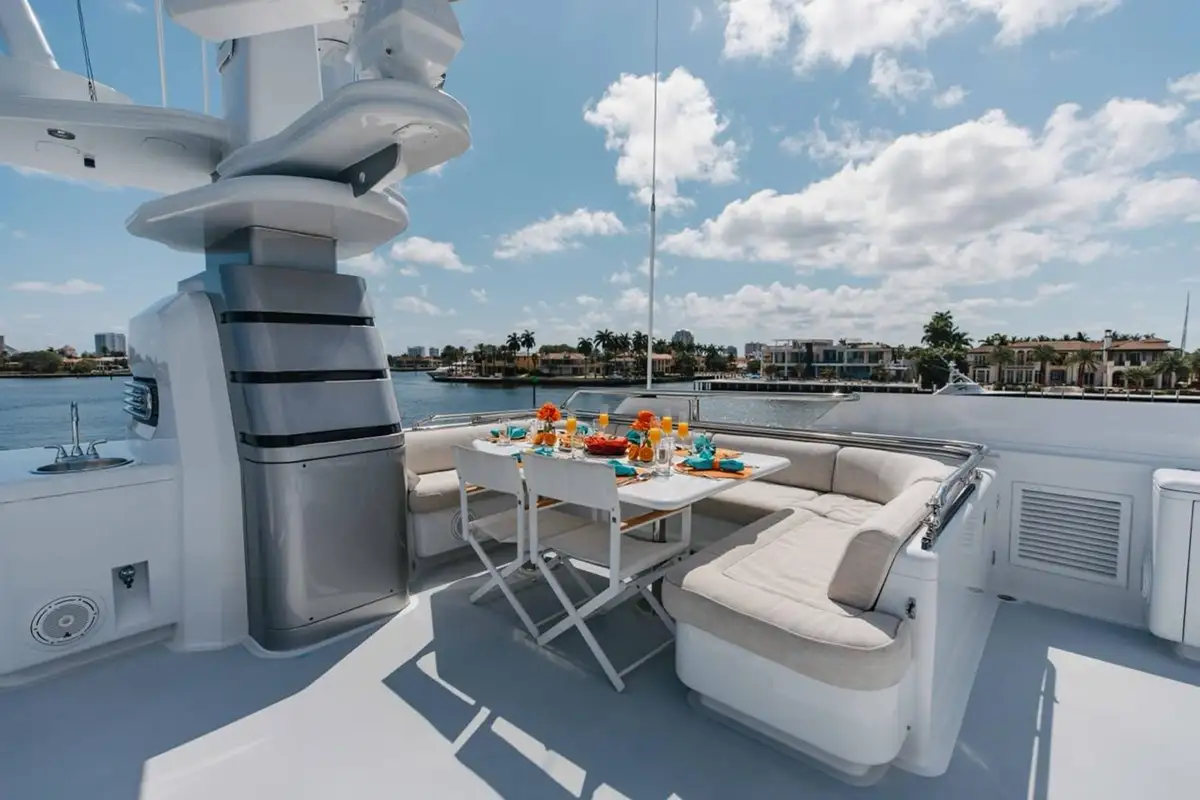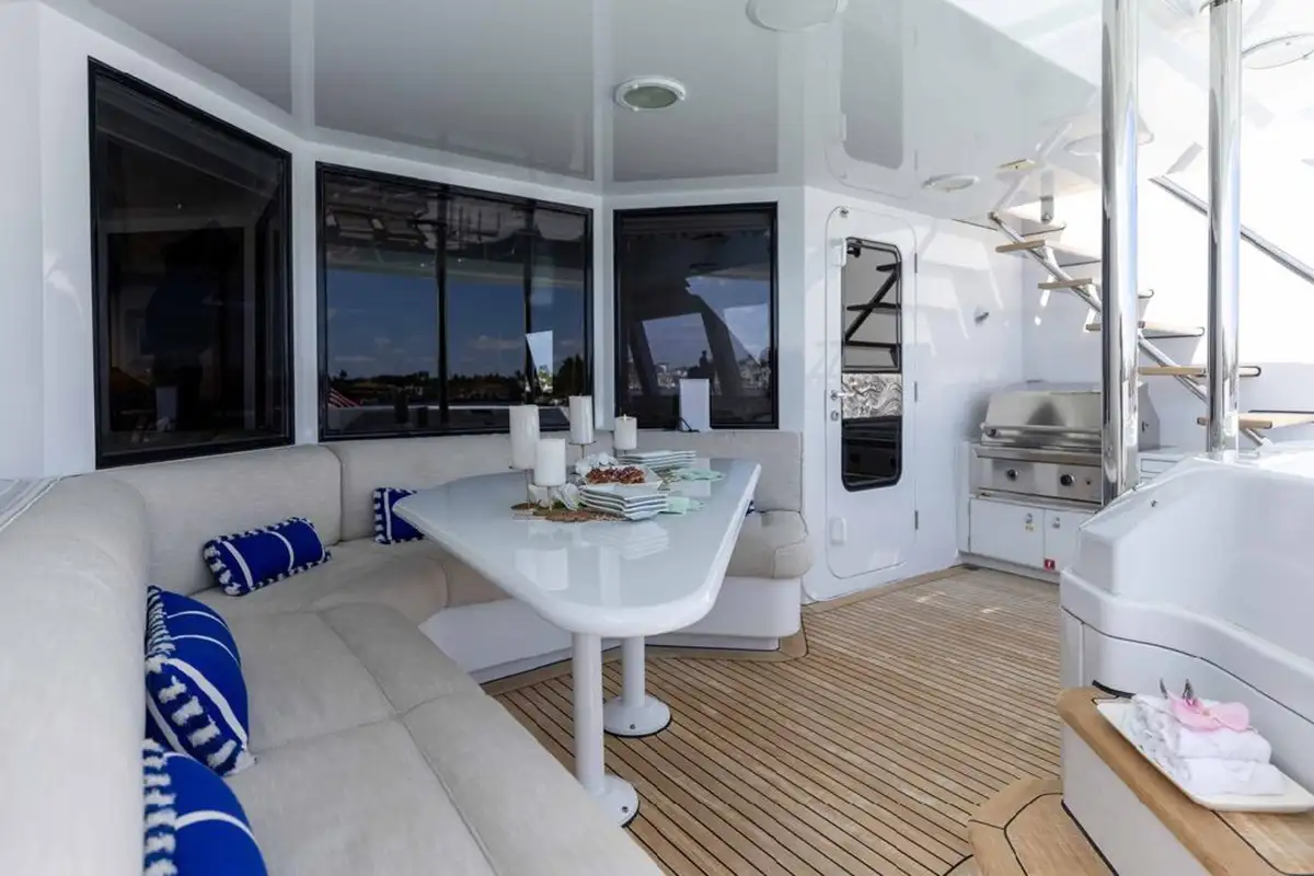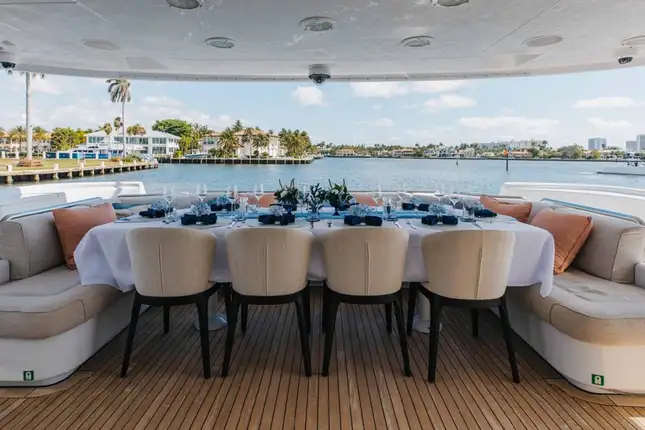 Her main deck lounge is elegantly designed for entertaining, with a stylish dining area and bar that flows seamlessly into the aft deck for al fresco dining. Head up to the sky lounge to enjoy expansive views in an elevated setting, or move aft to the upper deck where a versatile outdoor space invites you to relax on built-in sofas, dine under the stars, or convert the area into a sun bed for soaking up the sunshine. A jacuzzi and loungers complete the experience for perfect days on deck.