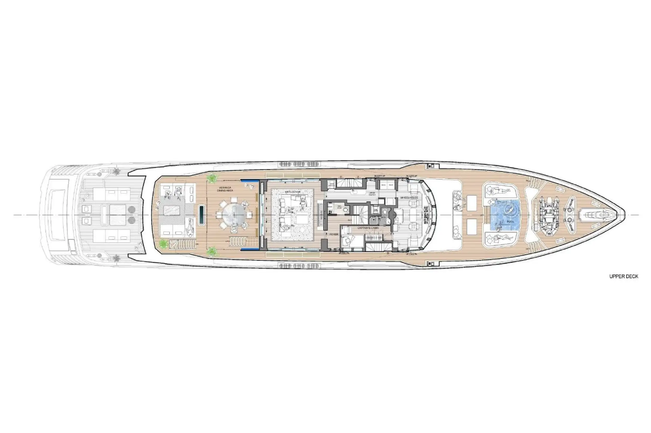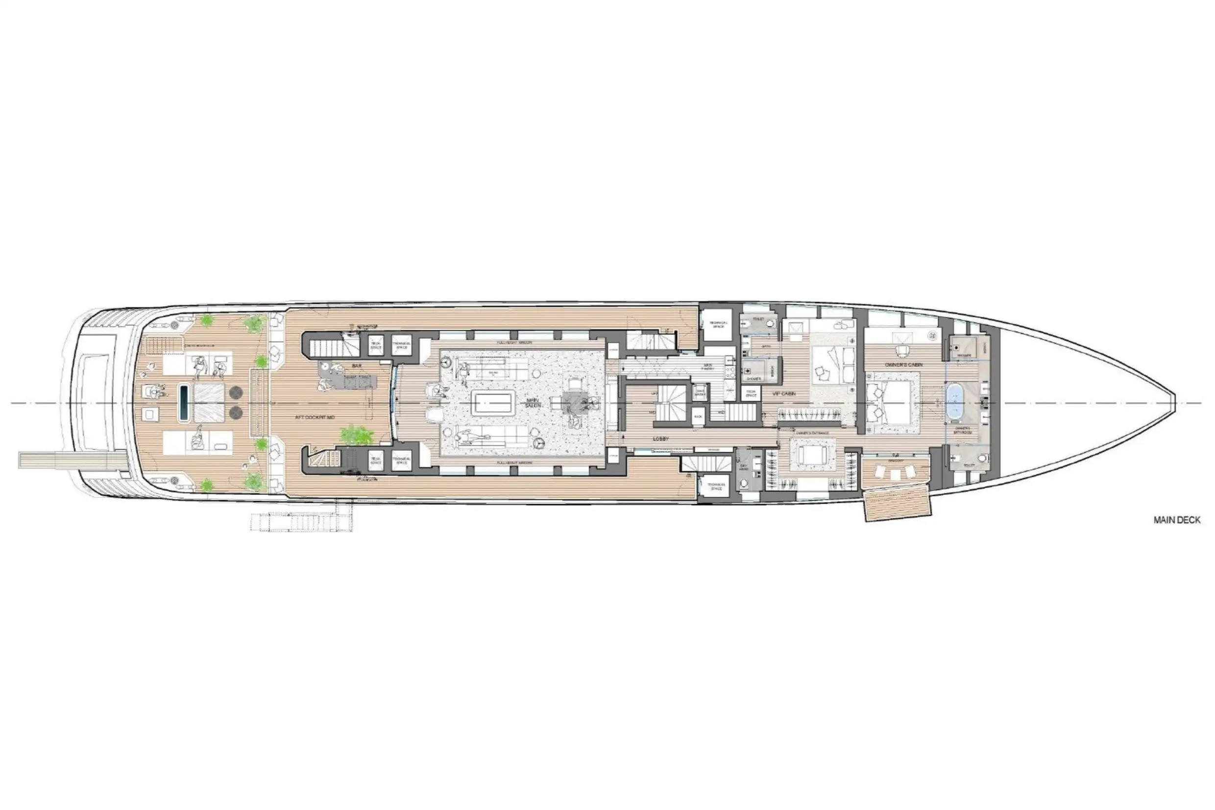 A walk along any deck will leave you at a loss for choice of where is best to spend your time. There’s the wonderful lower beach club area, the fold-down transom and hull doors expand this space to plentiful proportions. Relax on sea terraces above the water or in the lounge area inside. Above, is the stunning mezzanine al fresco lounge area, you can relax here with cocktails or coffee and enjoy canapes or snacks.