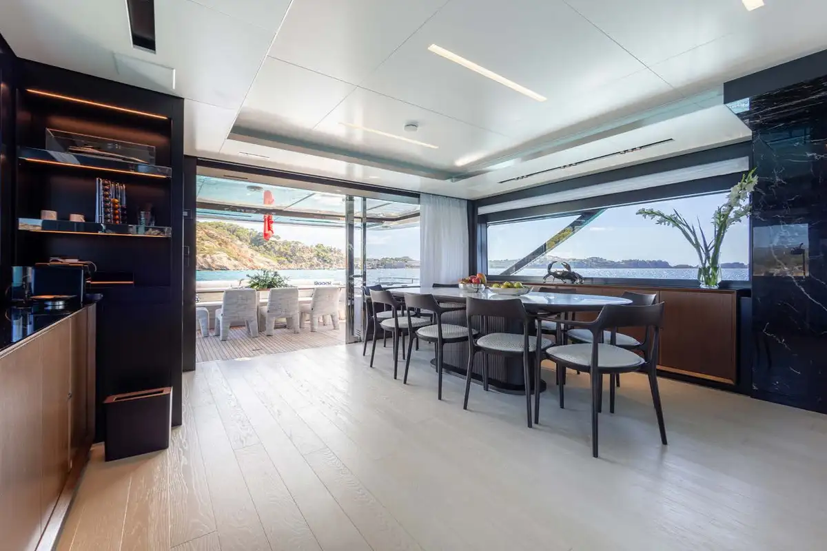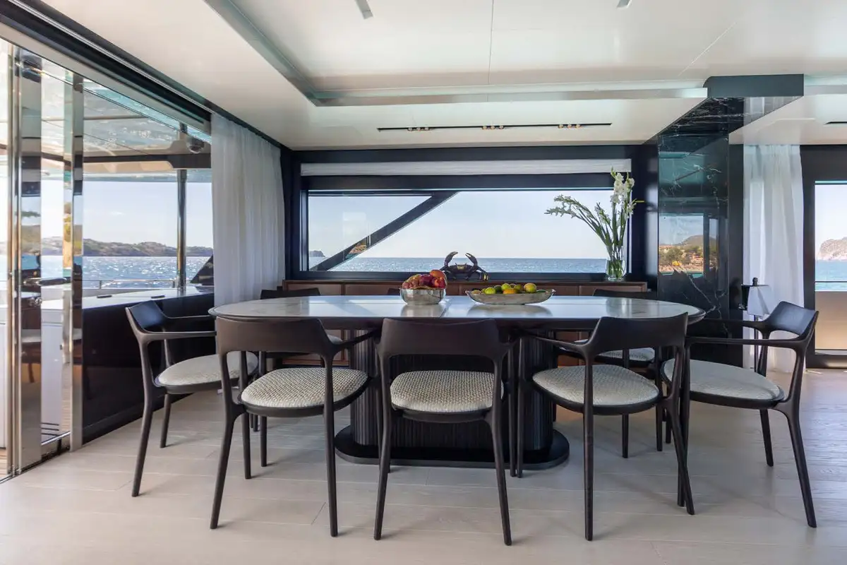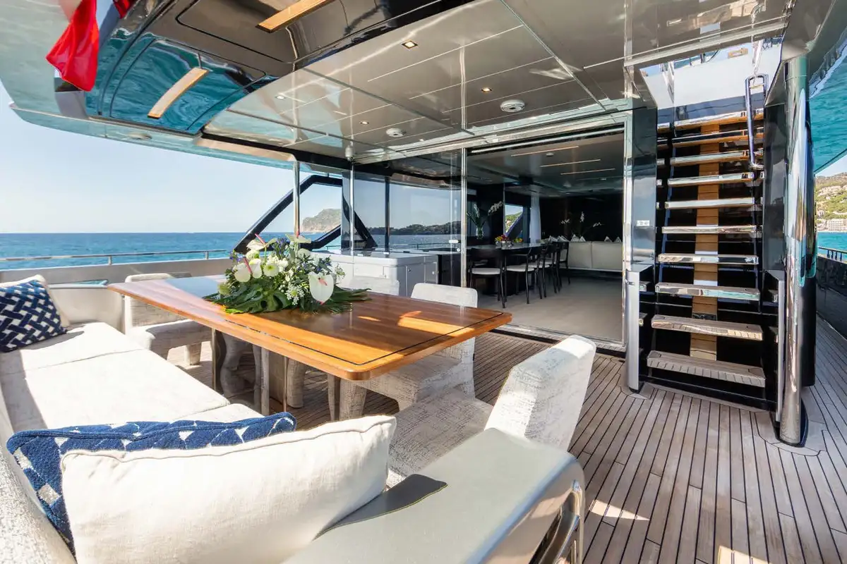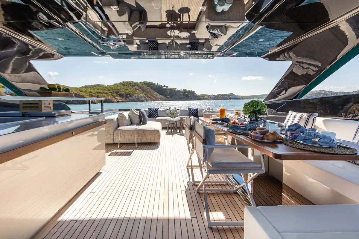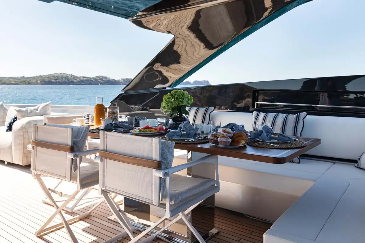 She has wonderful outside dining spaces, perfect for your party of eight guests. One is up on the flybridge, ideal for breakfasts and dinners, with refreshments always on hand from the bar. The second, shaded by the overhang above, provides a great space for lunches away from the heat of the midday sun.