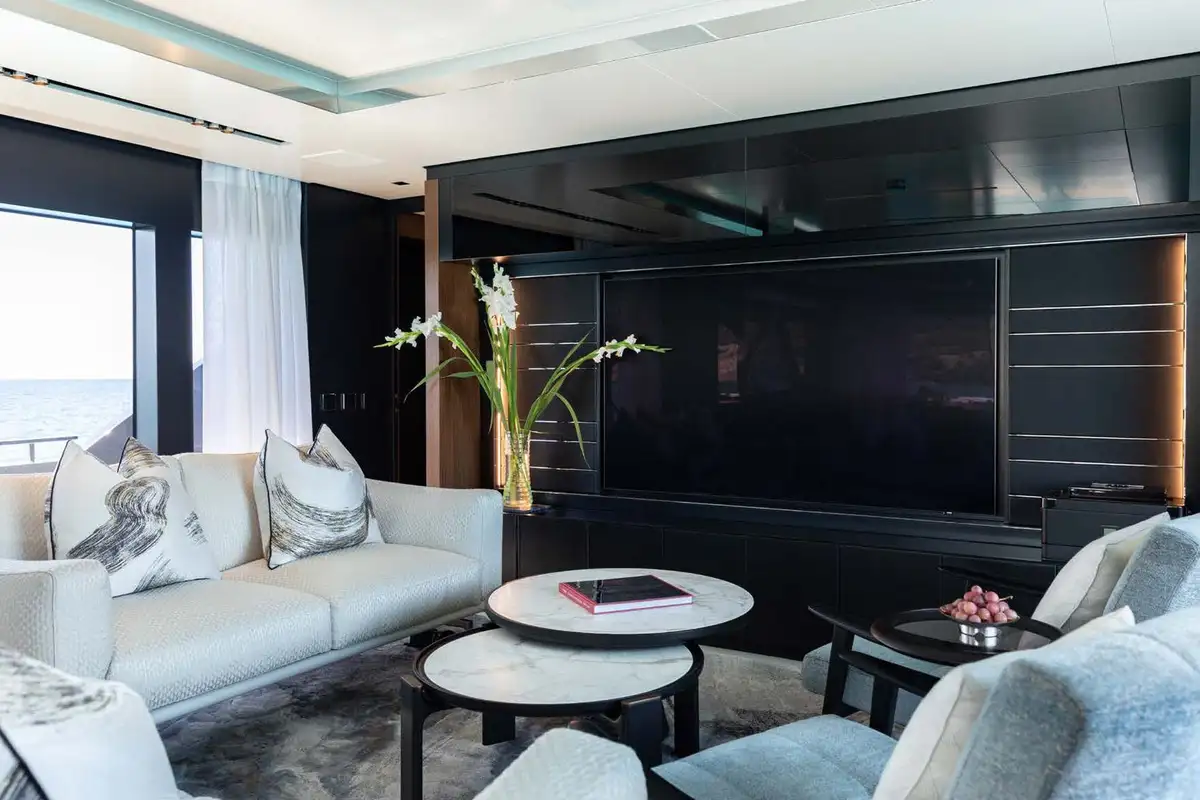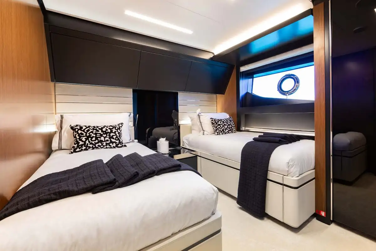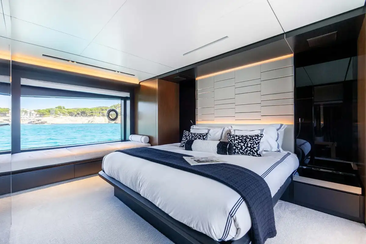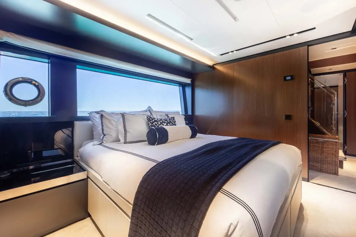 Another great space to soak up the views is the flybridge lounge, where you can watch the captain at the helm as the world whizzes past. Too much excitement? There are sunbeds on the aft flybridge where you can catch a few rays as the yacht’s wake reels away into the distance.