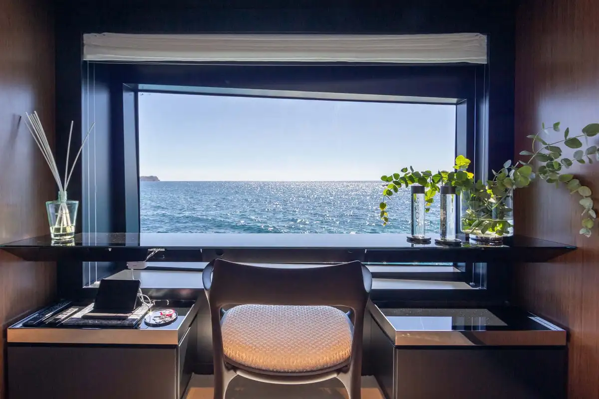 If you need to escape the heat, settle into a sofa in the air-conditioned lounge to cool off while enjoying remarkable 360-degree views through the expansive glass on either side and the bridge forward. If there’s something special to celebrate – a birthday, anniversary, lifetime landmark or just another wonderful day – the dining table opposite the family galley recreates that special chef’s table experience, with the sights, scents and sounds of serious cuisine.