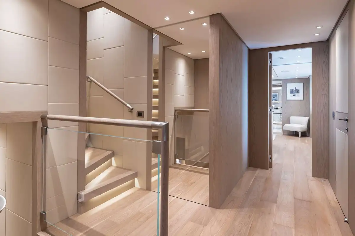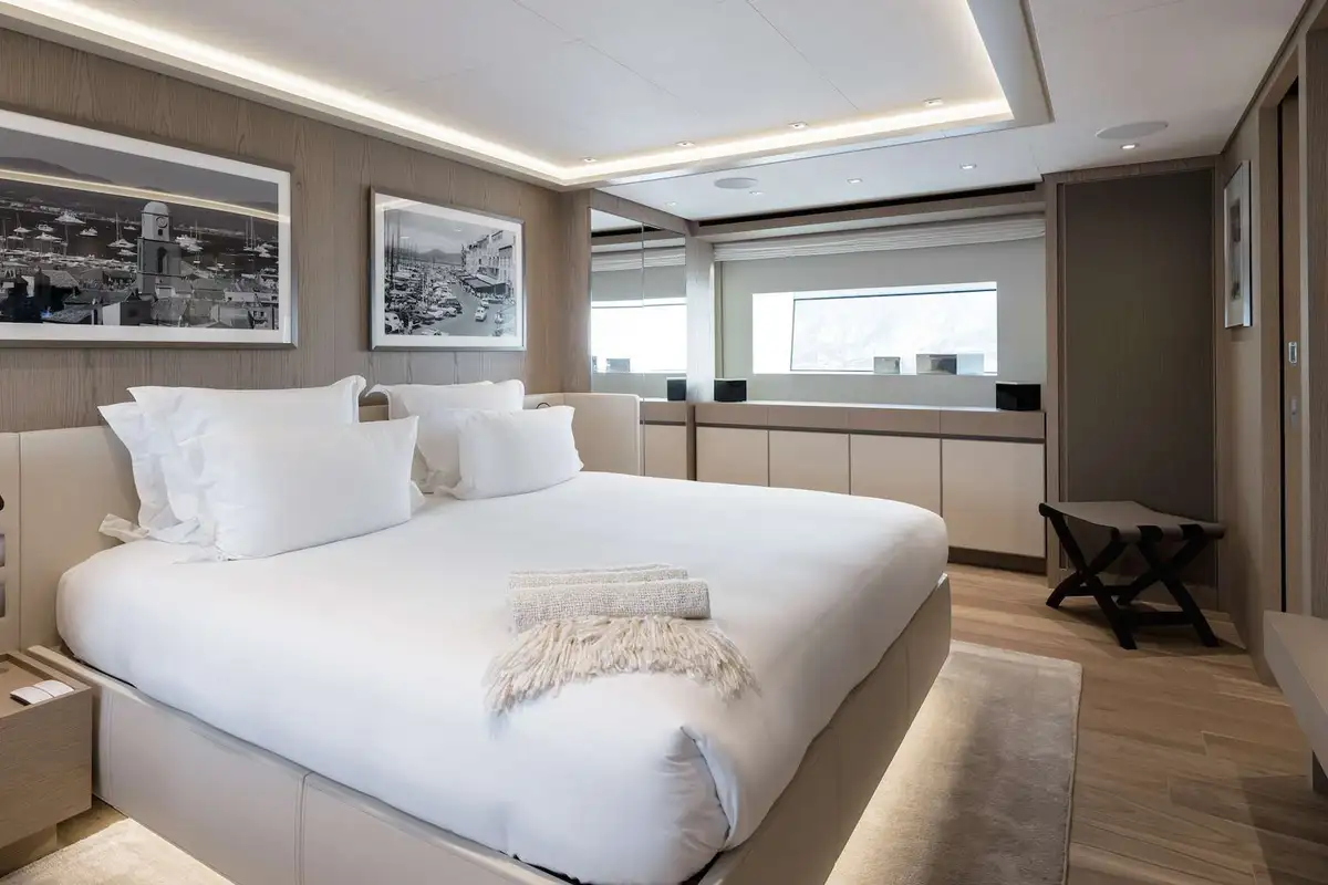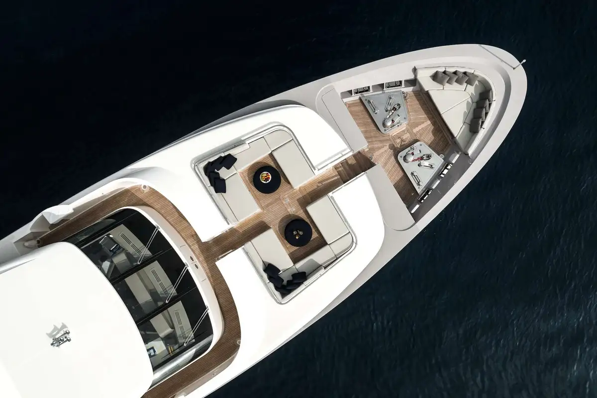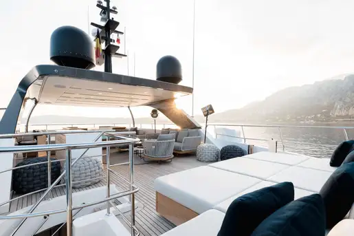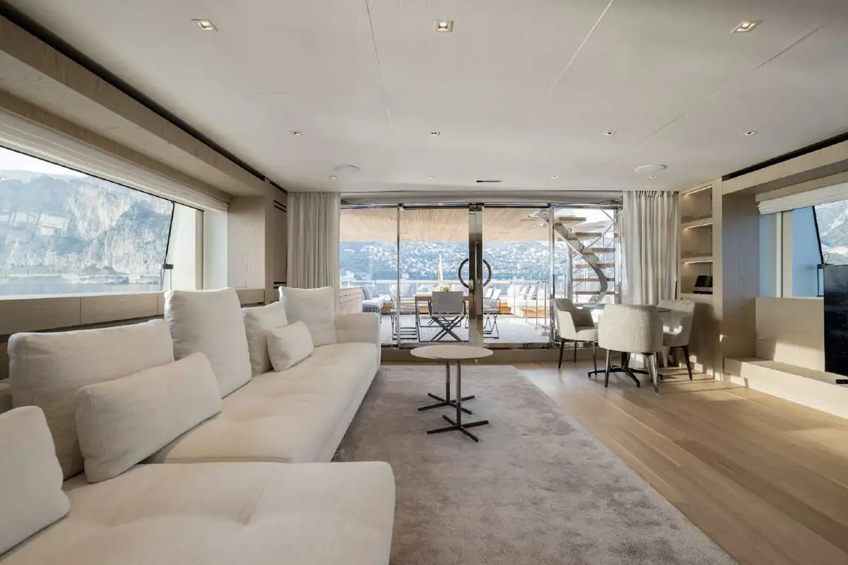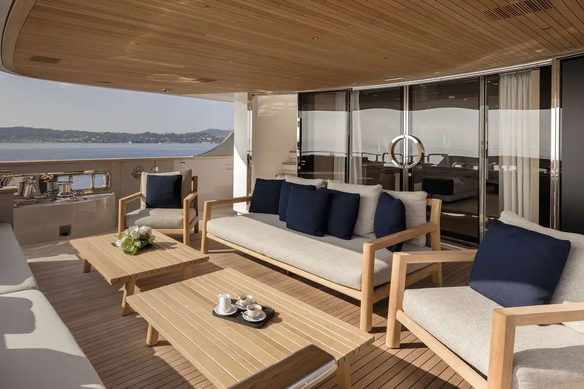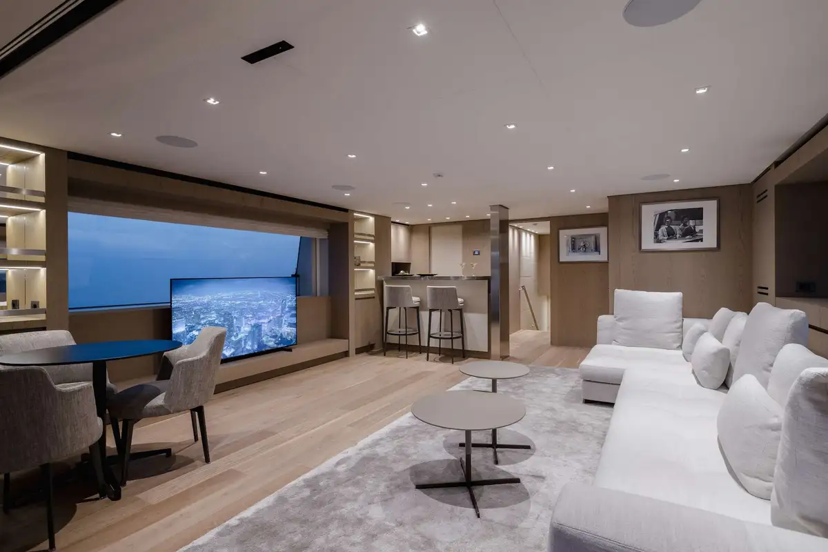 Her sophisticated interior, designed by the renowned Francesco Pazkowski, is thrillingly bright and exquisitely detailed with a welcoming smart-casual vibe. You can slide the glass sides and aft doors of her main deck saloon wide open to enjoy a direct connection with the seascape, or shut out the breeze and preserve the panoramic views from inside. The main deck aft is a sociable lounge and the upper aft deck provides the ideal setting for fine dining in the open air.