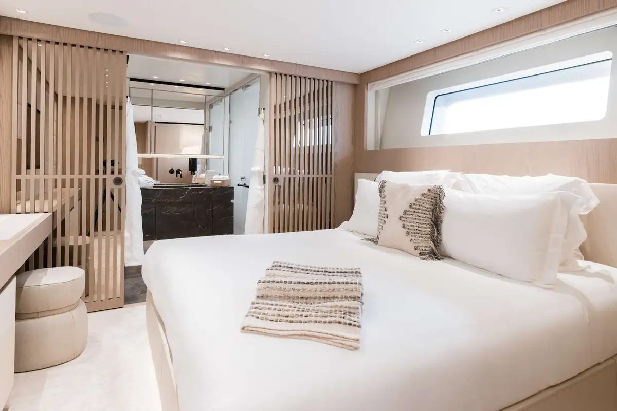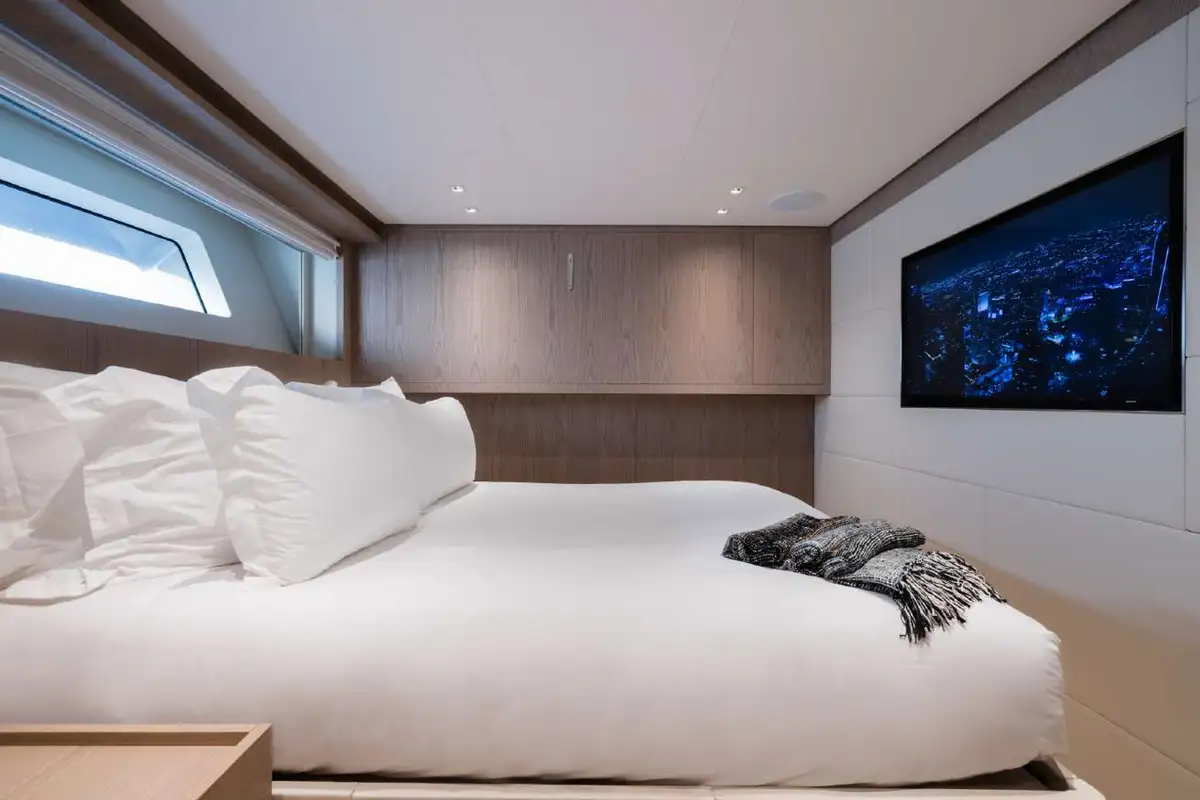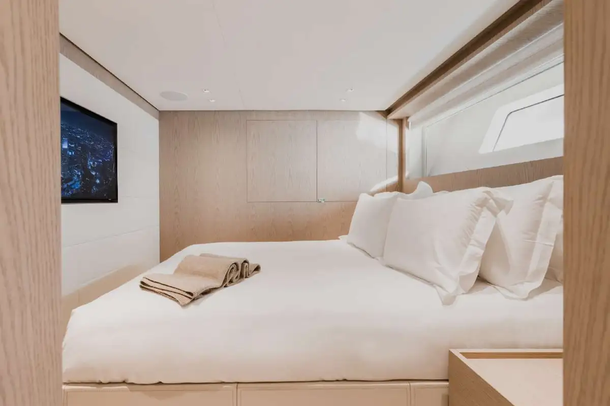 The upper deck saloon is a cosy, stylish lounge with expansive sofas facing a big TV, a games table and a sit-up bar. With the aft doors wide open, it forms another inside-outside space with the exterior aft deck, so the end of a sunset dinner flows naturally into a movie night or cocktails… unless you’d prefer to stay outside and lounge on the full-beam sofas astern.