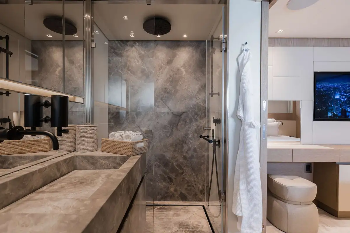 The master suite is an impressive set of rooms at the forward end of the main deck. A private study leads into the bright and beautifully finished full-beam cabin, which has an opulent white marble en suite bathroom with a rain room shower. The lower deck cabins – doubles and convertible doubles-to-twins – are also notably bright, with their own marble bathrooms.