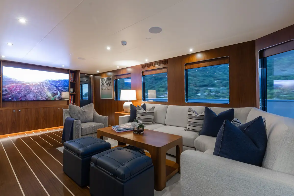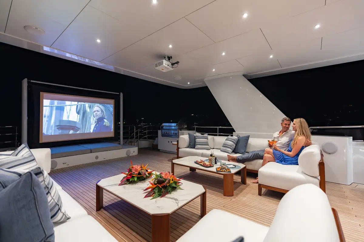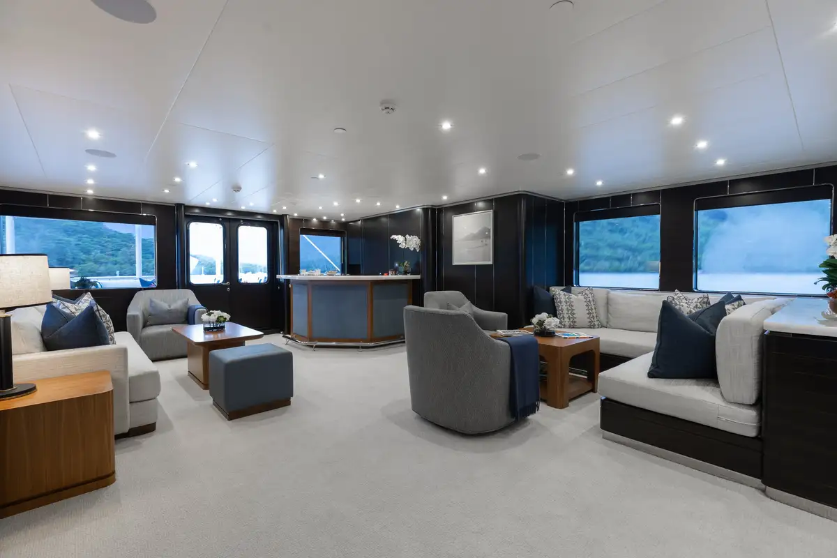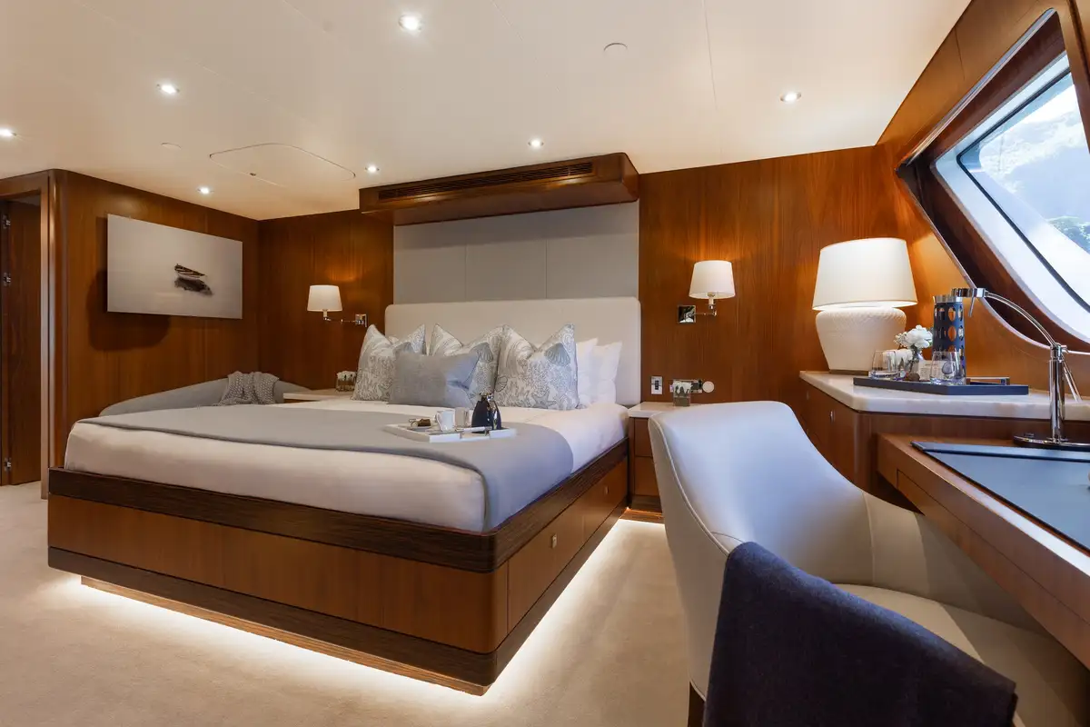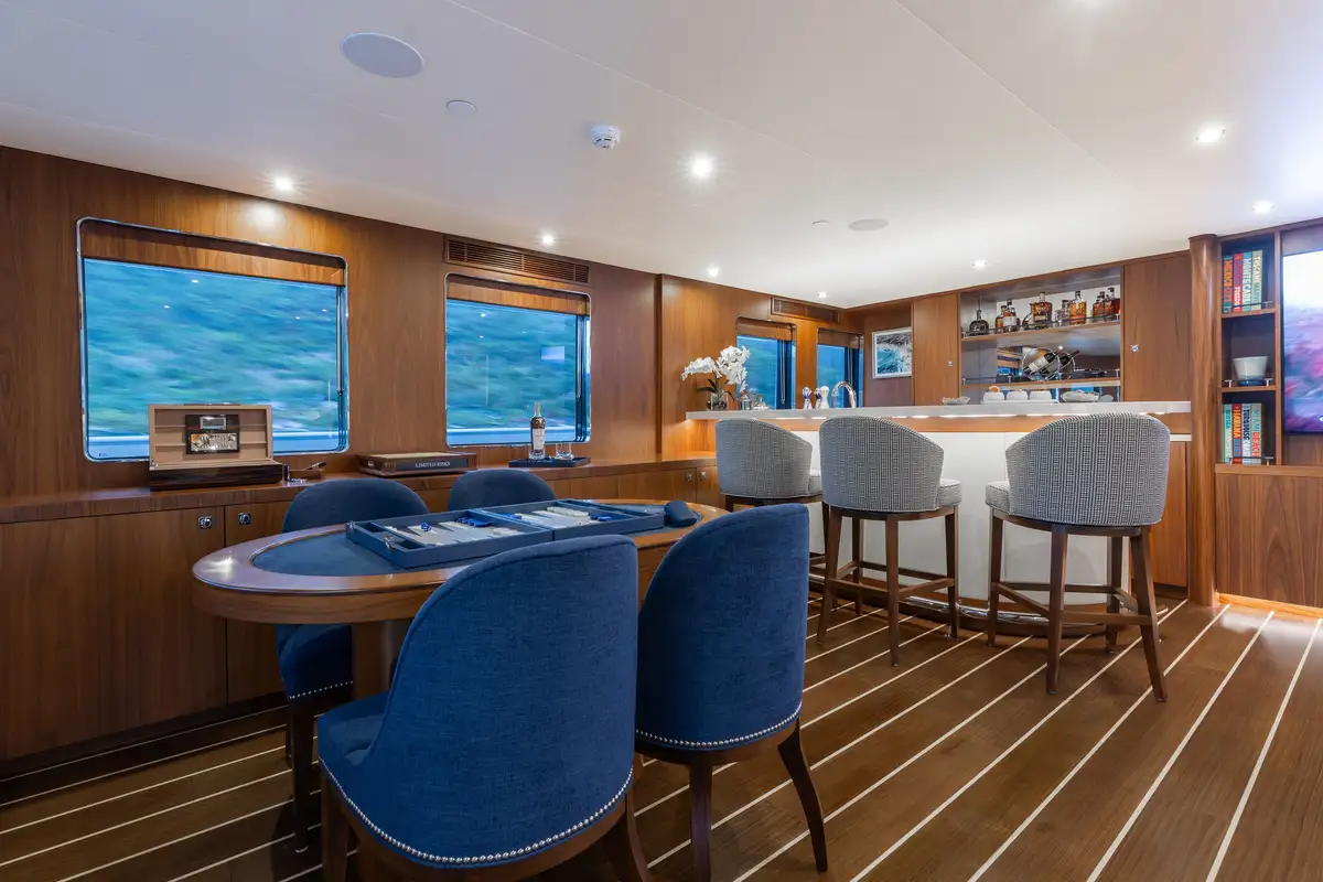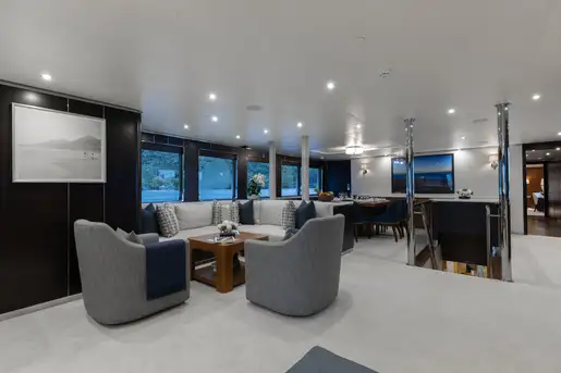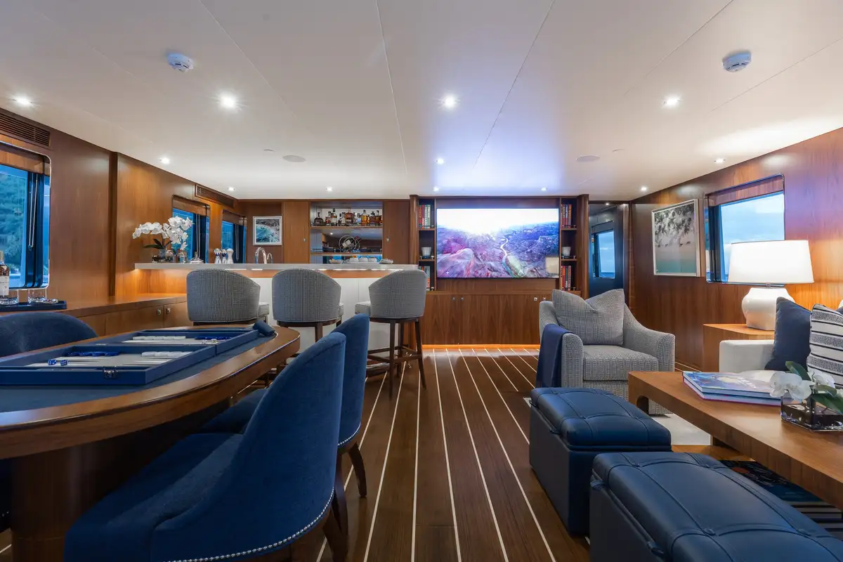 Up to 11 guests can be comfortably accommodated across five well-appointed cabins, making her equally suited to families or groups of friends. Inside, the main deck offers a welcoming lounge, dining area and bar, while the sky lounge sets the scene for post-dinner cocktails or lively boardgames.