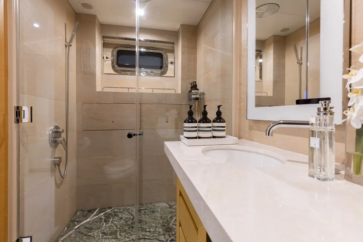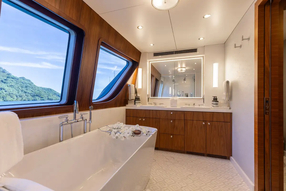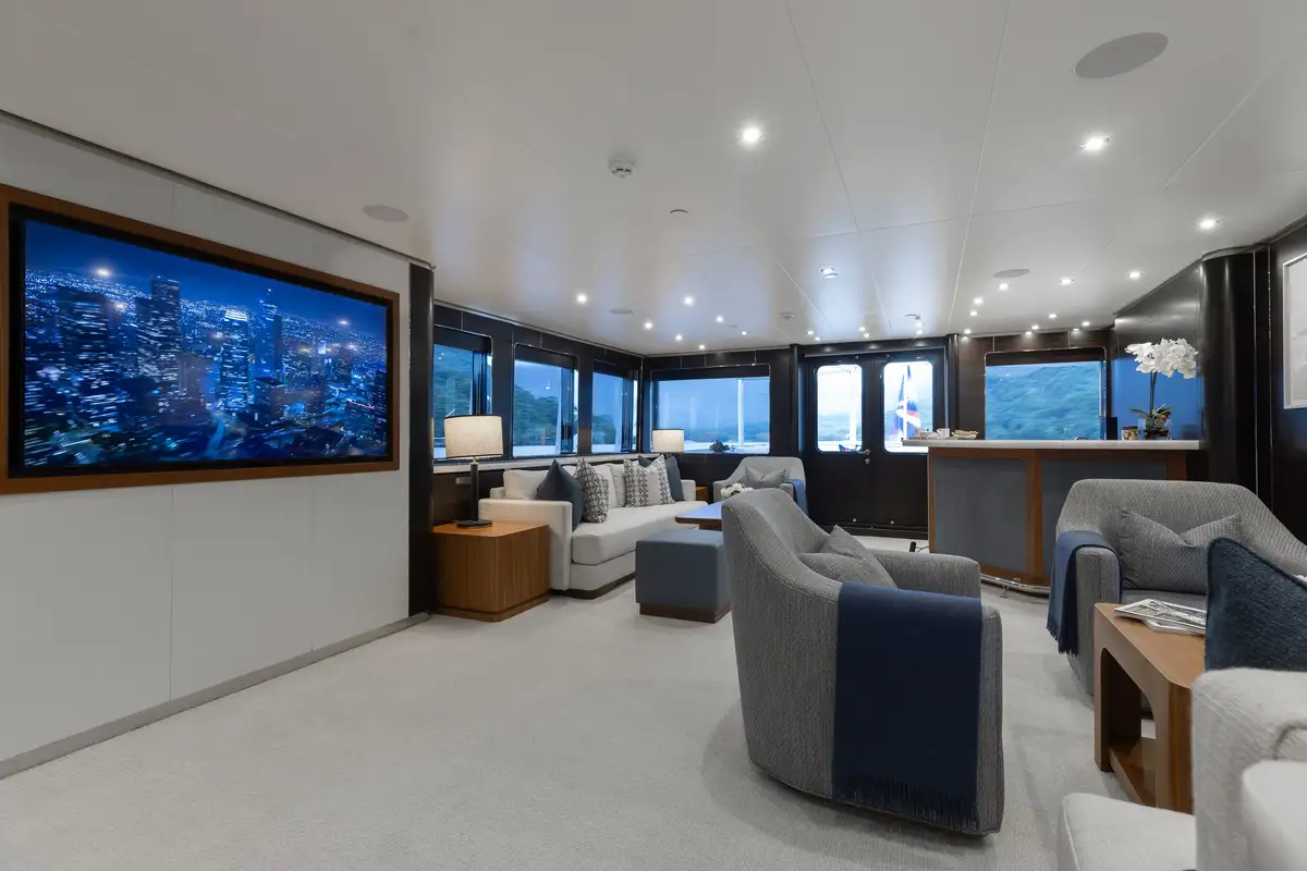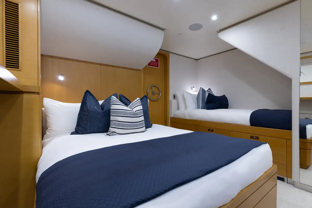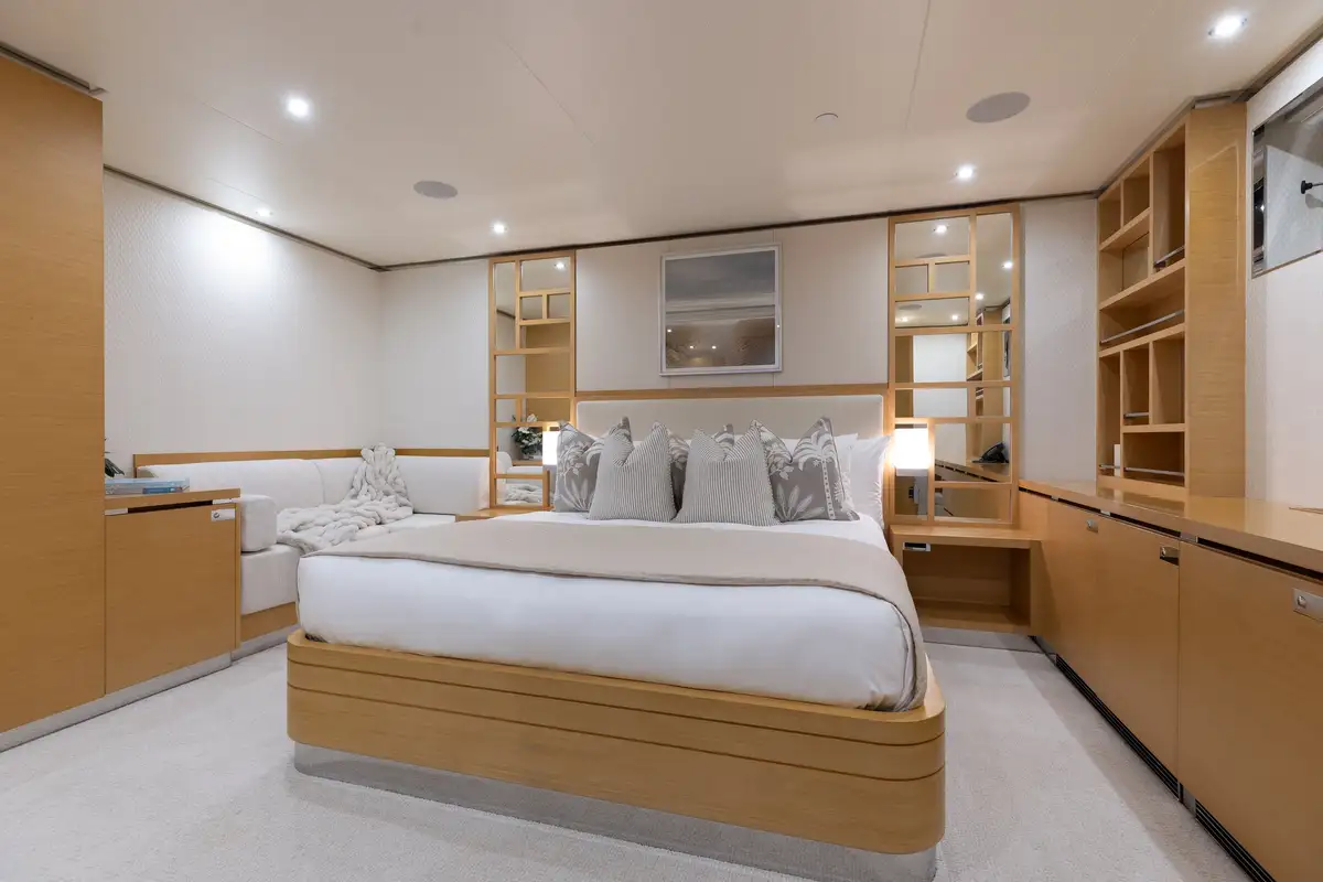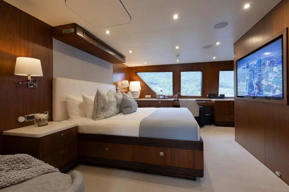 Up to 11 guests can be comfortably accommodated across five well-appointed cabins, making her equally suited to families or groups of friends. Inside, the main deck offers a welcoming lounge, dining area and bar, while the sky lounge sets the scene for post-dinner cocktails or lively boardgames.