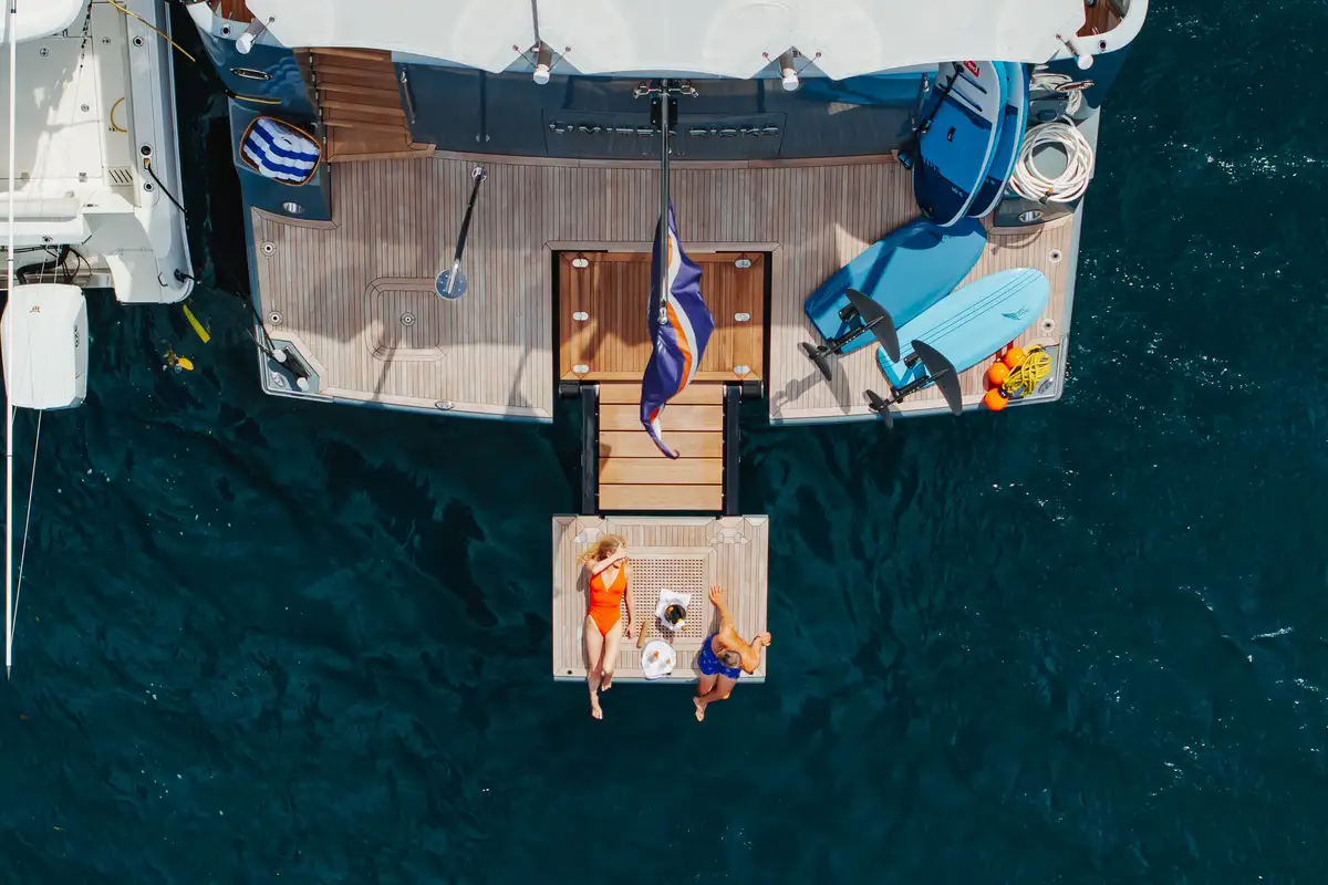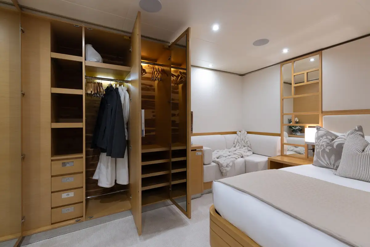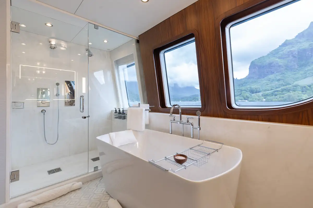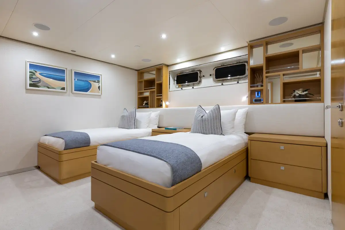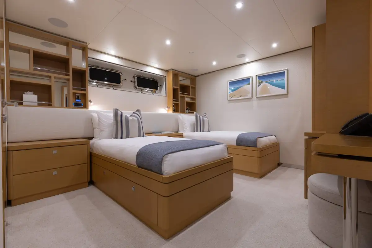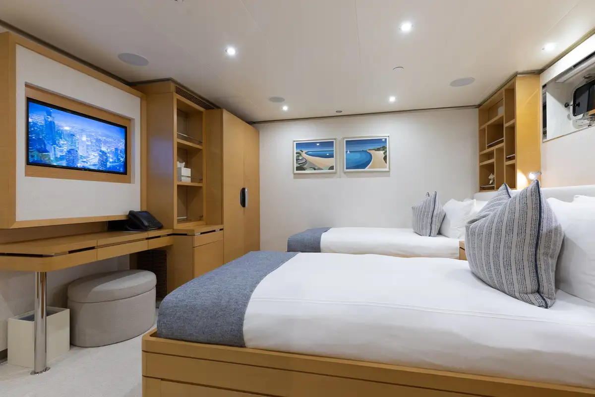 Up to 11 guests can be comfortably accommodated across five well-appointed cabins, making her equally suited to families or groups of friends. Inside, the main deck offers a welcoming lounge, dining area and bar, while the sky lounge sets the scene for post-dinner cocktails or lively boardgames.
