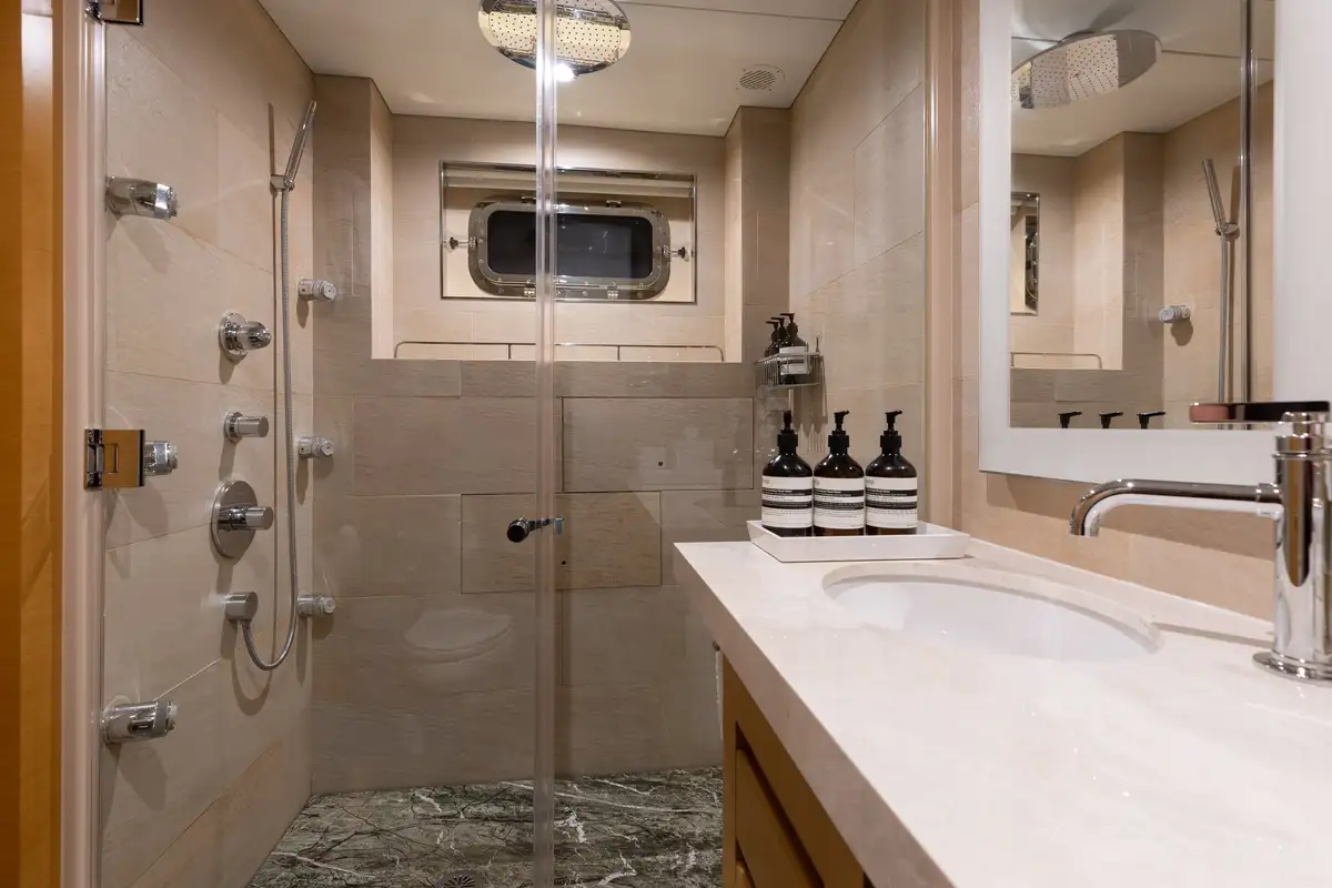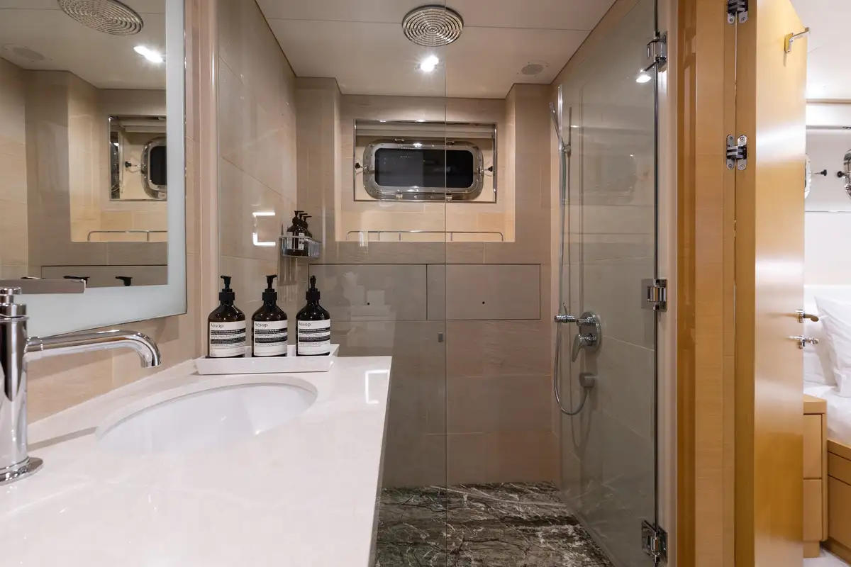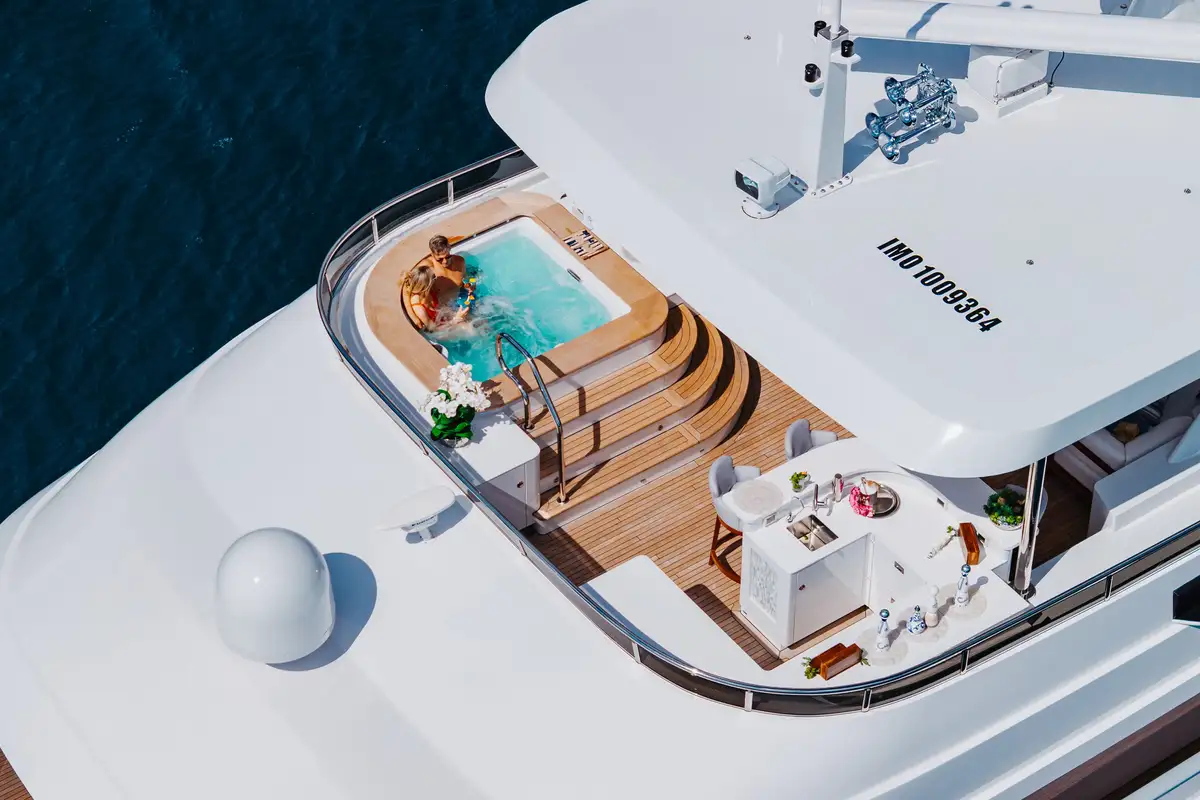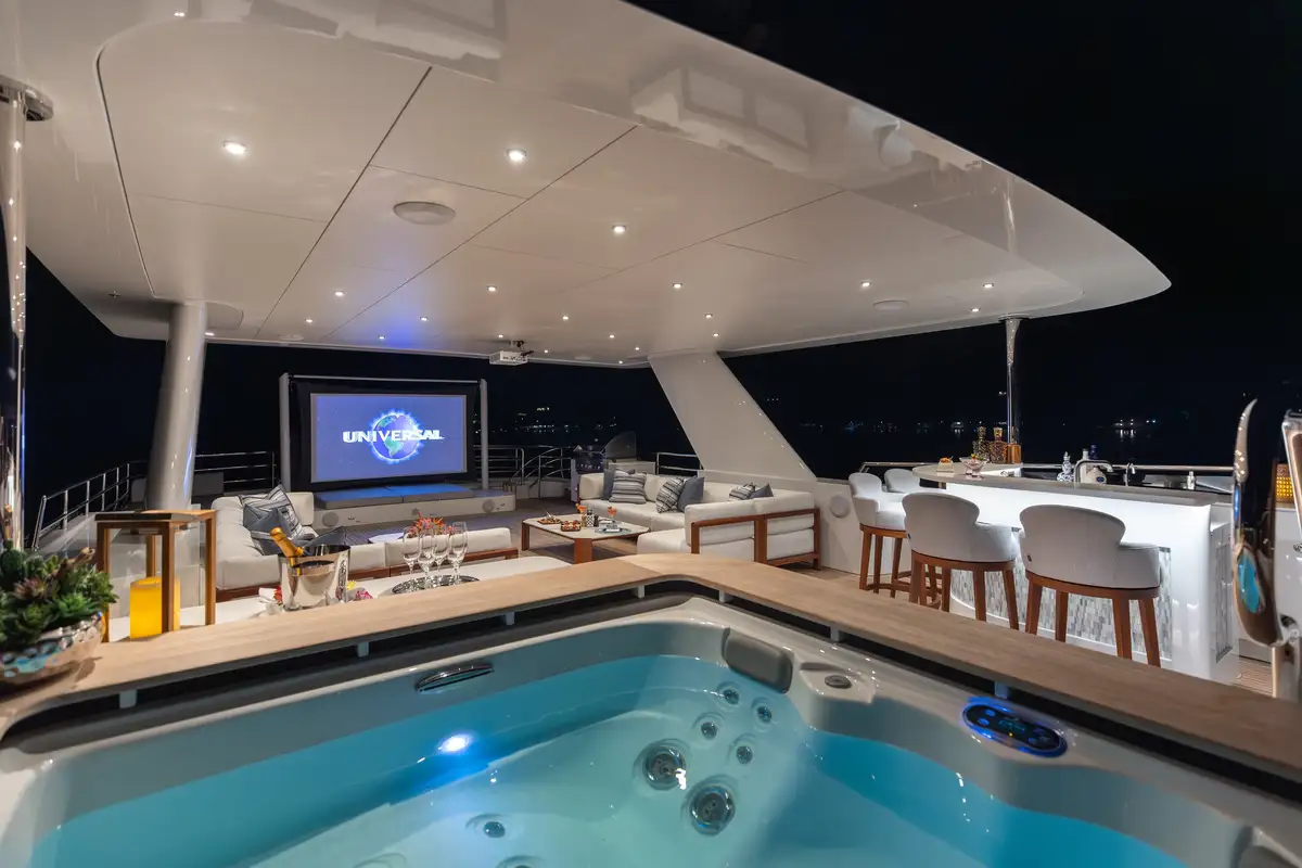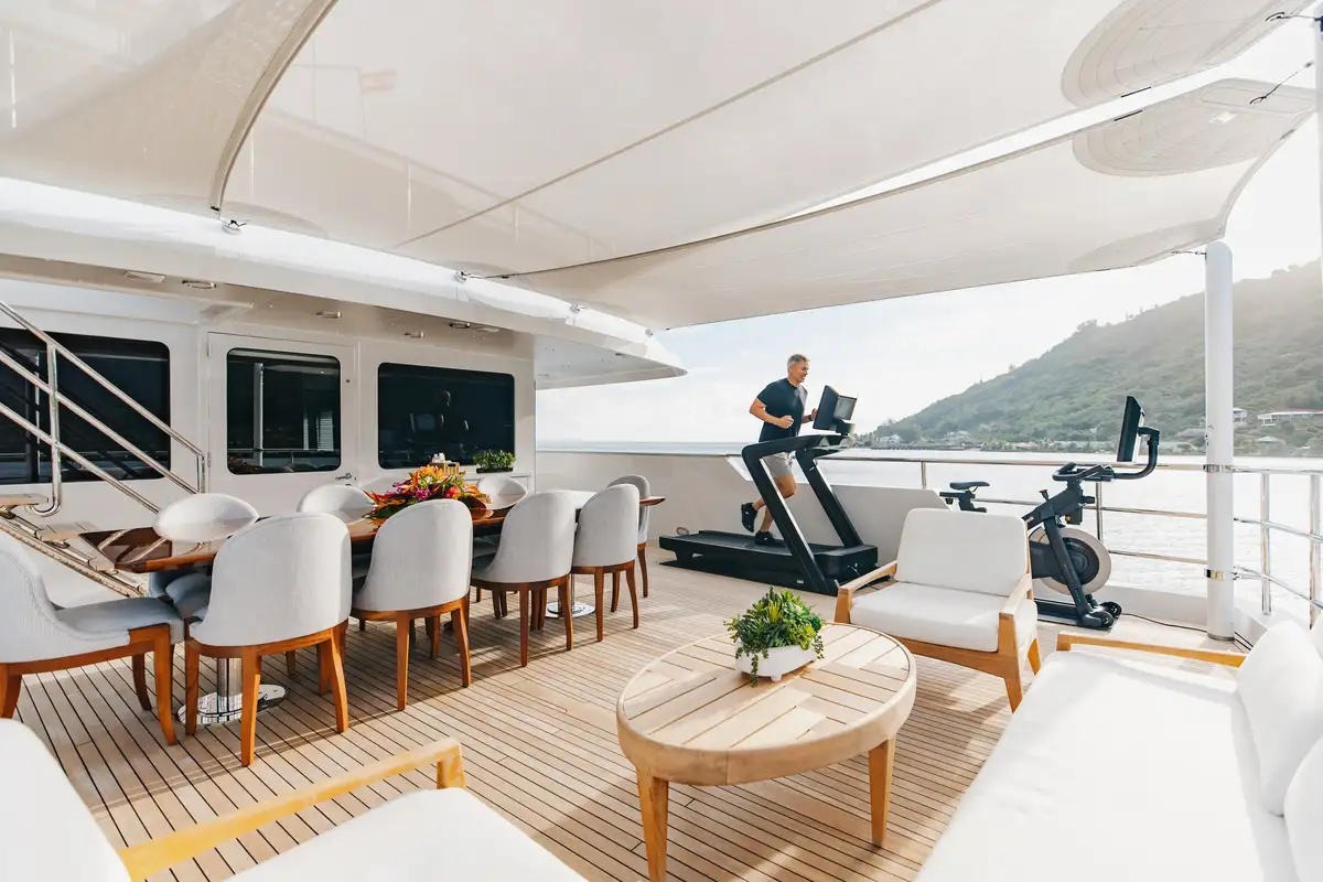 Outdoors, guests can enjoy shaded breakfasts on the main deck aft, unwind on the sun deck with its jacuzzi, BBQ and outdoor cinema, or dine al fresco on the bridge deck. A well-equipped gym area keeps fitness fans happy, while a wide selection of tenders and toys ensures endless fun on the water. The large swim platform makes access effortless, and stabilisers guarantee comfort both underway and at anchor.