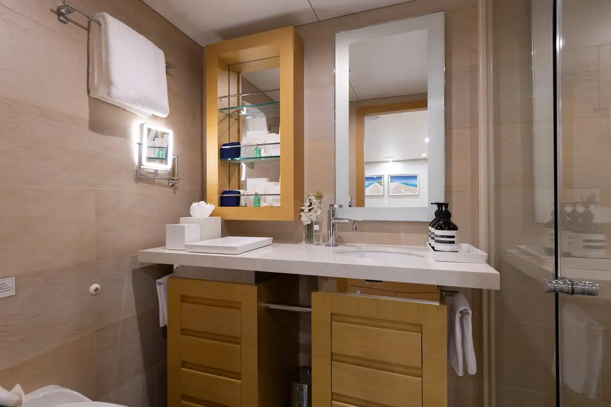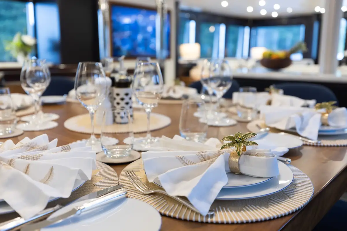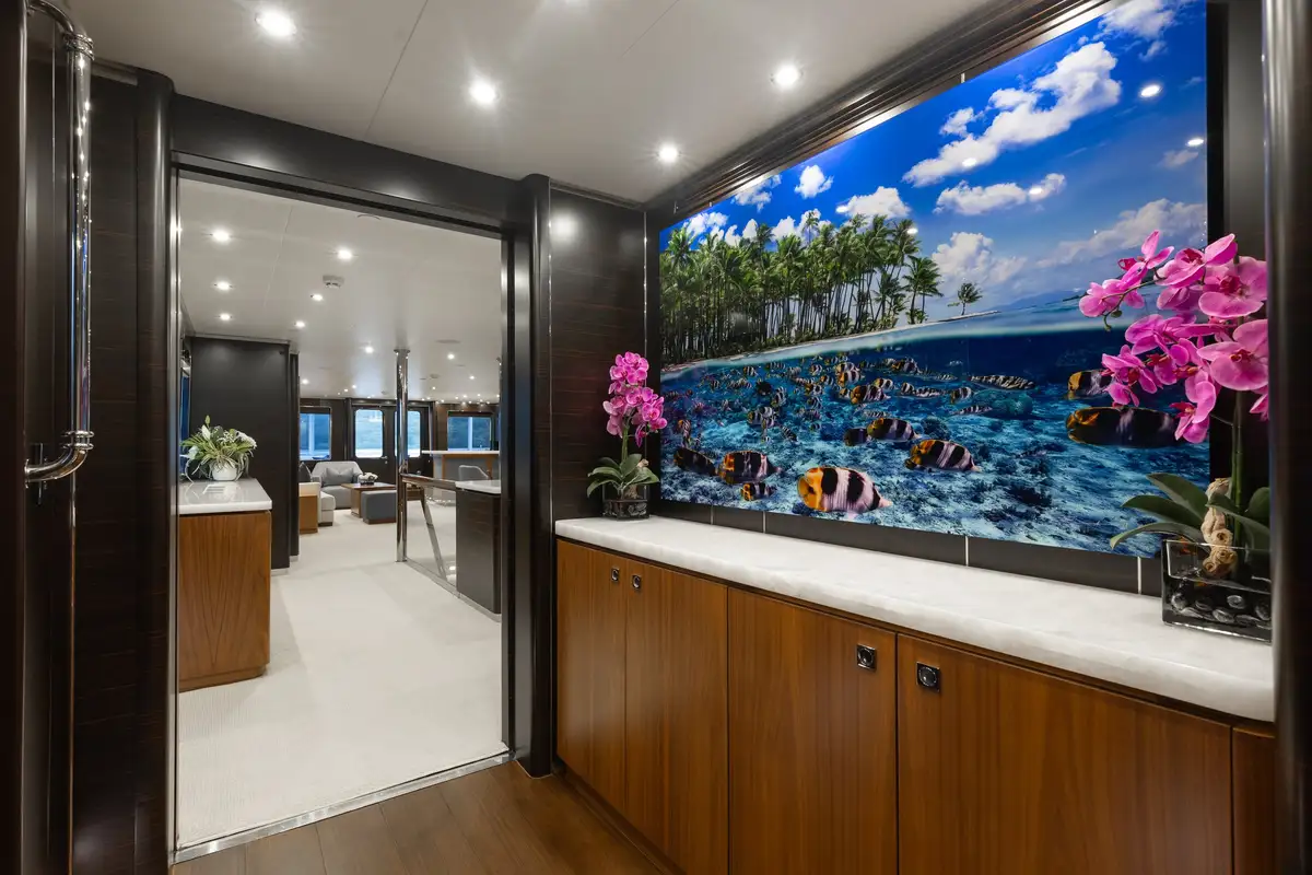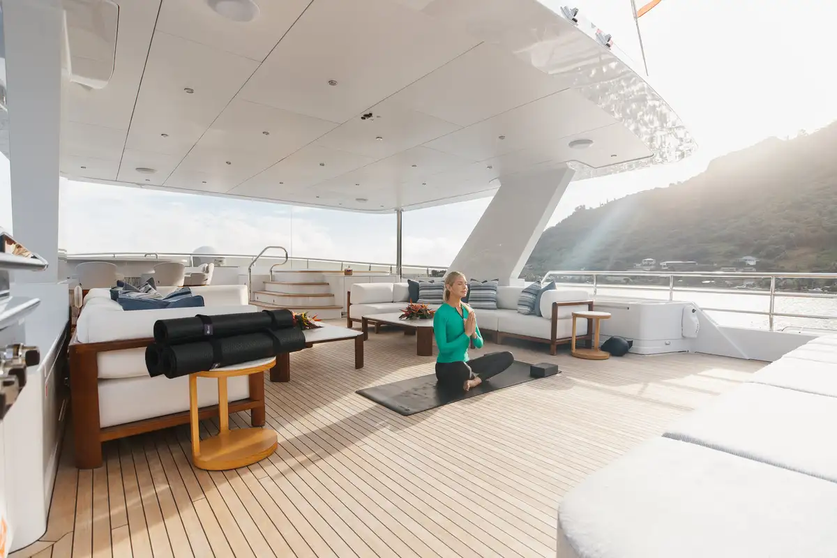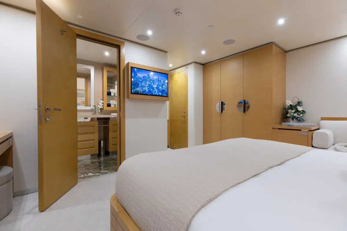 Outdoors, guests can enjoy shaded breakfasts on the main deck aft, unwind on the sun deck with its jacuzzi, BBQ and outdoor cinema, or dine al fresco on the bridge deck. A well-equipped gym area keeps fitness fans happy, while a wide selection of tenders and toys ensures endless fun on the water. The large swim platform makes access effortless, and stabilisers guarantee comfort both underway and at anchor.