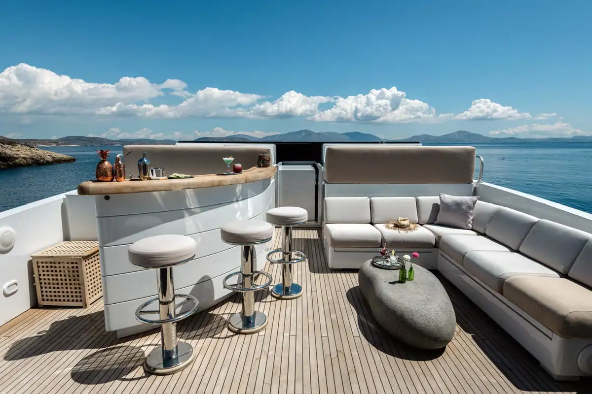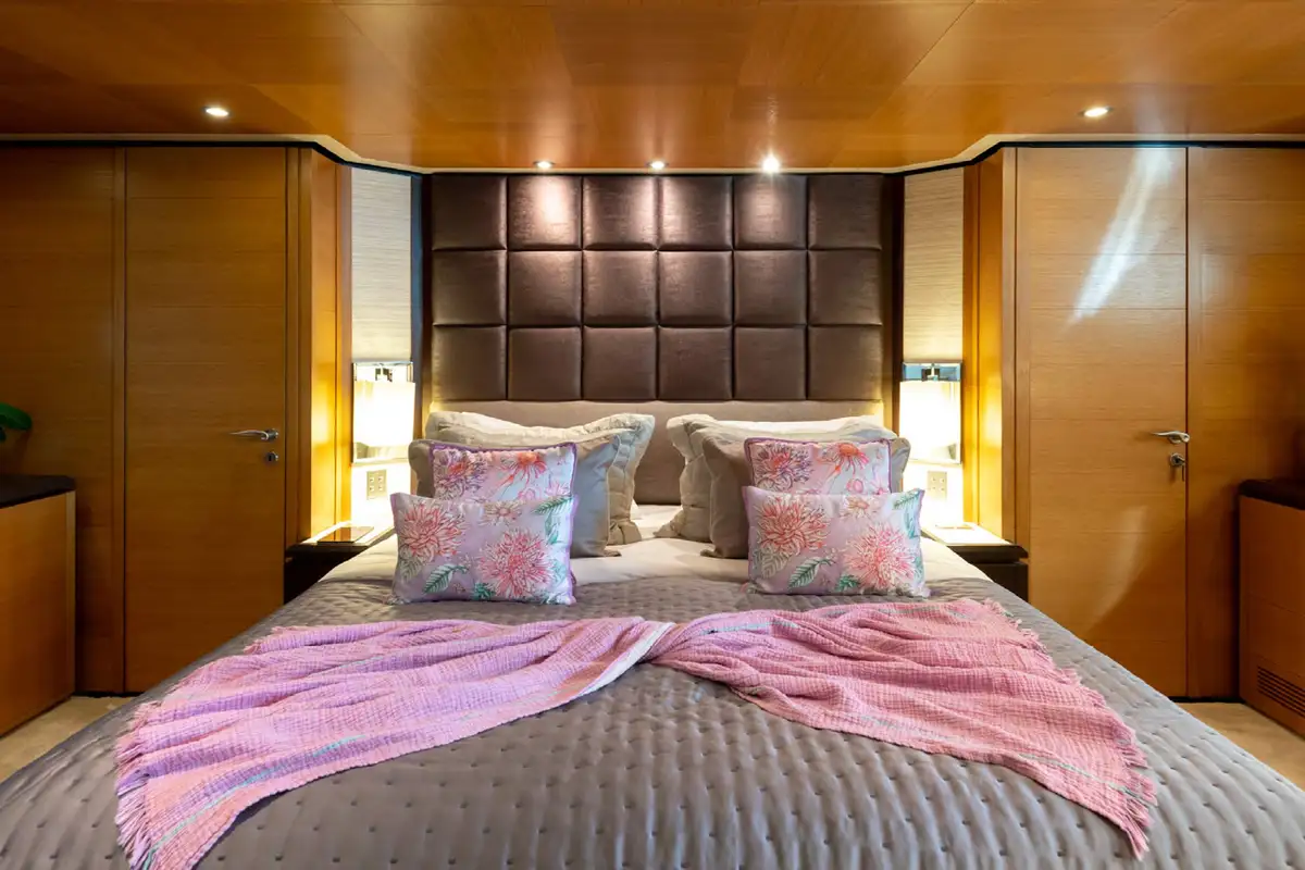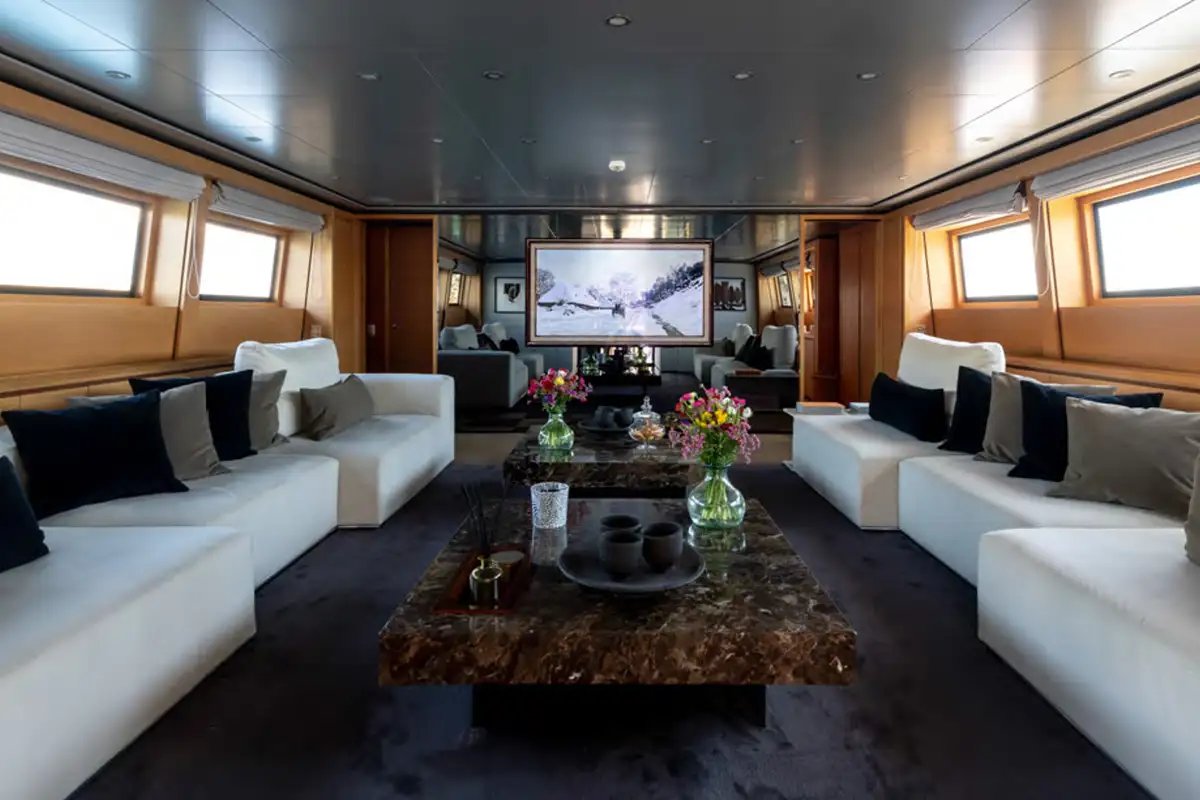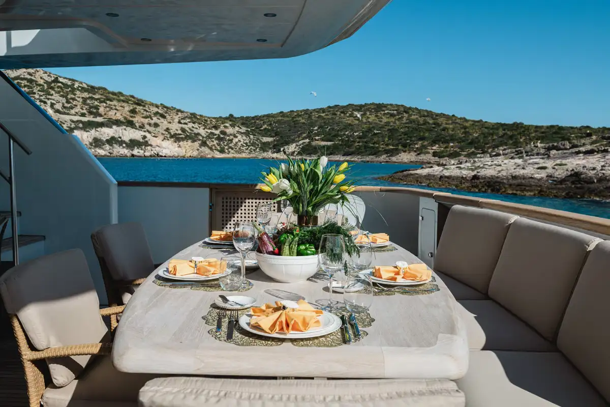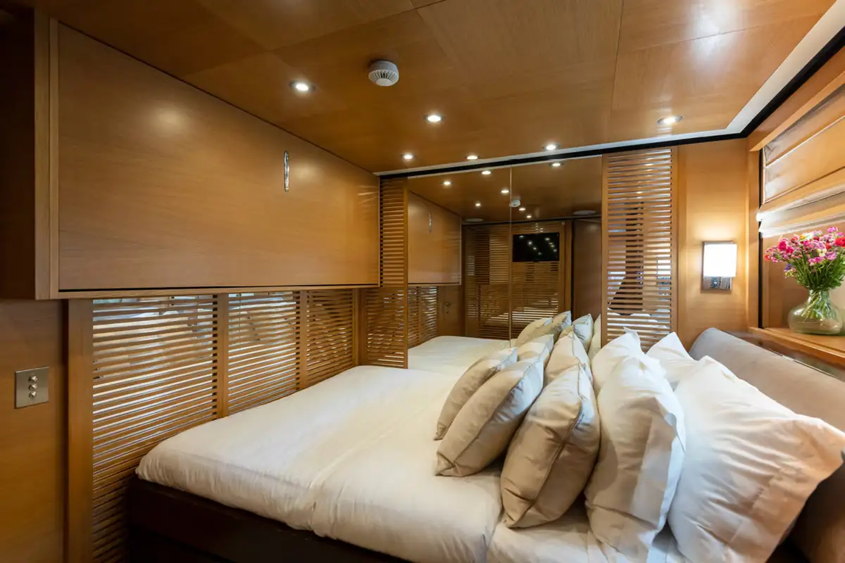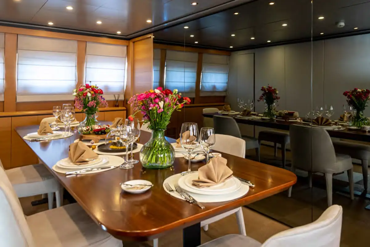 Step aboard and discover interiors that balance sophistication and warmth. On the main deck, the lounge is an inviting space of mirrored surfaces and rich wood finishes, enhancing natural light and creating a serene setting for socialising. The dining area welcomes up to 10 guests, with a galley nearby that can seamlessly pivot from relaxed meals to elegant entertaining.