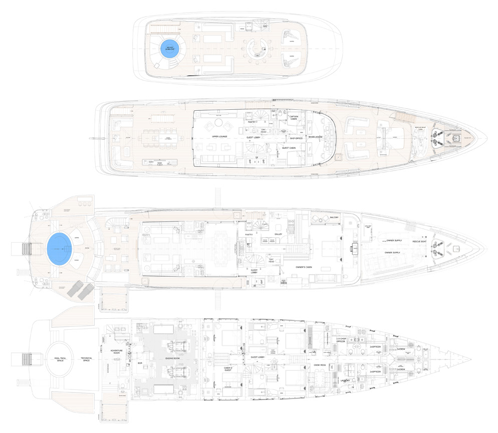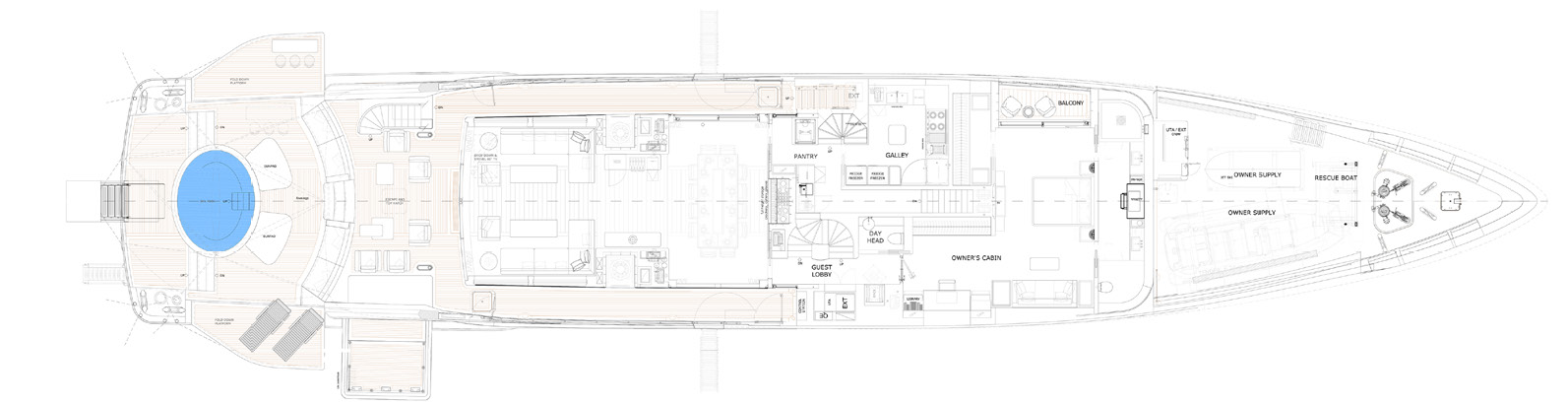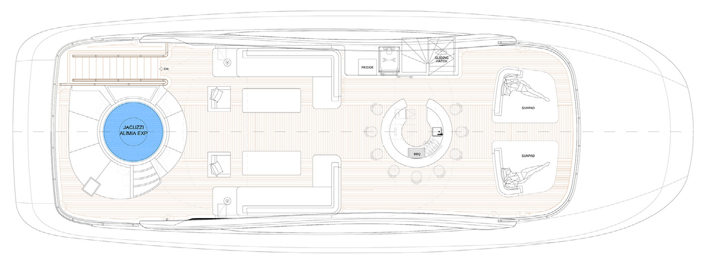 The main deck aft is without doubt the highlight on board LUMIERE, with a vast space designed to bring you as close to the water as possible. With fold-out side balconies on the aft platform, as well as a central circular jacuzzi flanked by sun loungers and seating areas, it's the perfect place to relax and enjoy the day, and an incredibly luxurious feature that is a rarity among her size range.
