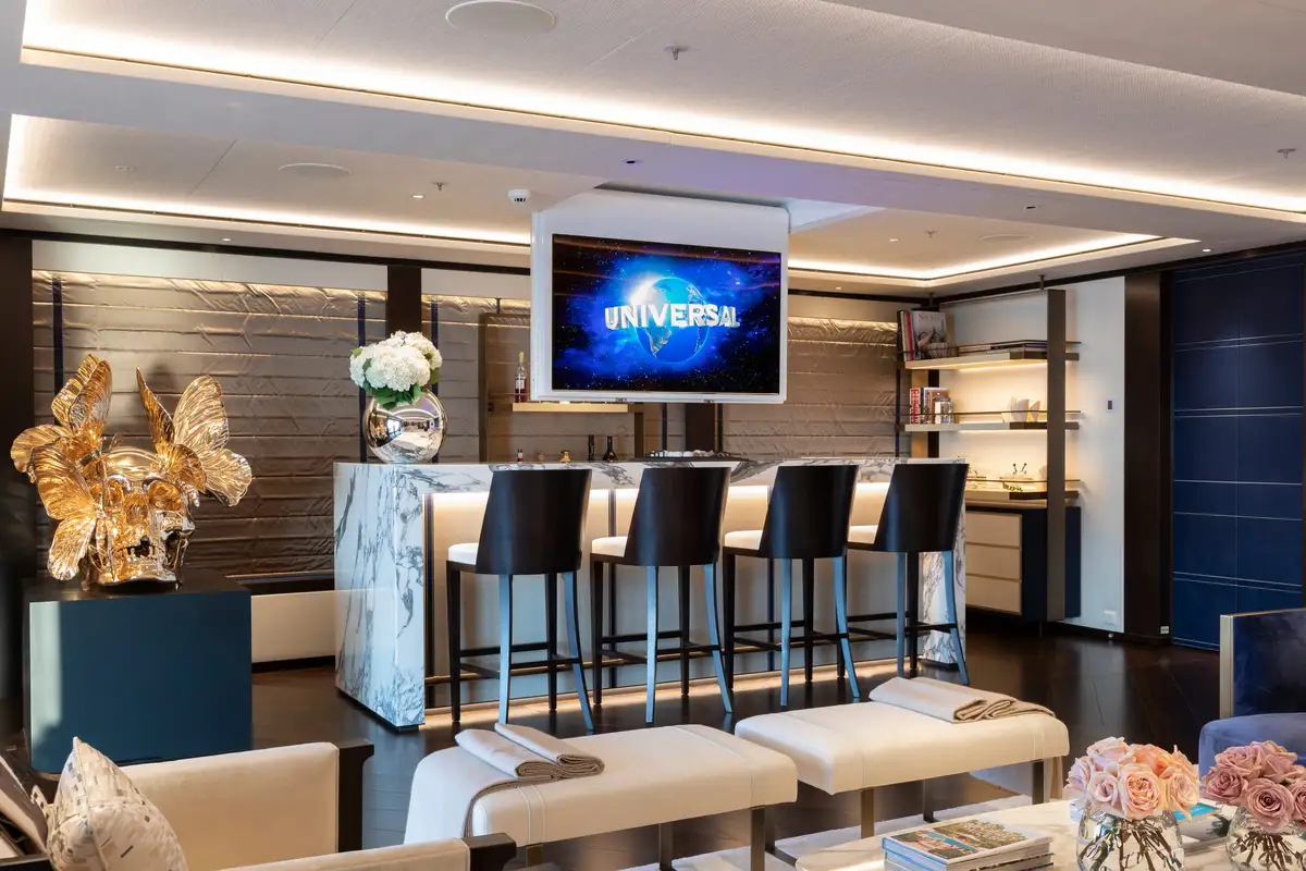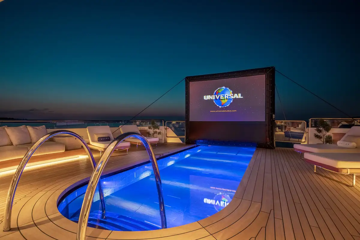 One of her stand out features is the beach club on the lower deck, reached via a beautiful spiral staircase or by the elevator serving lower to bridge decks, making her wheelchair friendly. To port is a fully equipped gym with fold out sea terrace where guests can work out while enjoying sea views. To starboard is the beach club, also with a sea terrace, where guests can watch the sunset or the family play while enjoying a drink from the bar in the centre.