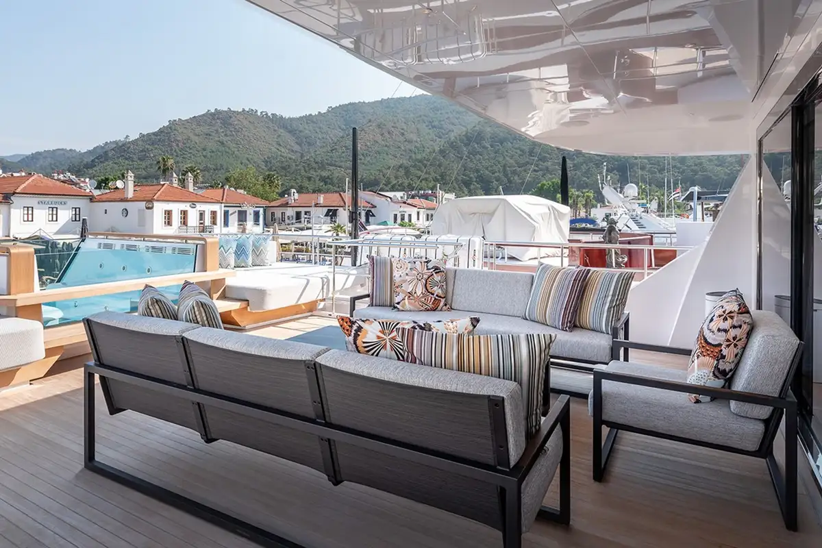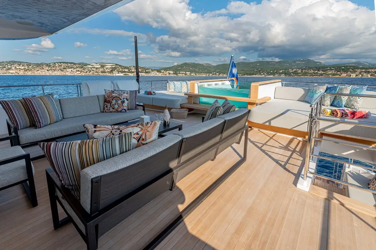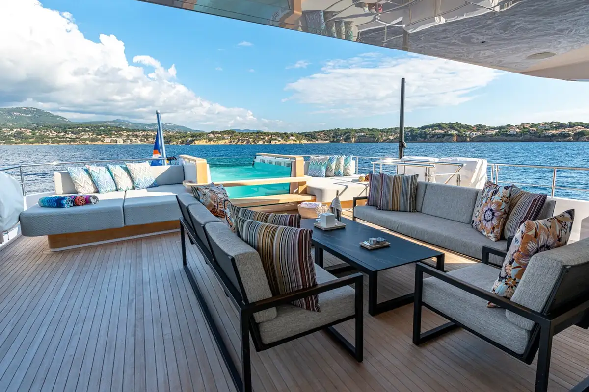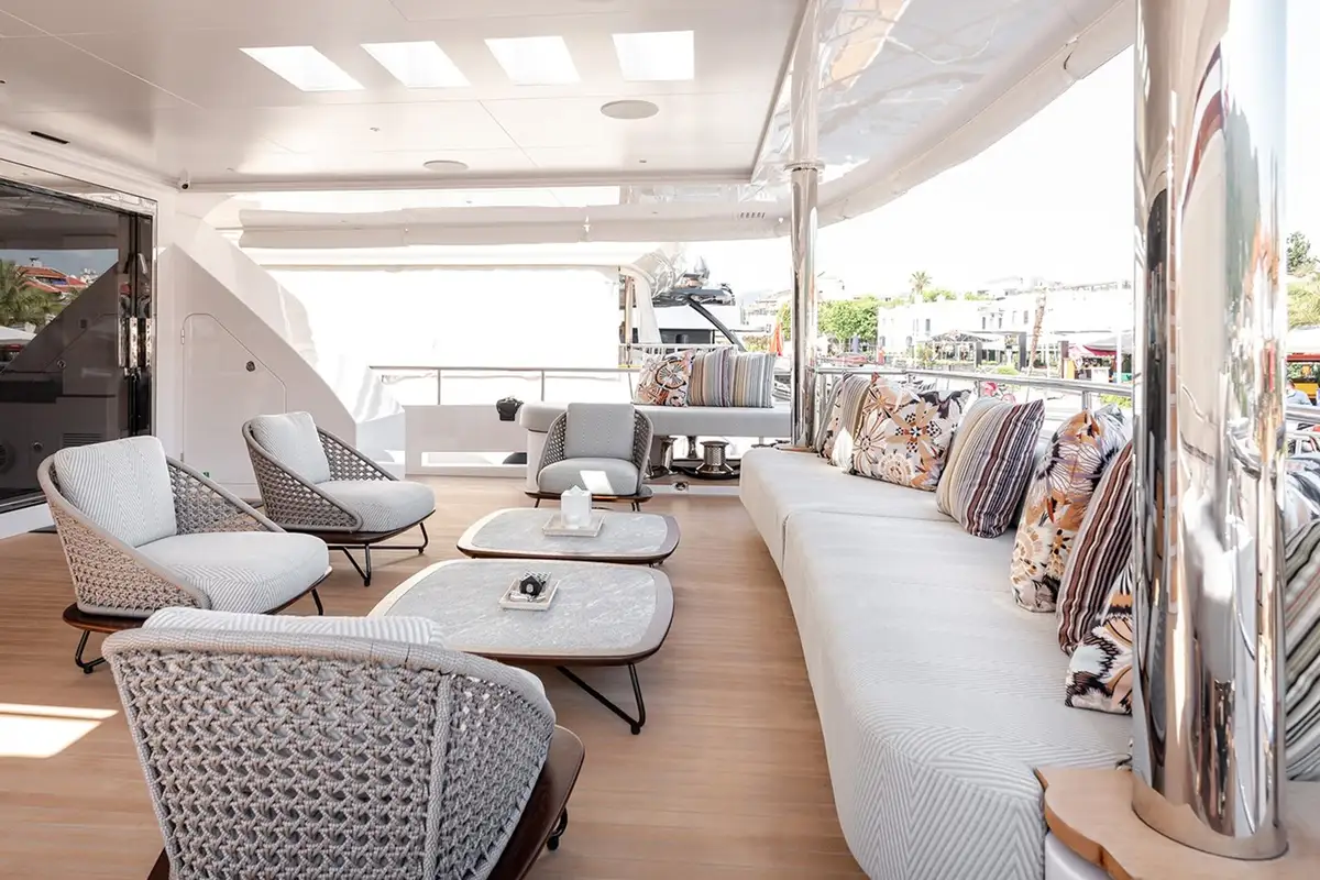 Outside, M55 excels in delivering a luxurious al fresco lifestyle. The sun deck features expansive sunbathing areas and looks onto the foredeck jacuzzi. On the upper deck aft, a spa pool is complemented by a stylish lounge area, giving sophisticated setting for sunset cocktails or social gatherings.