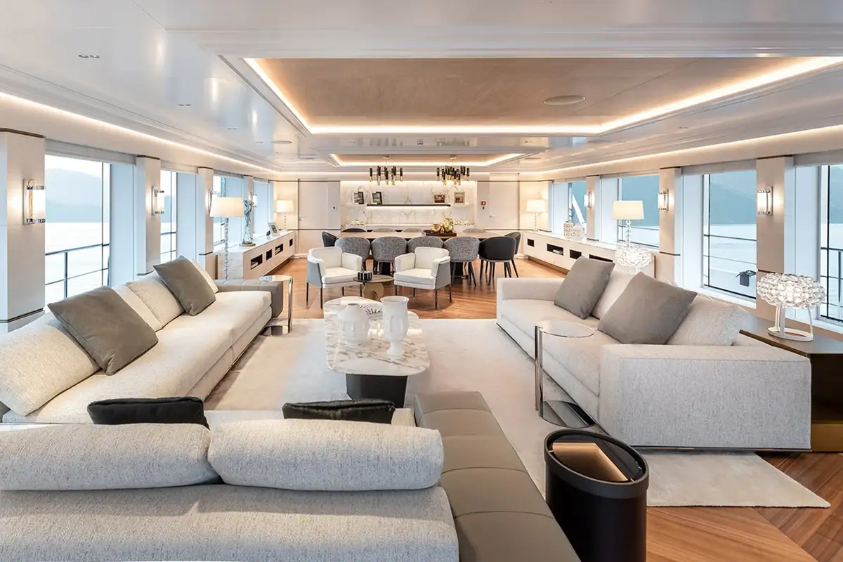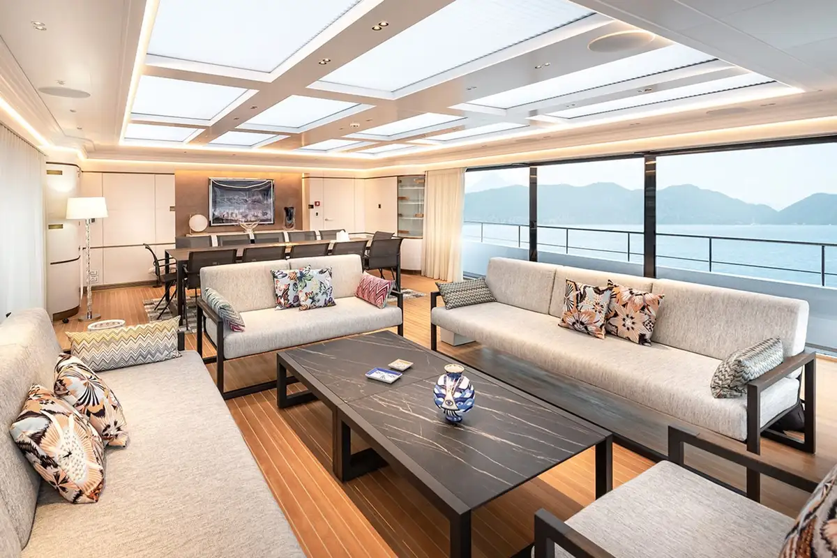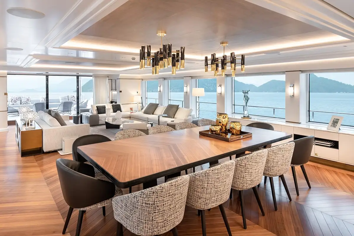 The main deck lounge is a refined and inviting space, designed for both relaxation and entertaining, with plush seating, modern furnishings, and abundant natural light. Her formal dining area is equally elegant, offering the perfect setting for intimate meals or celebratory occasions.