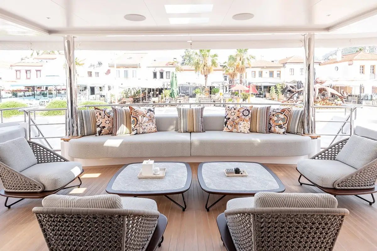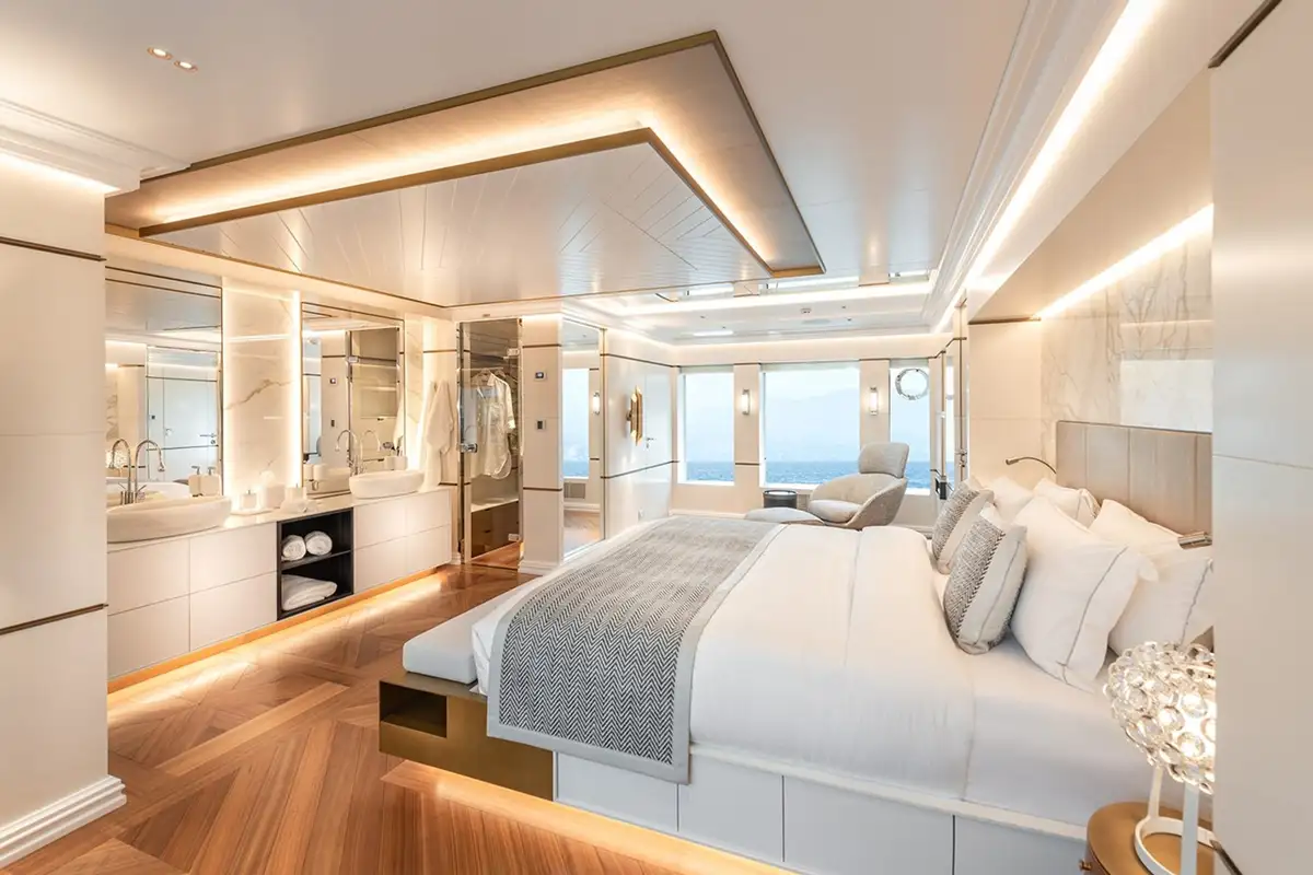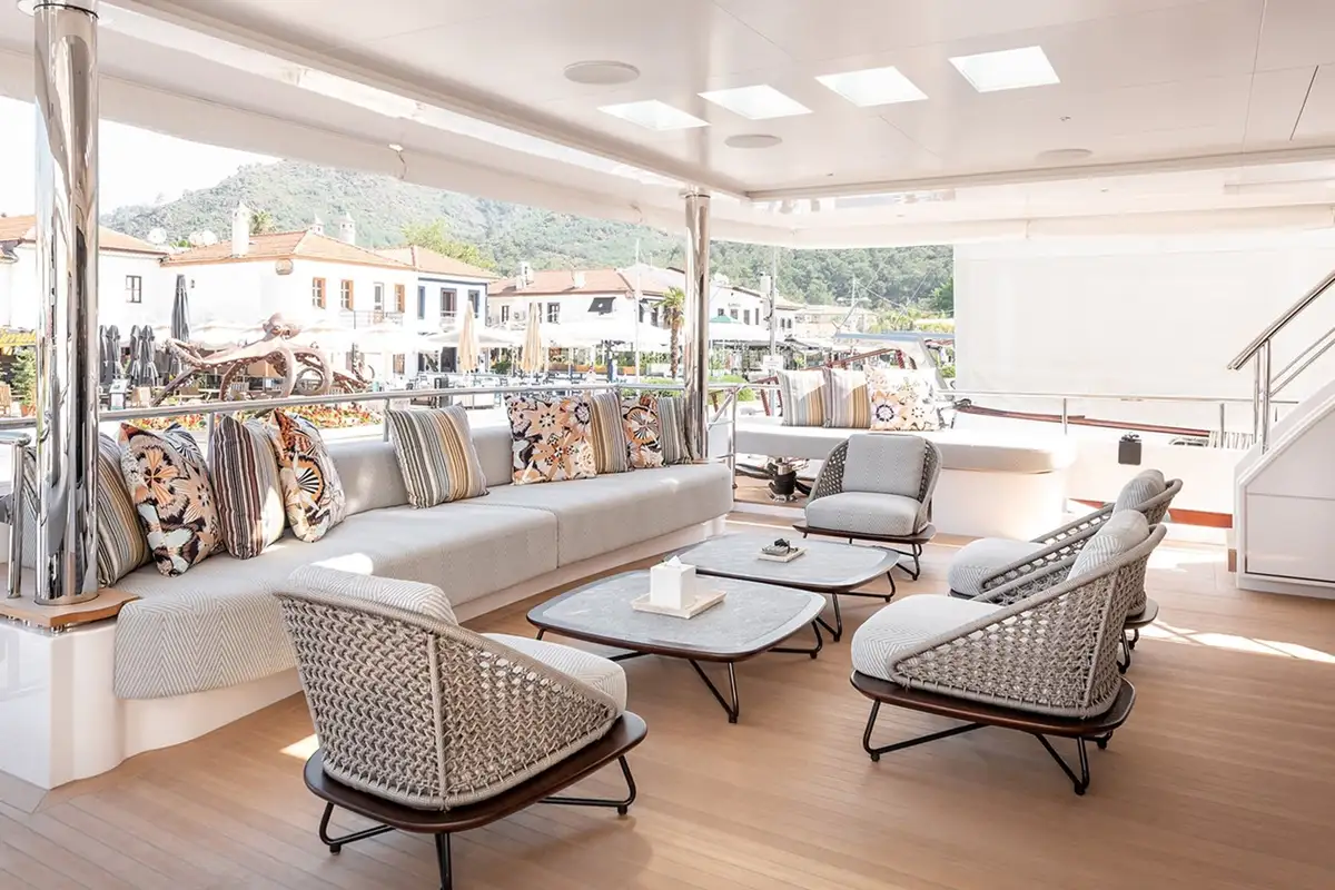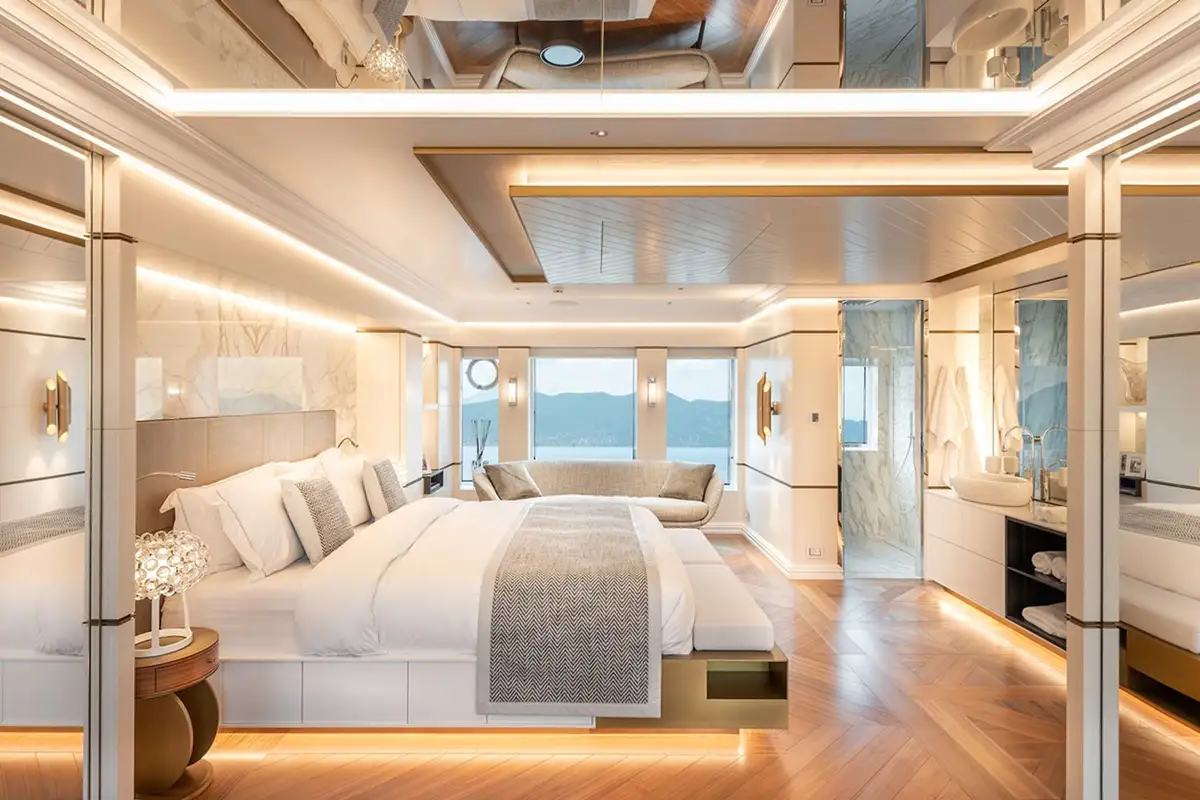 The main deck lounge is a refined and inviting space, designed for both relaxation and entertaining, with plush seating, modern furnishings, and abundant natural light. Her formal dining area is equally elegant, offering the perfect setting for intimate meals or celebratory occasions.