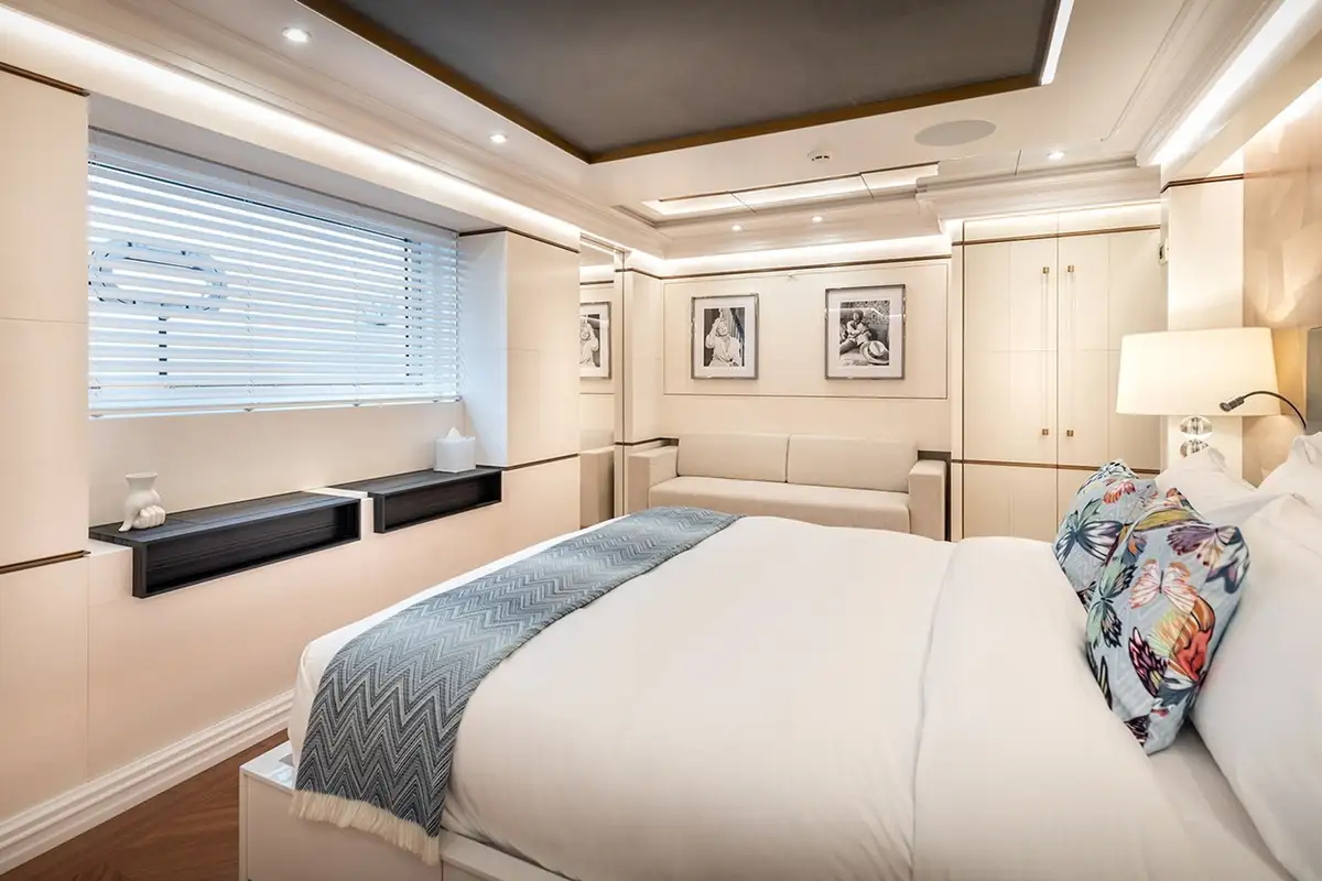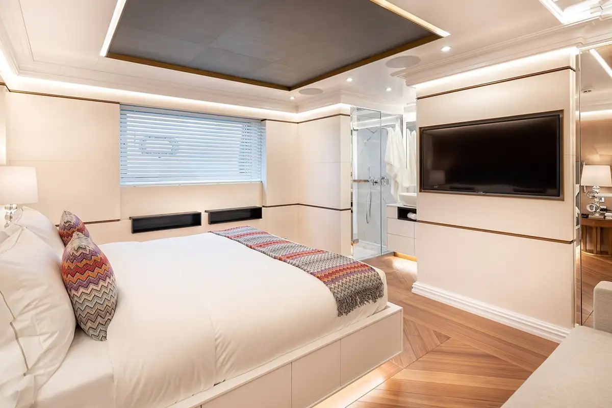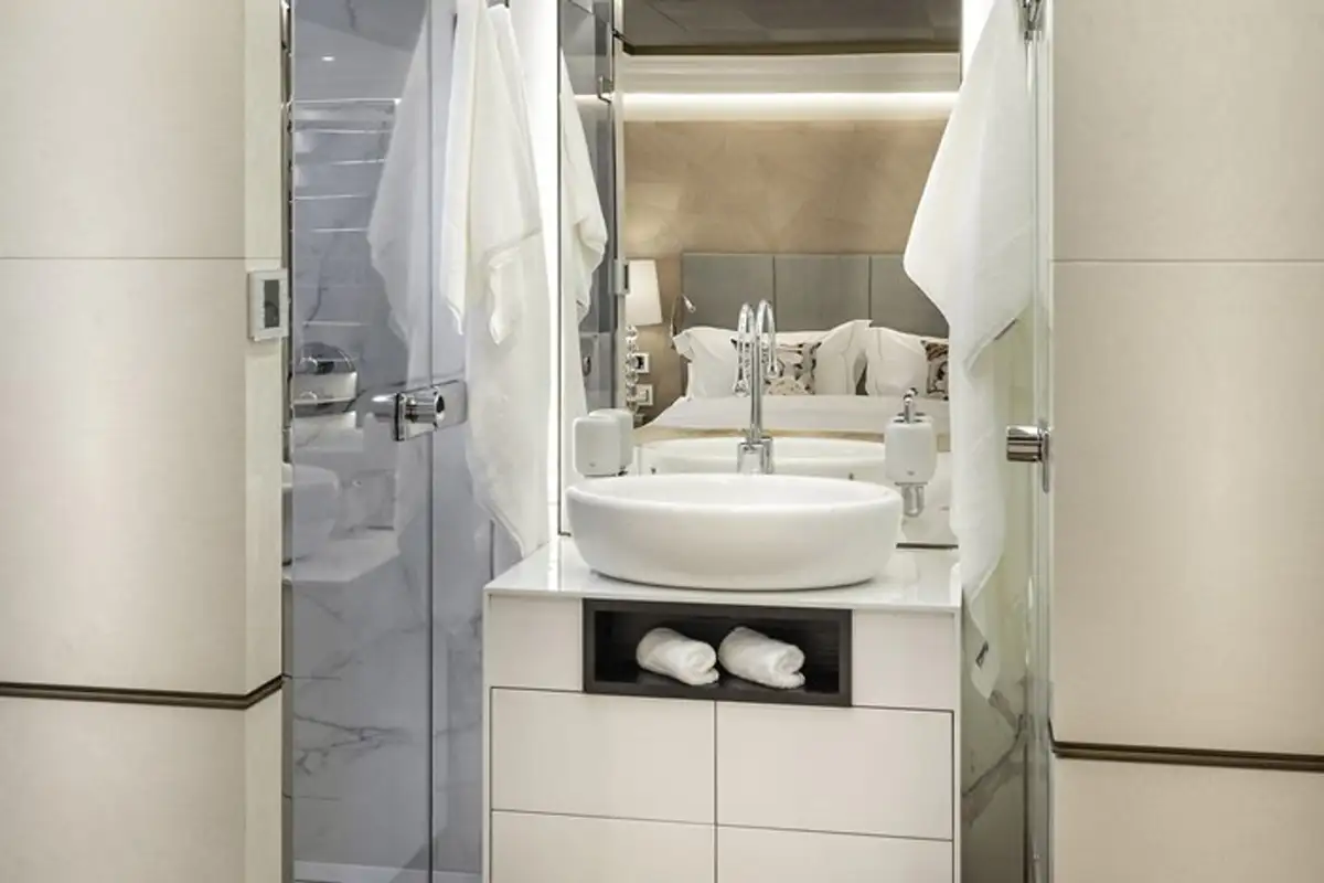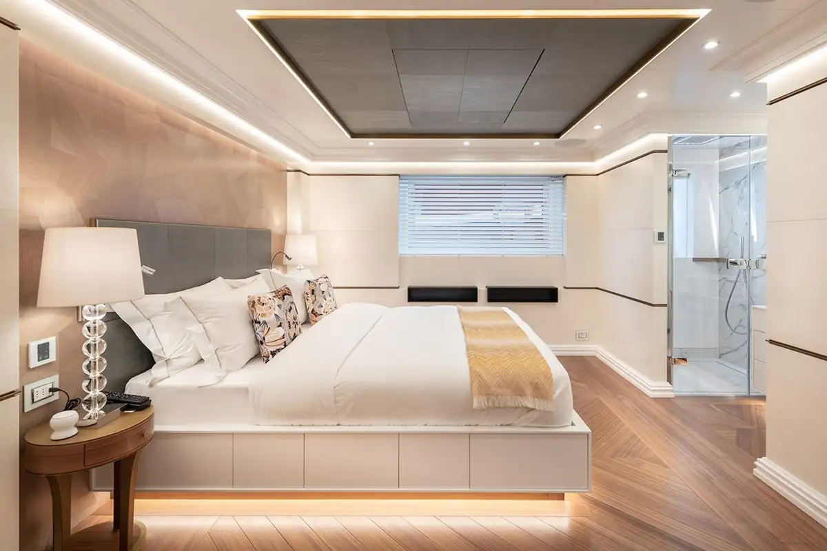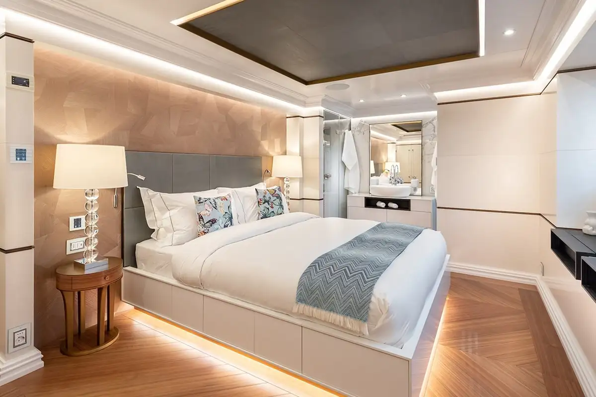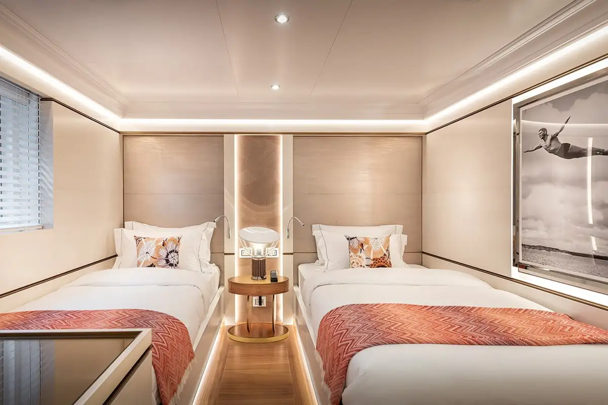 Accommodating up to 12 guests in six beautifully appointed en suite cabins, M55 offers a layout rarely found on yachts of this size. The full-beam master suite is located on the main deck forward and features a king-size bed and panoramic views. On the lower deck, guests will find three stylish VIP cabins, including a rare full-beam transversal VIP cabin with its own lounge area, alongside a comfortable twin cabin which is ideal for children or staff.