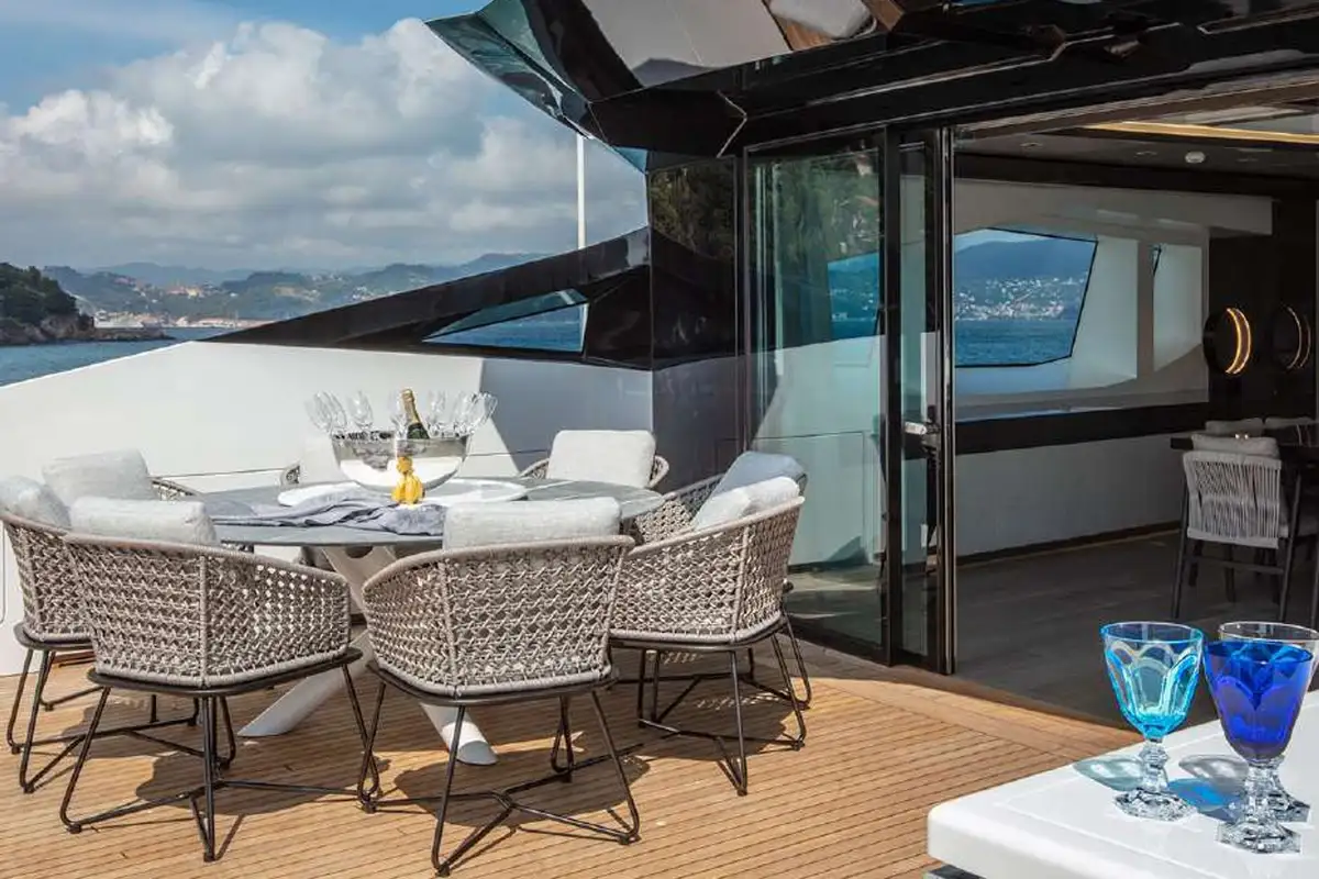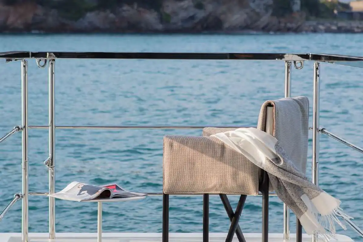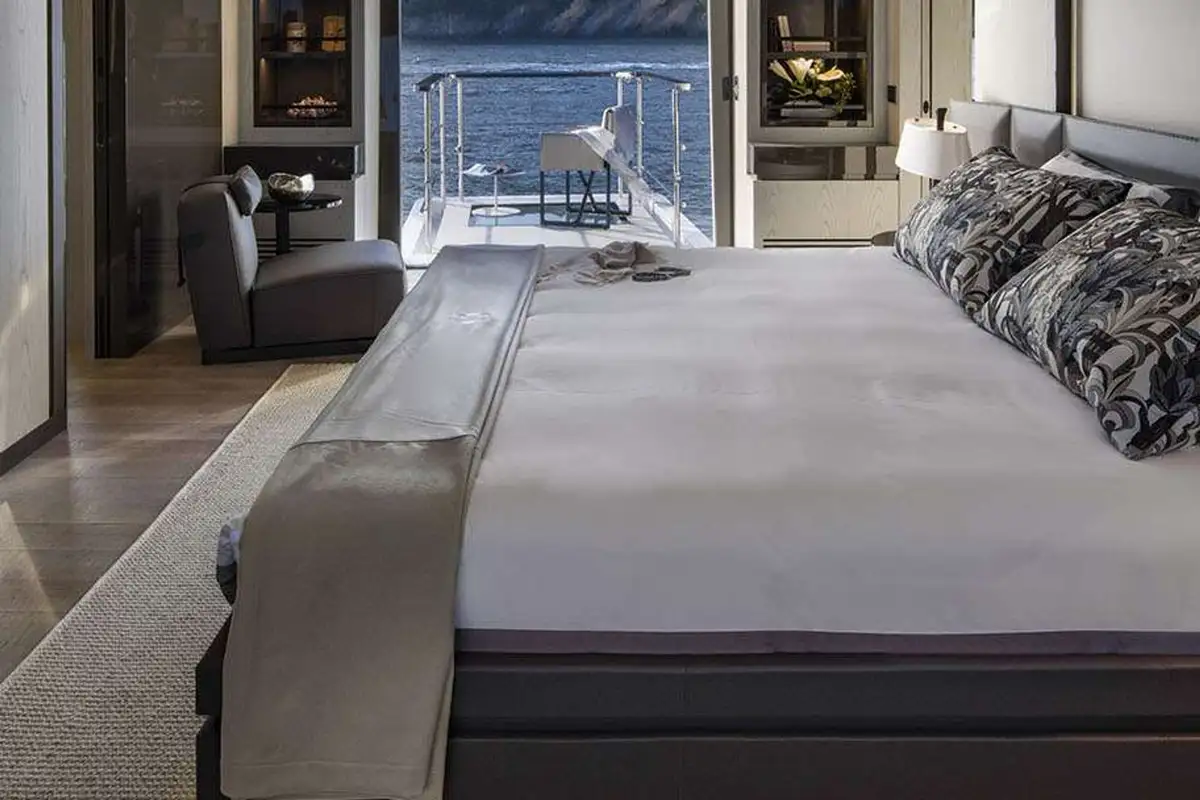 Your charter party will find five guest suites to sleep up to 12, each sumptuous with deep carpets and silky-soft bedding in neutral tones. You wake up in the chic master suite, open the blinds and sunlight streams through large picture windows. Take the time to step onto your own fold-down balcony and drink in views. Have a private breakfast here, suspended over the waves, or head to the upper deck to join your family and friends.
