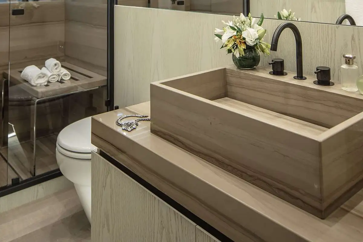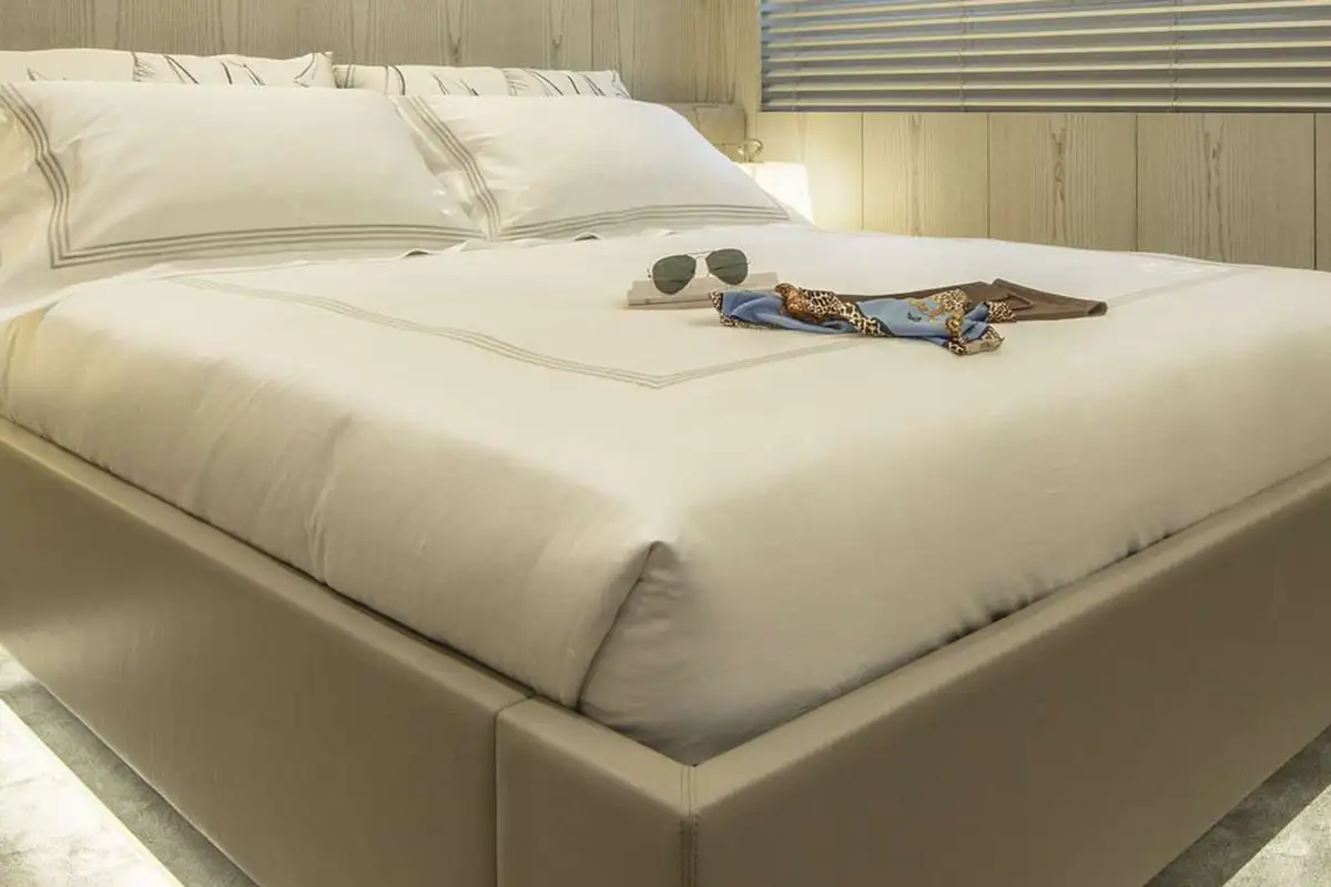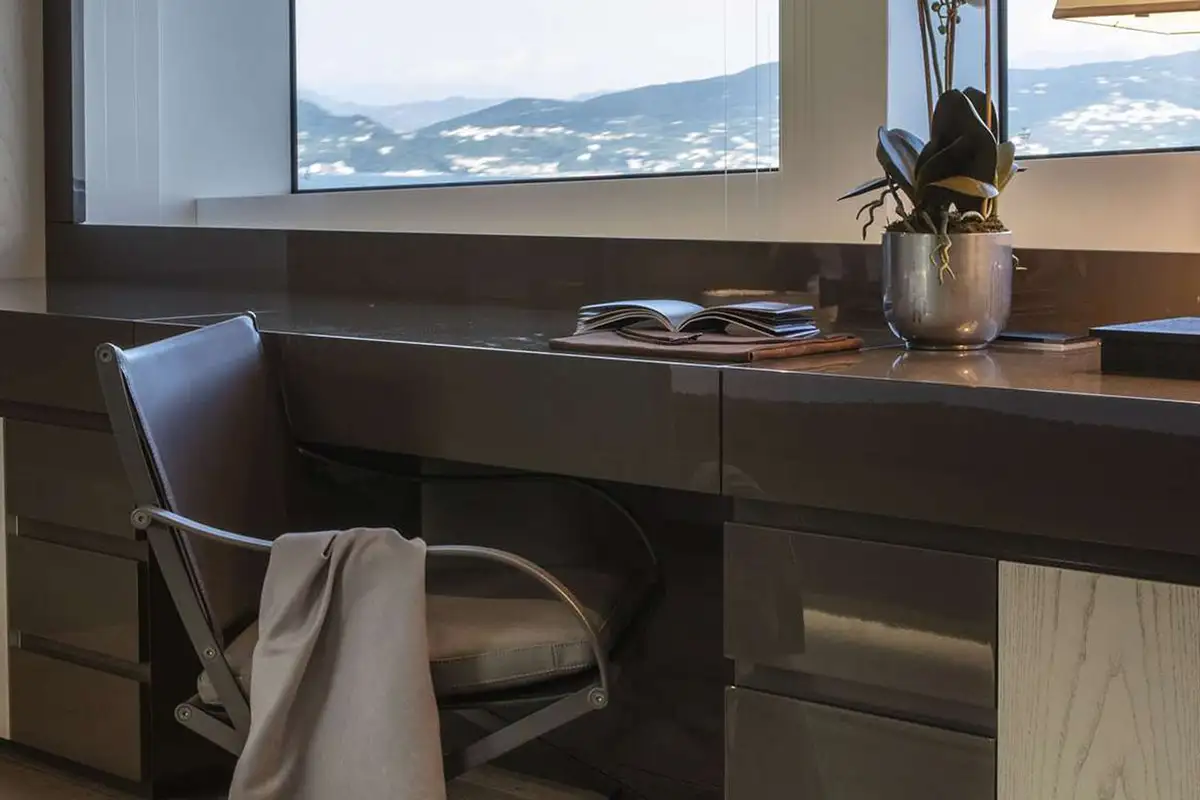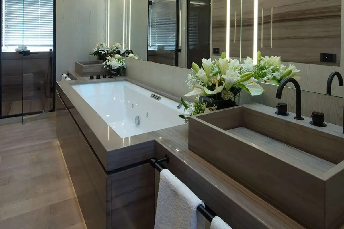 Your charter party will find five guest suites to sleep up to 12, each sumptuous with deep carpets and silky-soft bedding in neutral tones. You wake up in the chic master suite, open the blinds and sunlight streams through large picture windows. Take the time to step onto your own fold-down balcony and drink in views. Have a private breakfast here, suspended over the waves, or head to the upper deck to join your family and friends.