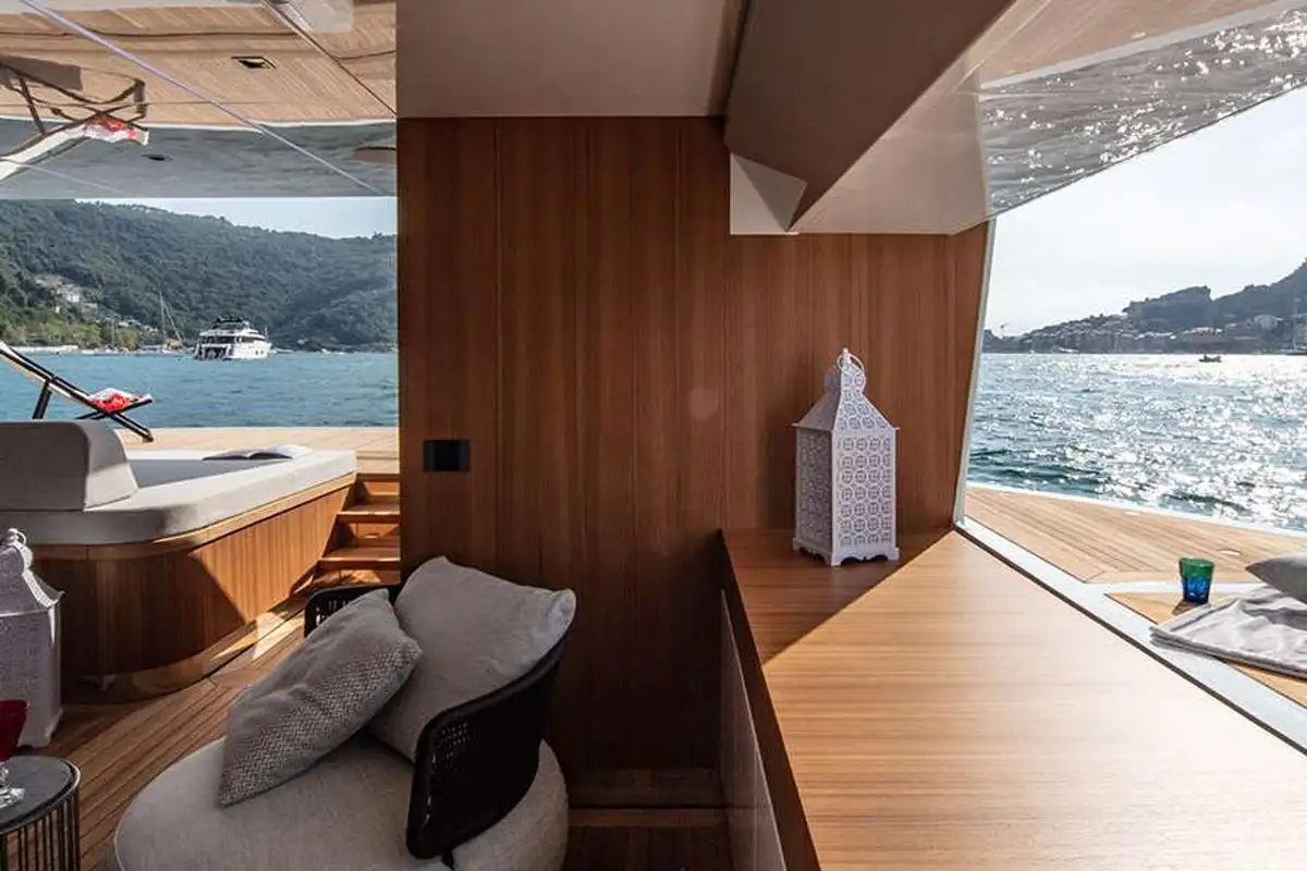 The crew have extended the beach club with fold-down wings lowered into place on each side. The club is light and airy as the breeze whispers from the sea through the open space. Off the full beam swimming platform, the children are diving into the inflatable anti-jellyfish pool tethered astern.