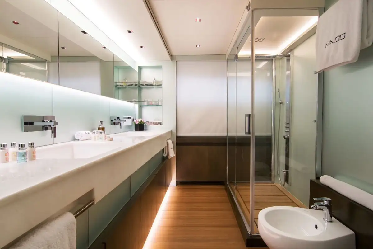 Inside the contemporary mix of dark wood, light fabrics and accent lighting create a sophisticated feel. MADO can take 11 guests in five cabins. The clean styling is carried through all the guest suites, from the master suite with queen-sized berth, office and large en suite bathroom on the main deck, to the three, double cabins and a twin-berth cabin with a pullman berth on the lower deck; all are tastefully styled for a luxury feel.