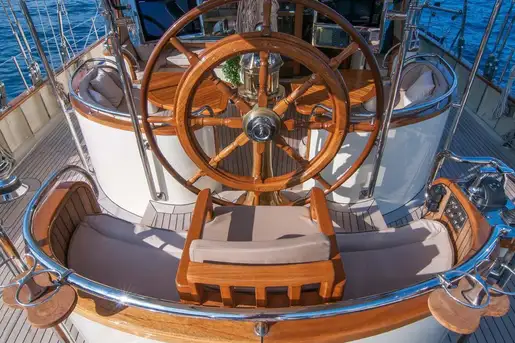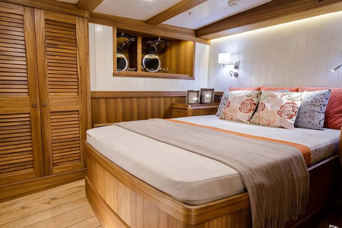 Her main deck is a vast expanse of traditional laid teak with vintage-style lantern skylights that send plenty of natural light down into the lower deck accommodation. There’s a secure and cosy passenger cockpit with ample shade, sunpad cushions on the bow, and a spacious deckhouse amidships with big windows all round. When she’s anchored for the day, guests can enjoy a huge amount of open-air living space on deck with a big canvas awning rigged above for shade.