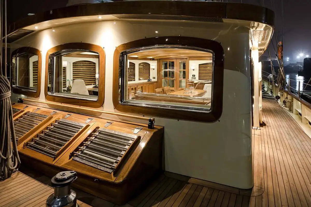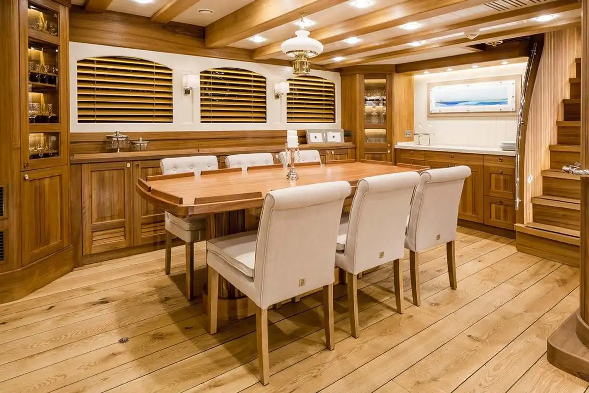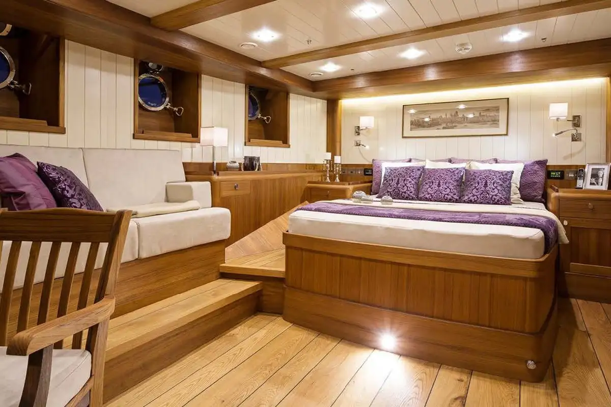 Inside the deckhouse is the guests’ main living room with seating and chairs around a table and great views out all round. Steps lead down from here to the lower deck and into the large, elegant dining room. There’s a VIP double cabin forward of the dining room. The crew’s quarters in the bow have a different entrance from the main deck to preserve guests’ privacy.