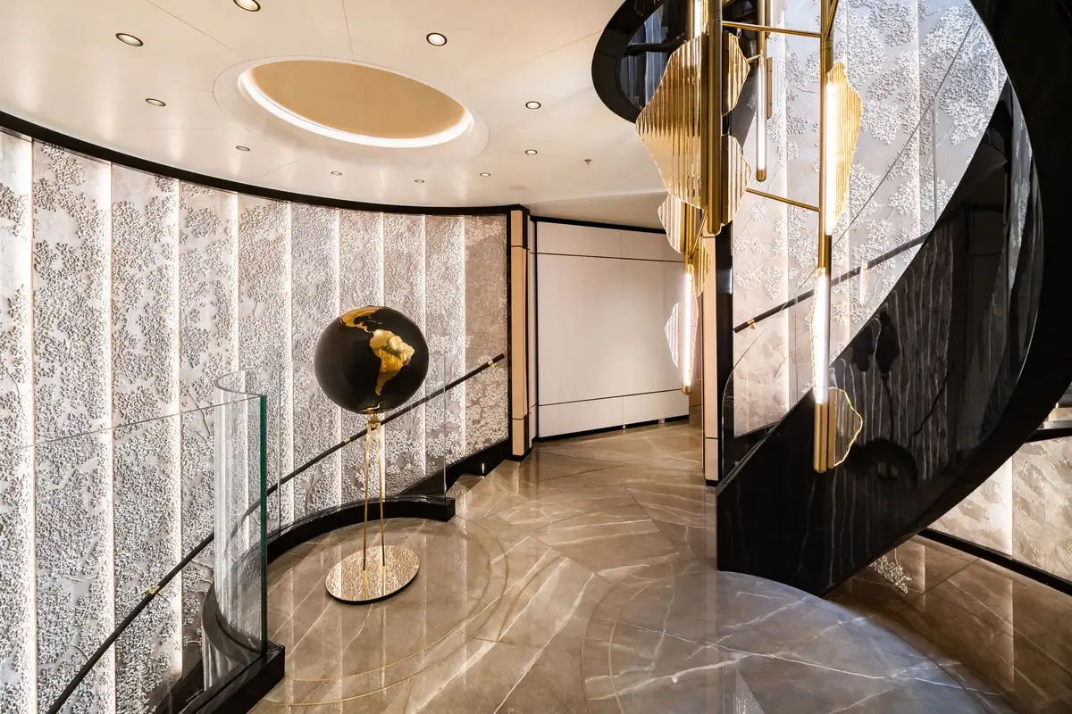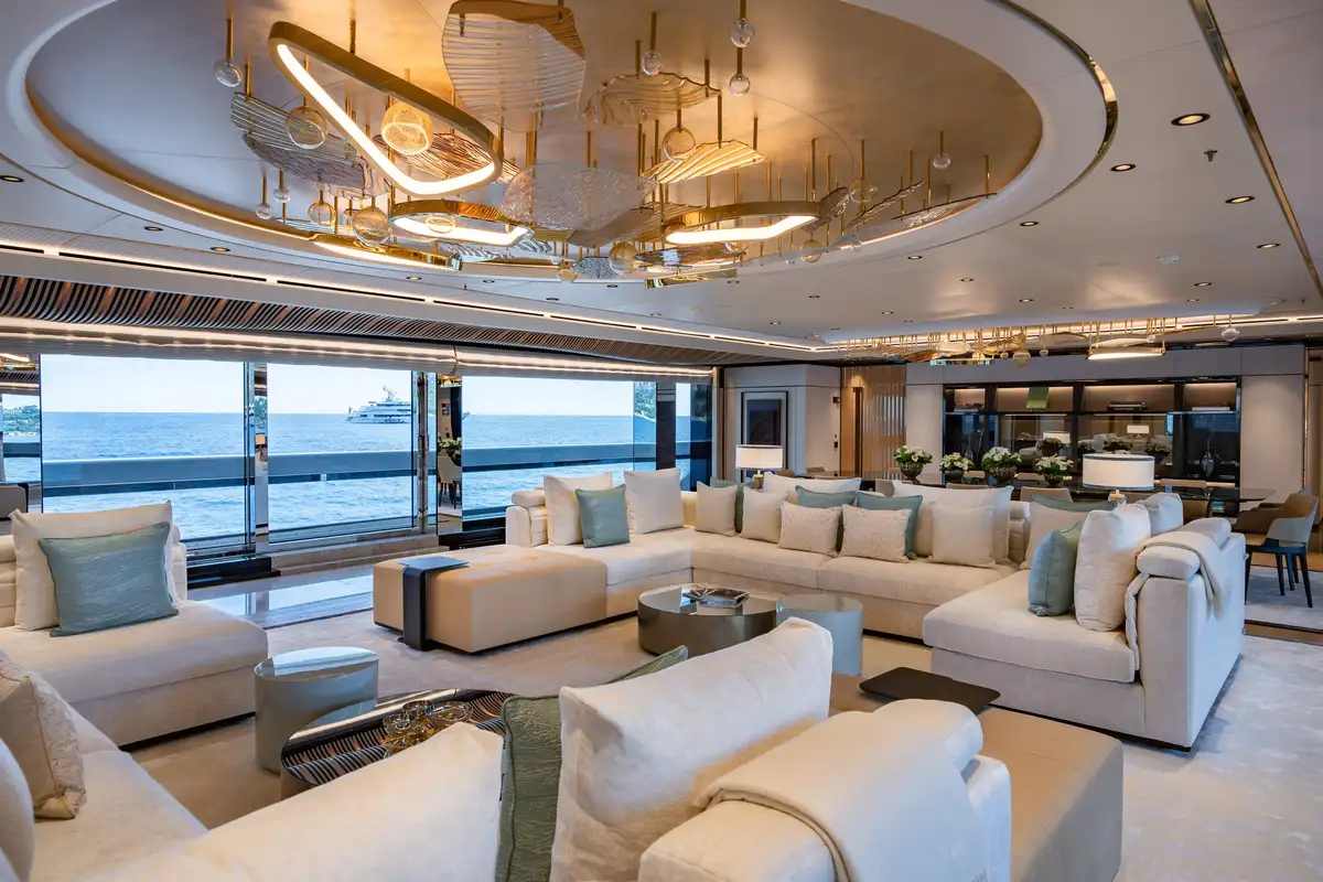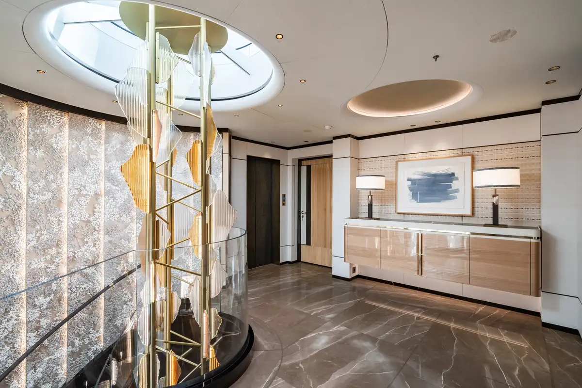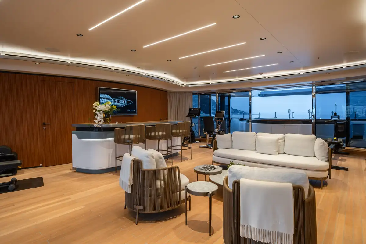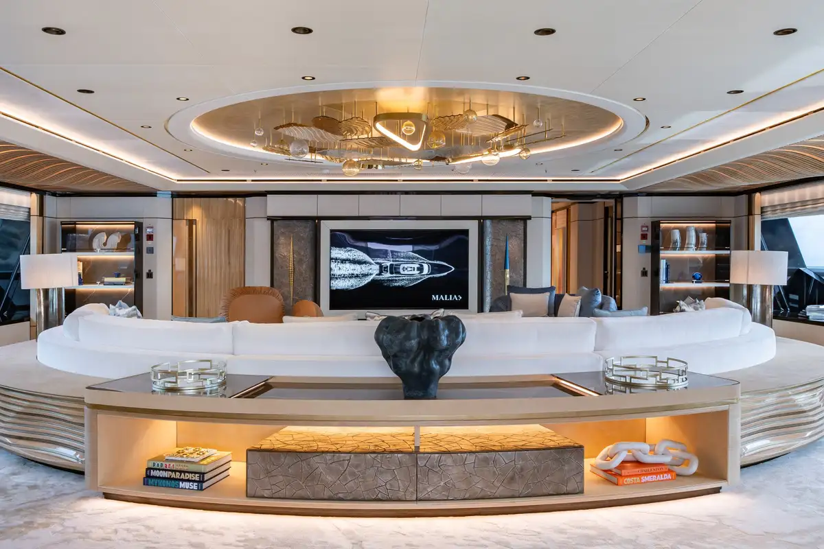 Her interior is furnished with luxurious materials, featuring over 250 different finishes, exotic woods, and precious stones, all crafted to perfection. From the sculptural illuminated waves overhead in the main and upper saloons to the chandeliers that cascade through the decks, entwined by the spiral staircase, every inch of MALIA is designed to impress.