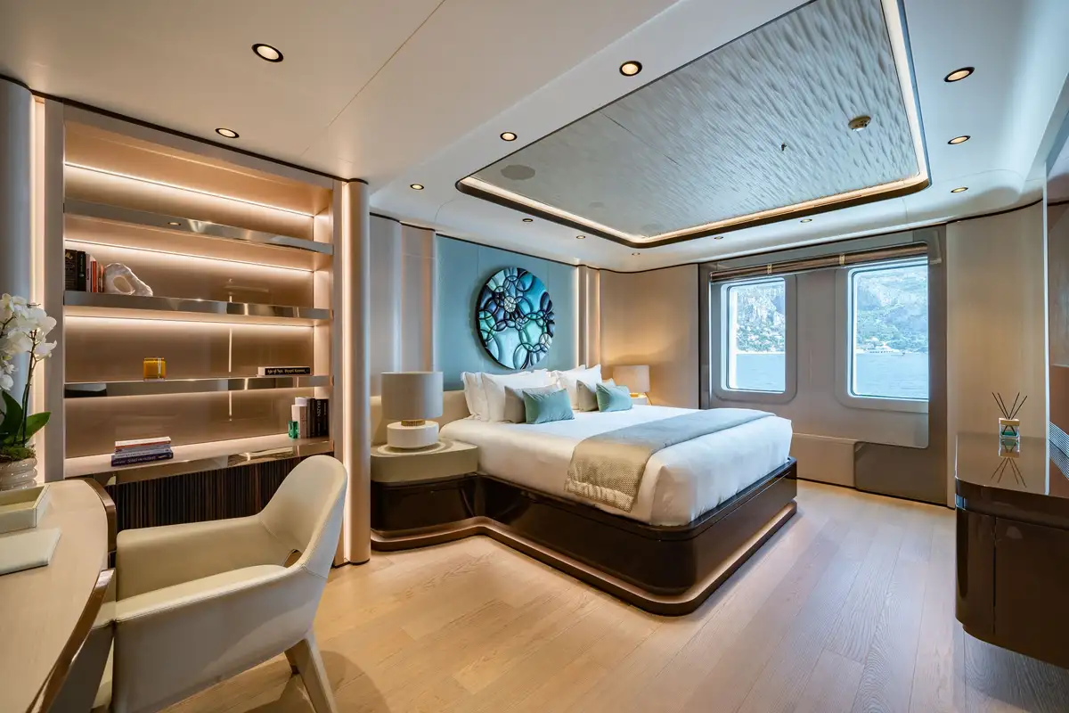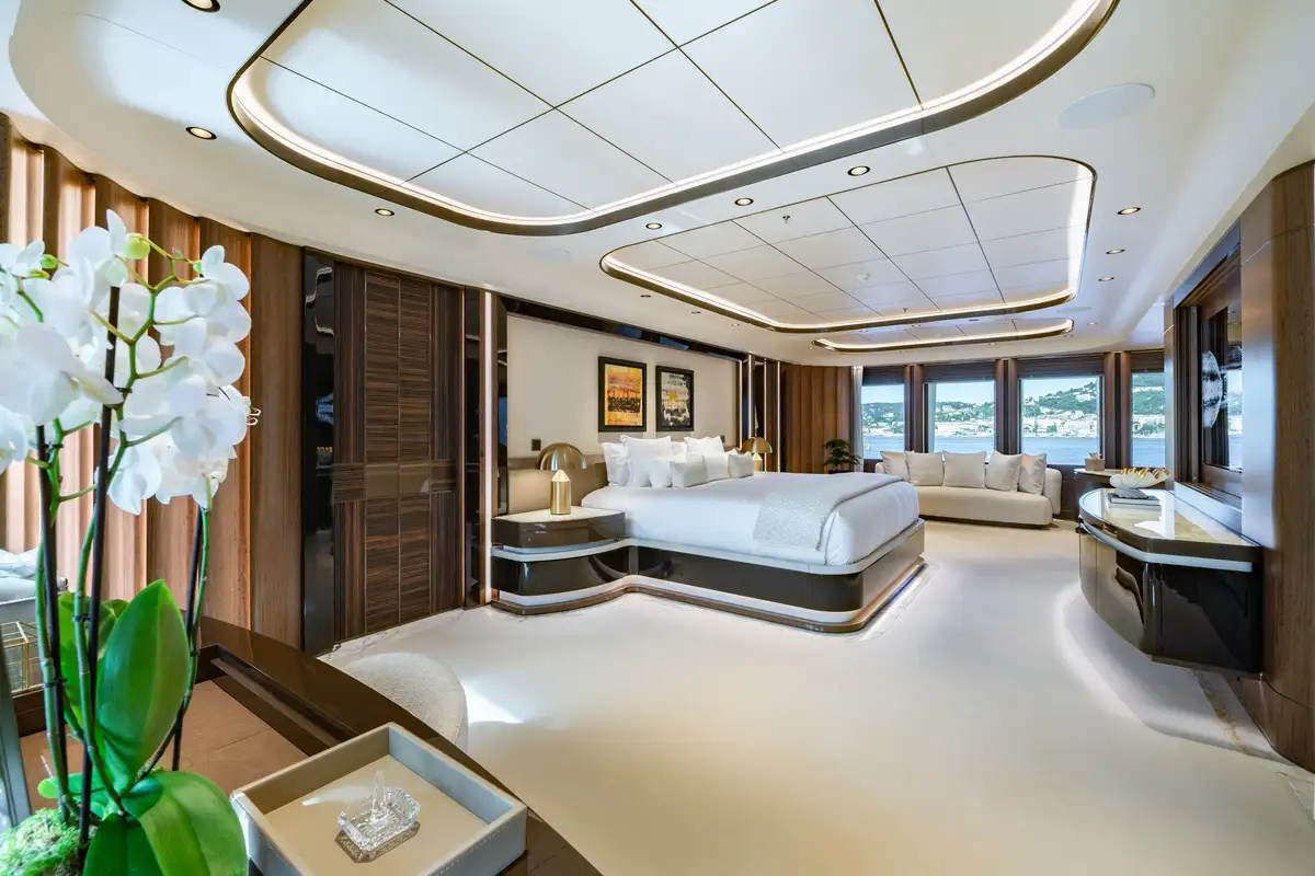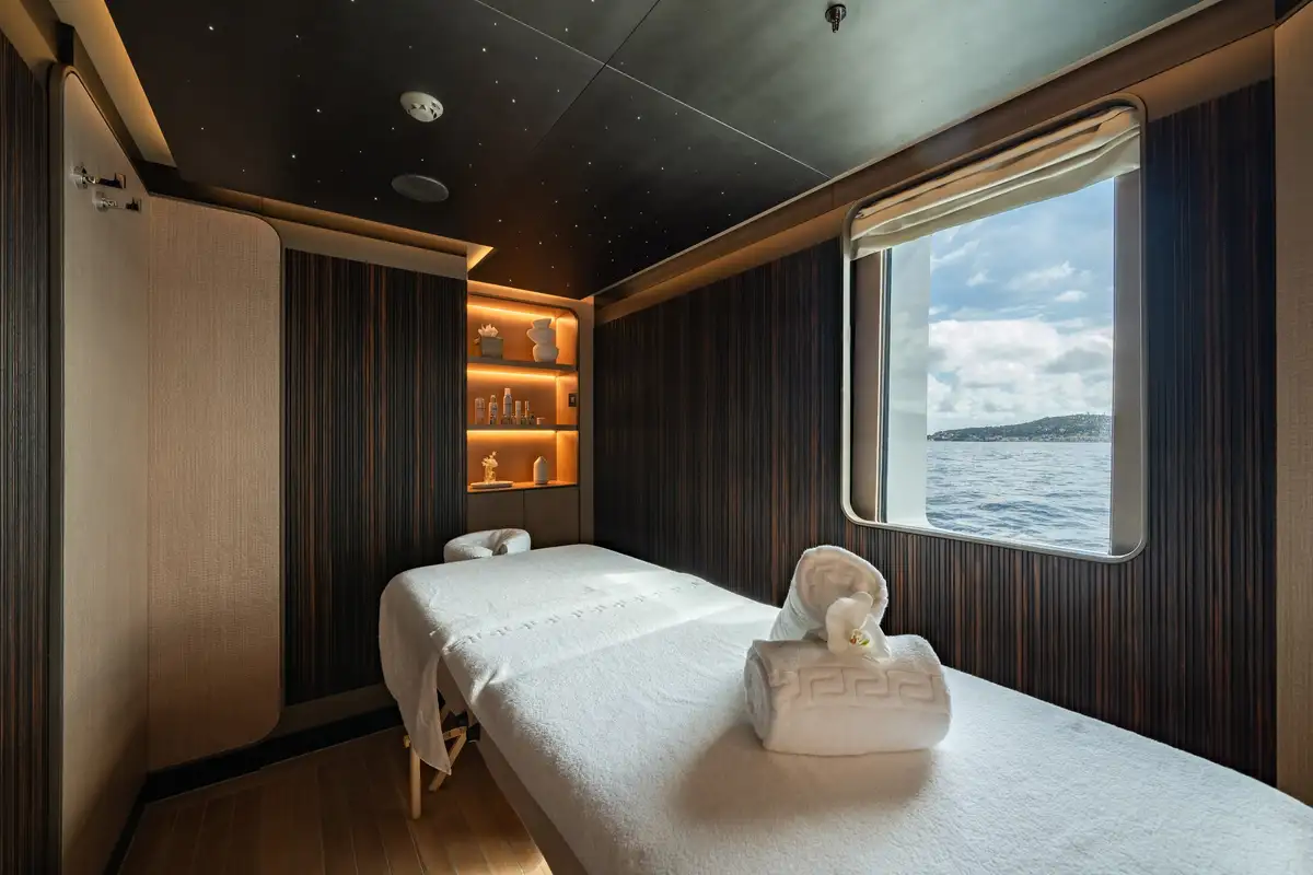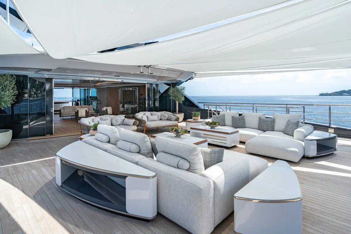Given the yacht's emphasis on styling and visual impact, you can be assured that the guest spaces have been meticulously planned to offer you the very best onboard experiences. From the poolside on the main deck to the sumptuous sun deck with a bar, al fresco lounge area, and jacuzzi, and not to forget the full-beam beach house on the lower deck that opens out onto the vast swim platform. On both sides, fold-down sea terraces extend this area, allowing for sea-level views and a warm breeze to pass through this magnificent space. It's furnished with sofa seating, a wet bar, and ample deck space for sun loungers and relaxation. Hidden from view are the hammam, sauna, and massage suite.