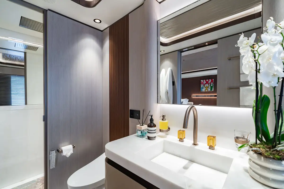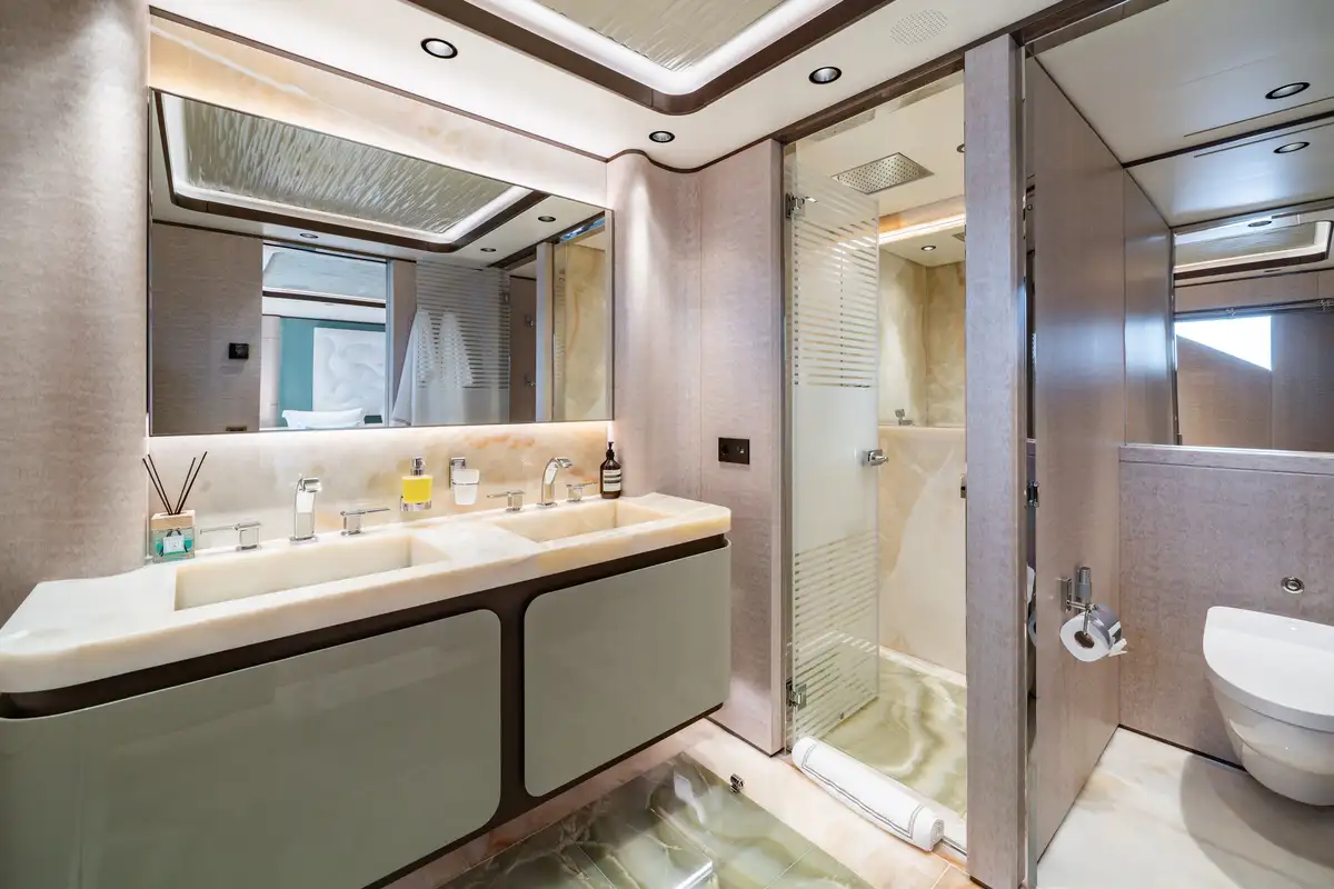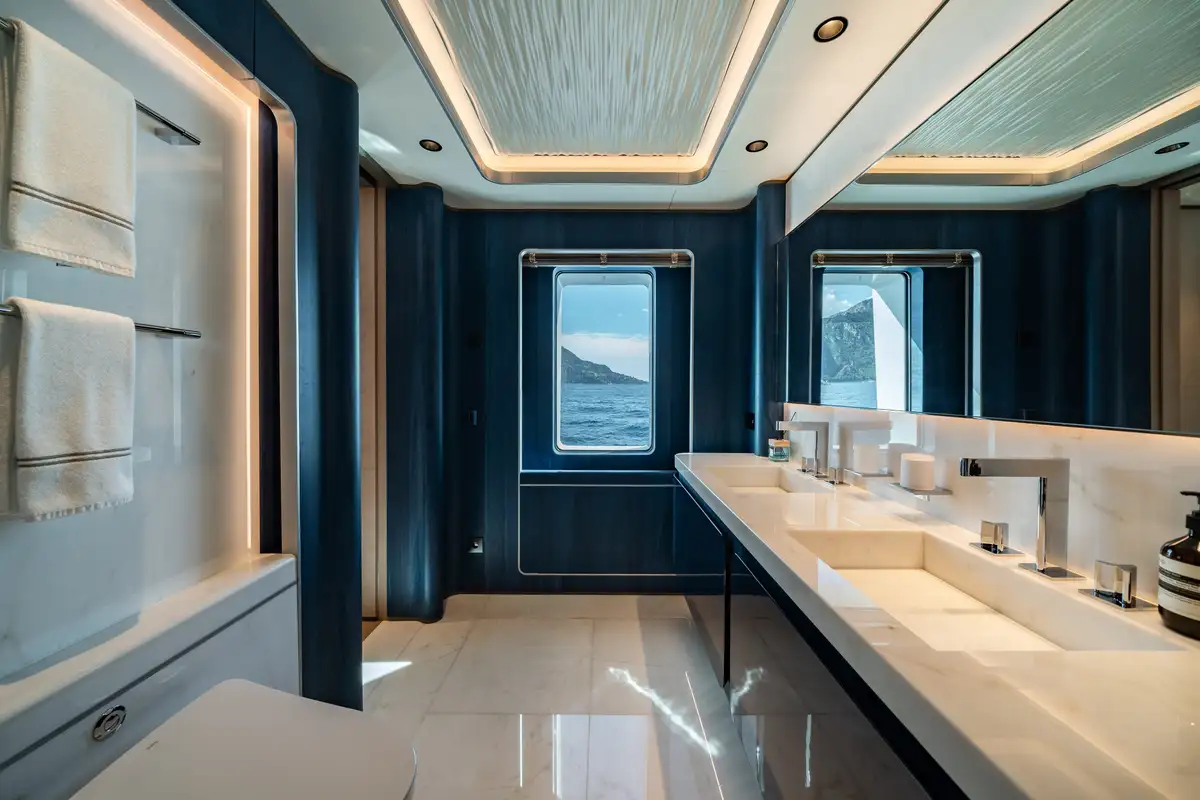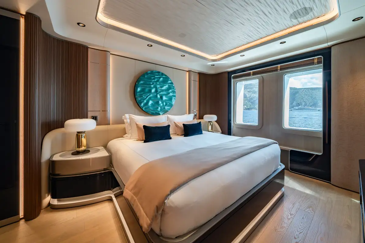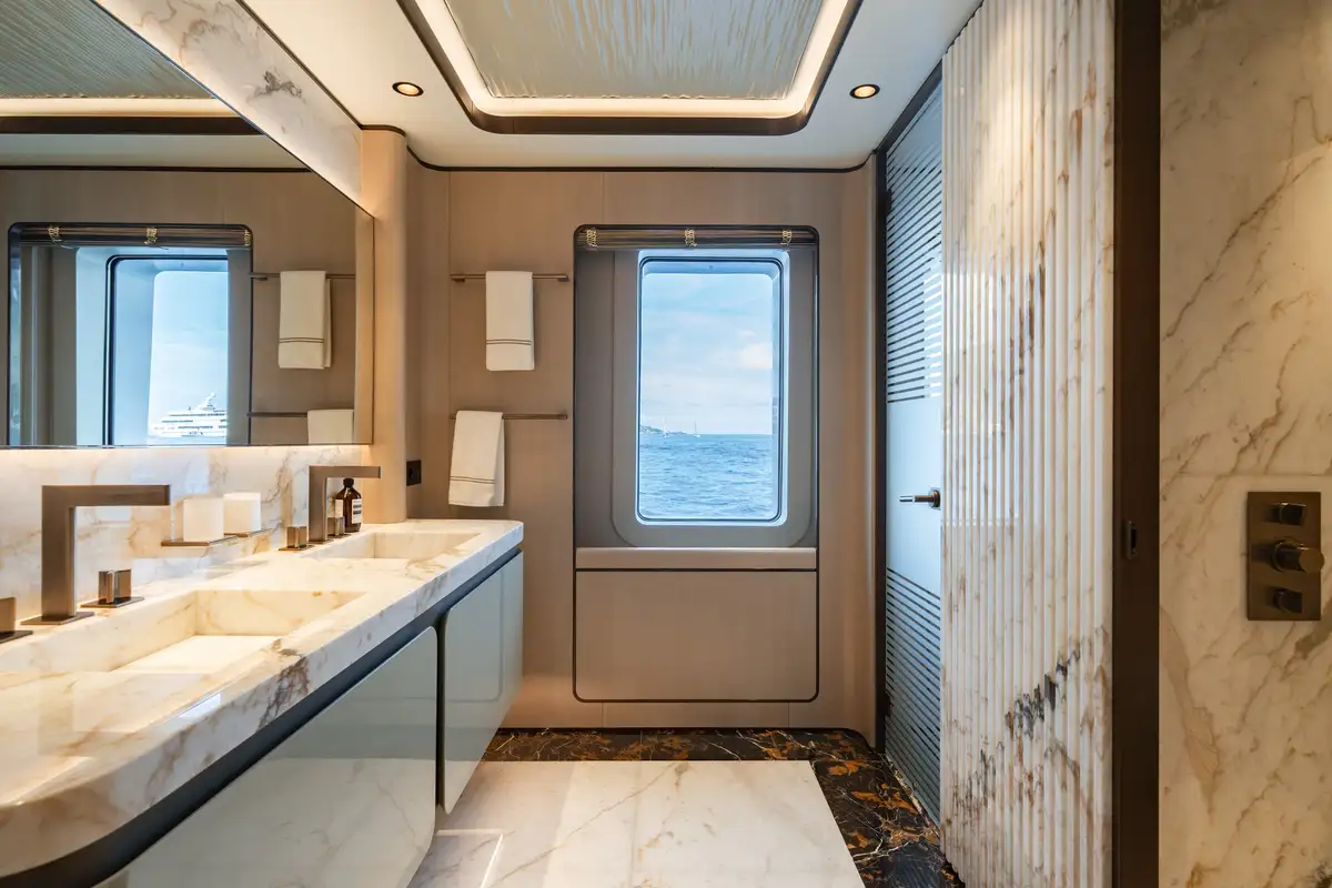 Given the yacht's emphasis on styling and visual impact, you can be assured that the guest spaces have been meticulously planned to offer you the very best onboard experiences. From the poolside on the main deck to the sumptuous sun deck with a bar, al fresco lounge area, and jacuzzi, and not to forget the full-beam beach house on the lower deck that opens out onto the vast swim platform. On both sides, fold-down sea terraces extend this area, allowing for sea-level views and a warm breeze to pass through this magnificent space. It's furnished with sofa seating, a wet bar, and ample deck space for sun loungers and relaxation. Hidden from view are the hammam, sauna, and massage suite.