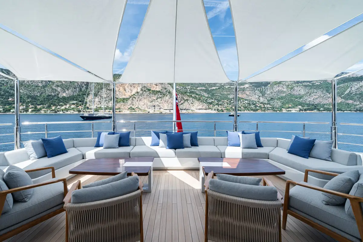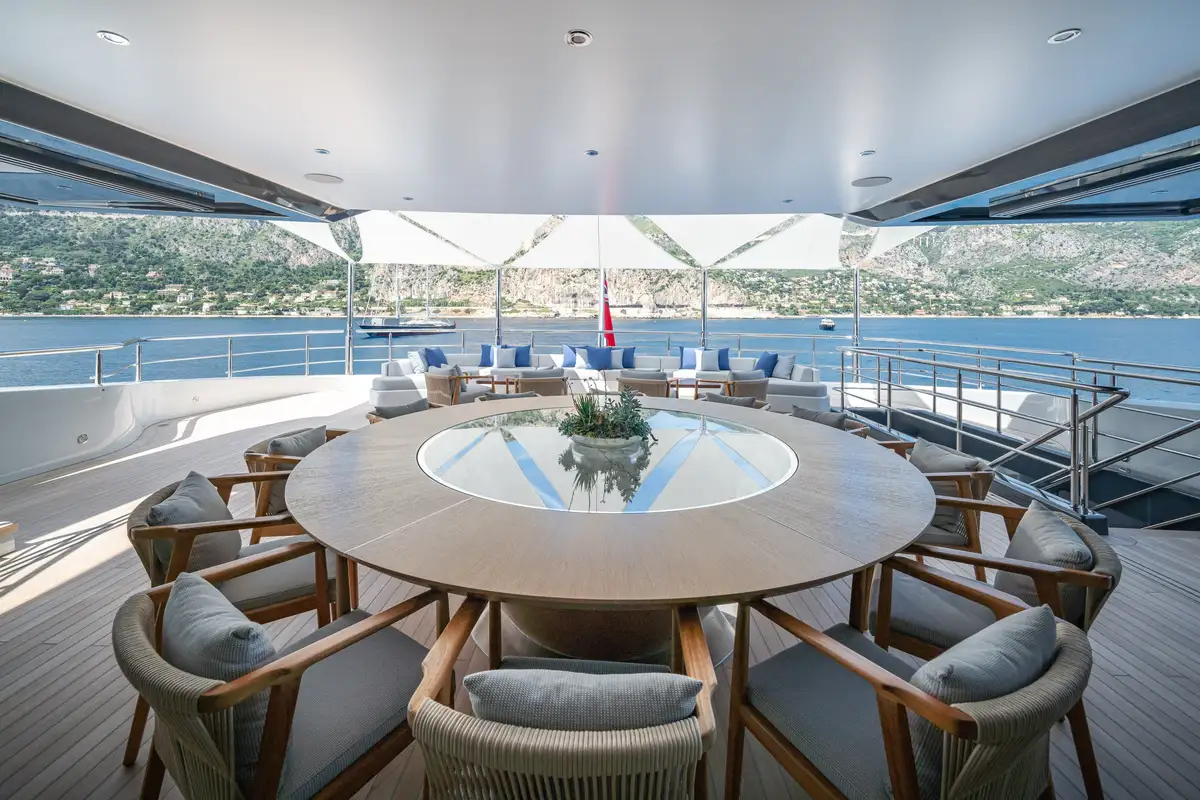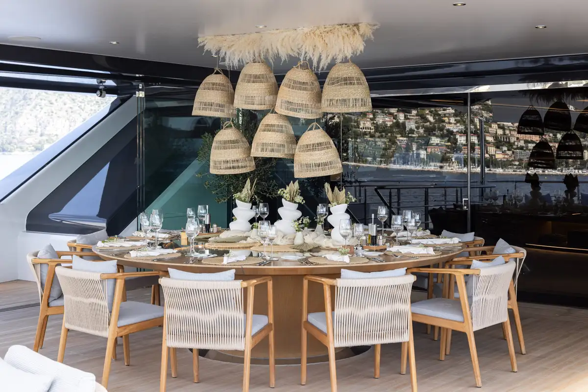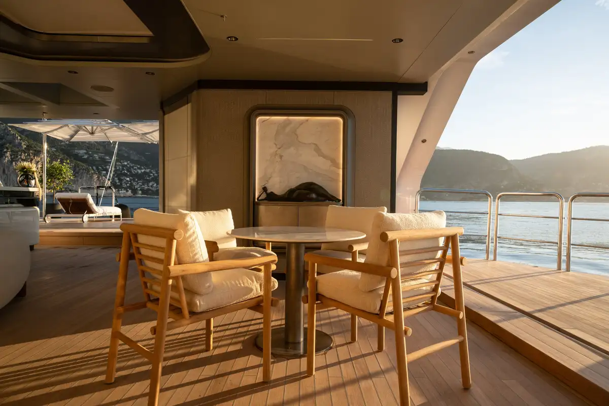 When the time comes to bid goodnight, you can retire to your full-beam master suite, secure in the knowledge that your guests will be equally enthralled by their own suites. There are six double suites and two twin-berth cabins. In the morning, you can draw back the curtains of your picture windows and be greeted by the breathtaking surroundings. But then comes the decision: where will you enjoy your breakfast on this magnificent yacht?