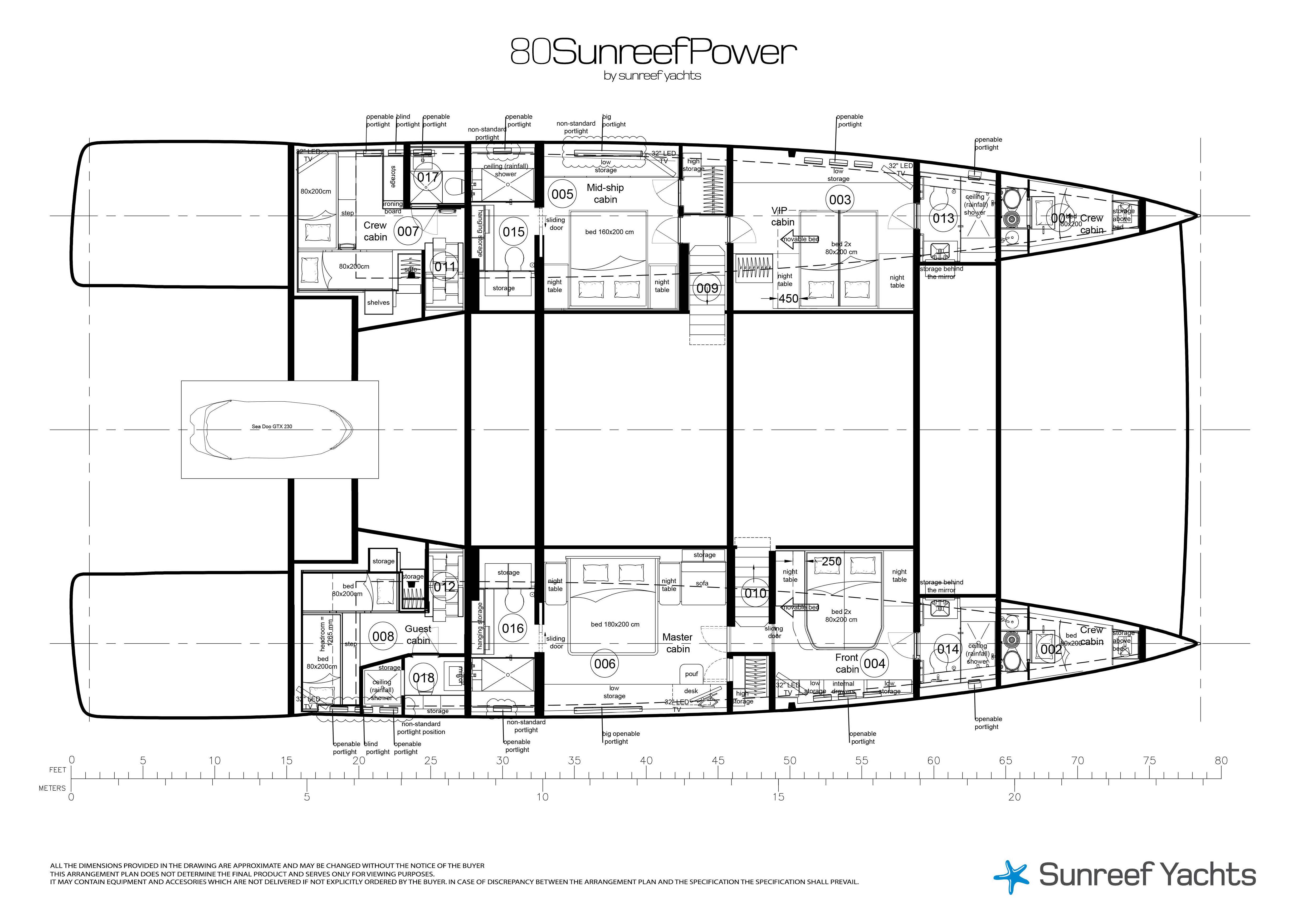 Descending into the lower deck, she accommodates up to eight guests in complete comfort, with a full-beam master suite, a VIP cabin, and two convertible double cabins.