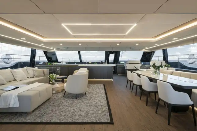 As you step into the interior space from the main deck aft, you'll be greeted by a generous main deck lounge. An interior concept defined by soft, neutral tones, ambient lighting, and custom finishes, it comes complete with a formal dining area, a fully equipped galley with premium appliances, and a lounging space with wraparound views and designer furnishings. Whether it's a luxurious dinner you're after, or a cosy movie night indoors, you can fully embrace the experience in this expansive space.